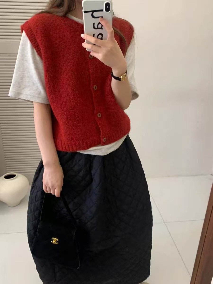 한국식 레트로 라운드 넥 니트 조끼 여성 봄과 가을 새로운 쌓인 외부 민소매 싱글 브레스트 스웨터 웨이스트 코트