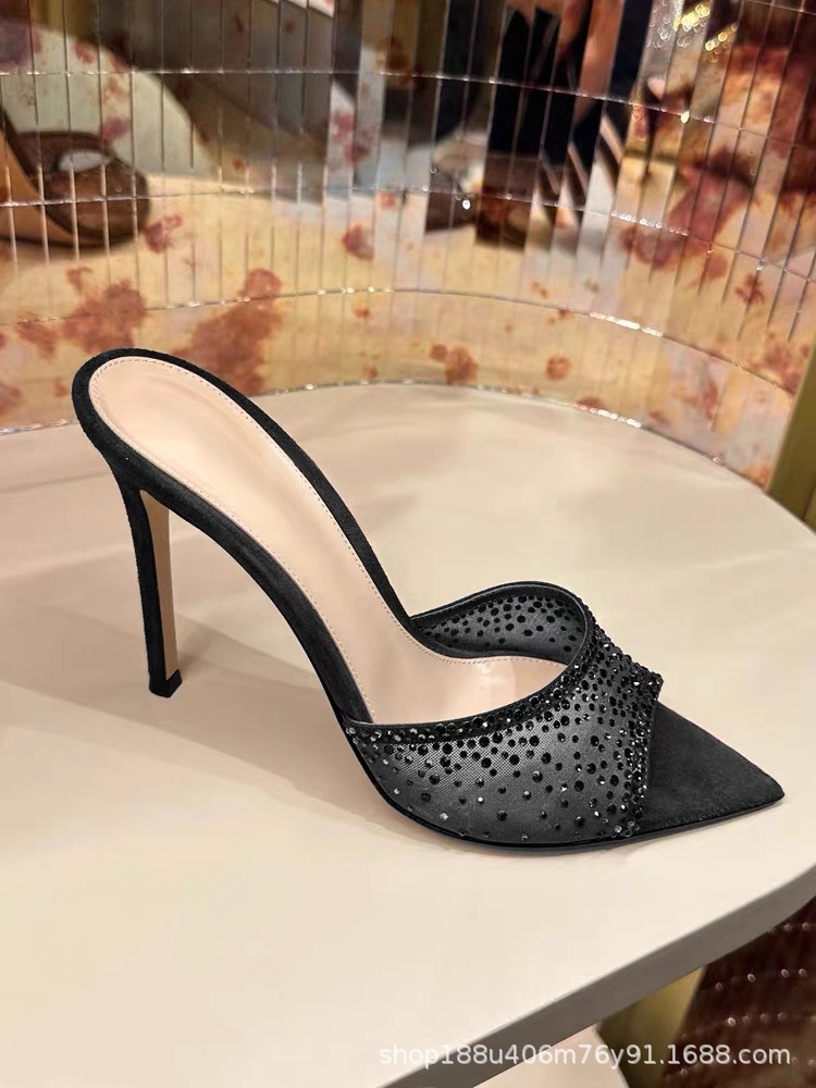 【재고 있음】여성용 라인스톤 샌들 2025 여름 신상 메쉬 소재 요정풍 원스트랩 샌들 슬리퍼 오픈토 하이힐