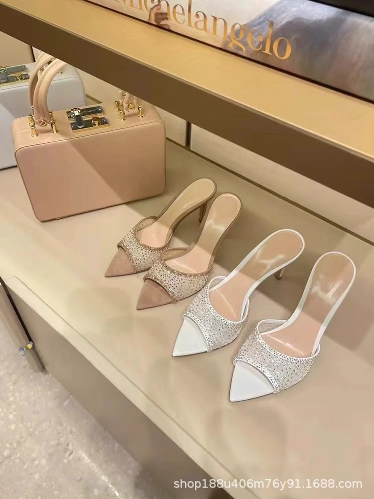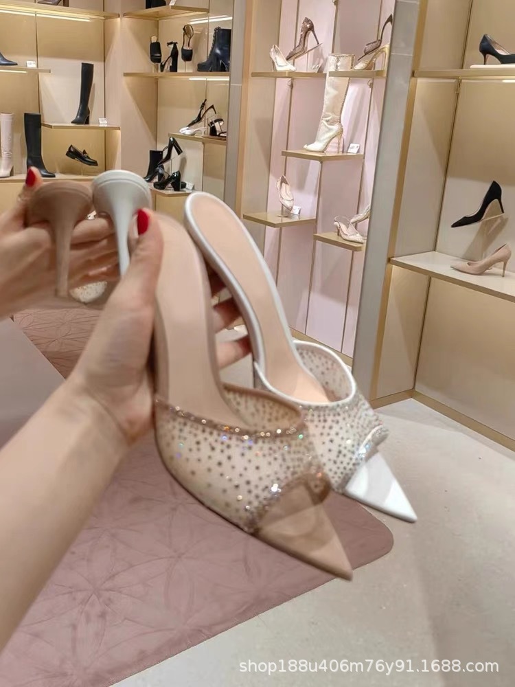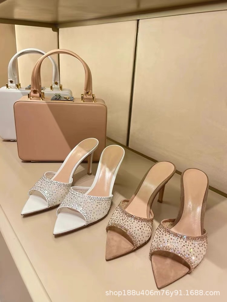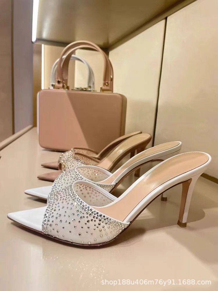 【재고 있음】여성용 라인스톤 샌들 2025 여름 신상 메쉬 소재 요정풍 원스트랩 샌들 슬리퍼 오픈토 하이힐스토어 가기