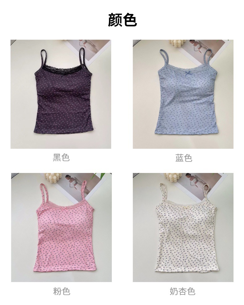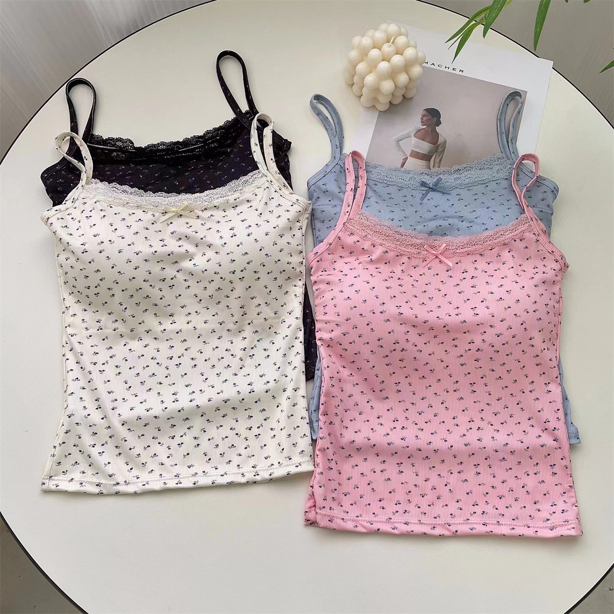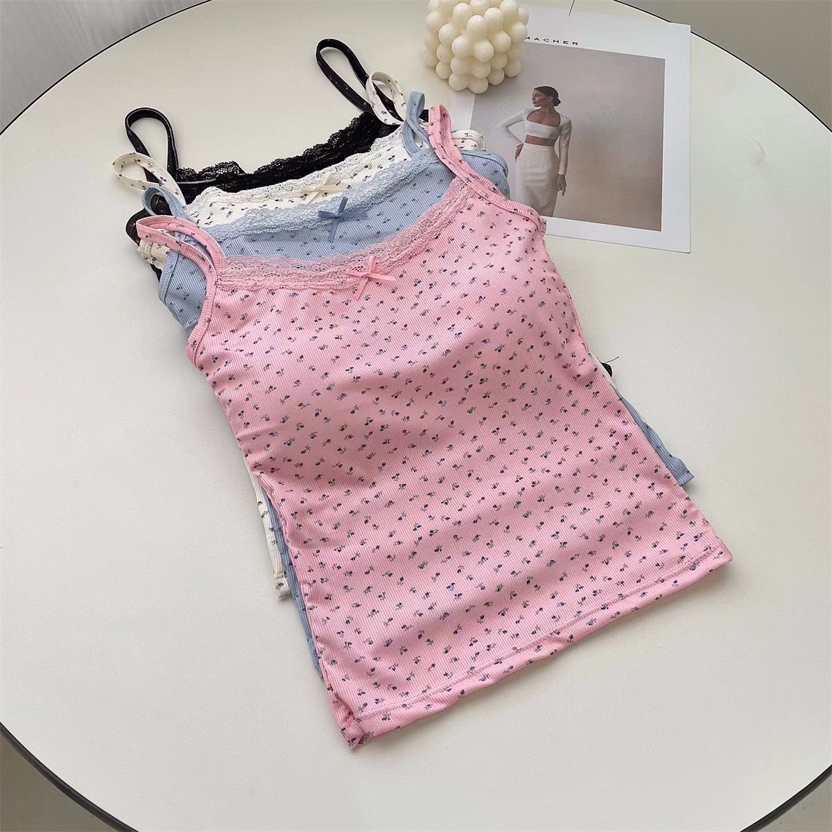 여성을 위한 크로스보더 직접 판매 인기 아이스 실크 꽃무늬 레이스 보우 캐미솔, 달콤하고 다재다능하며 작은 가슴 슬리밍 아우터웨어