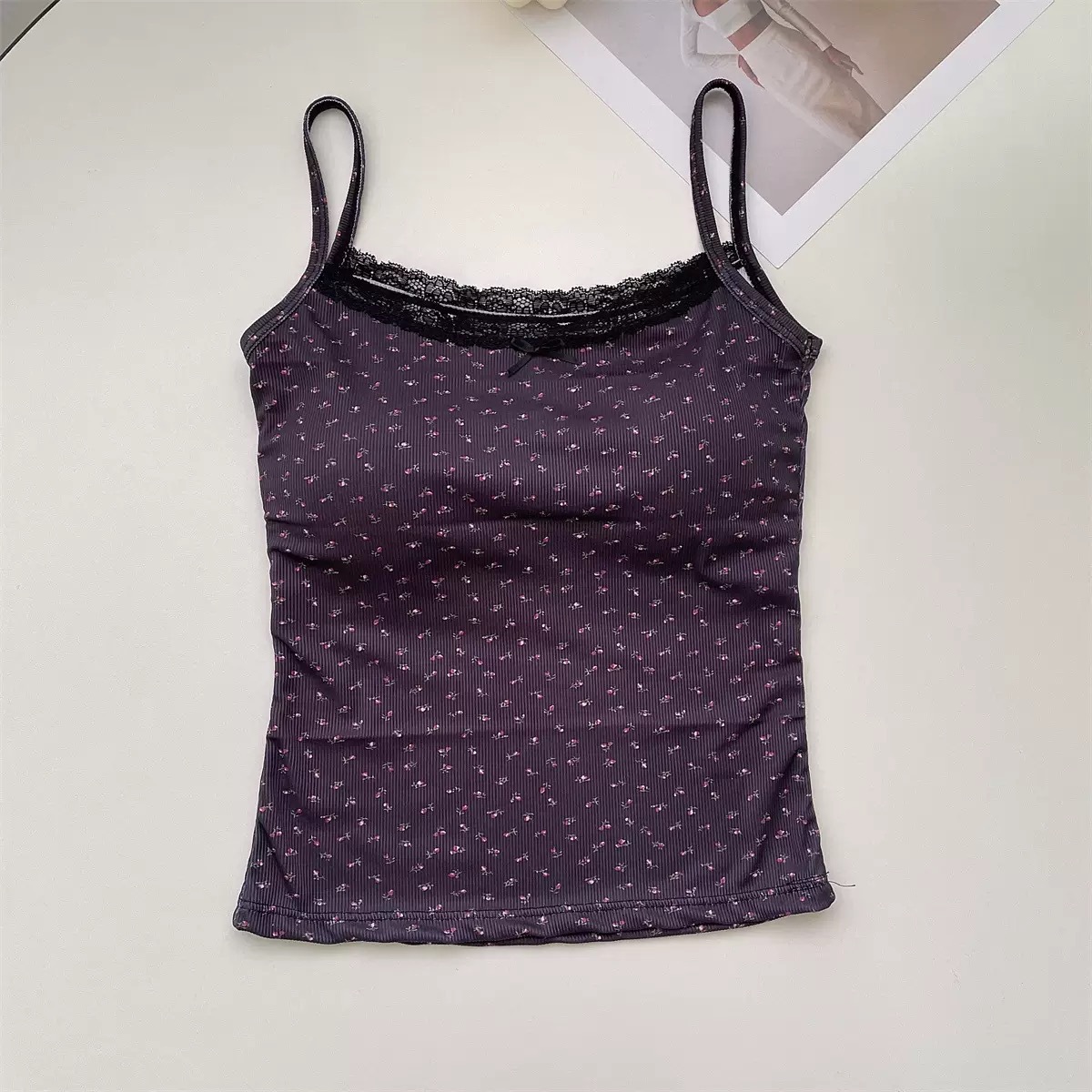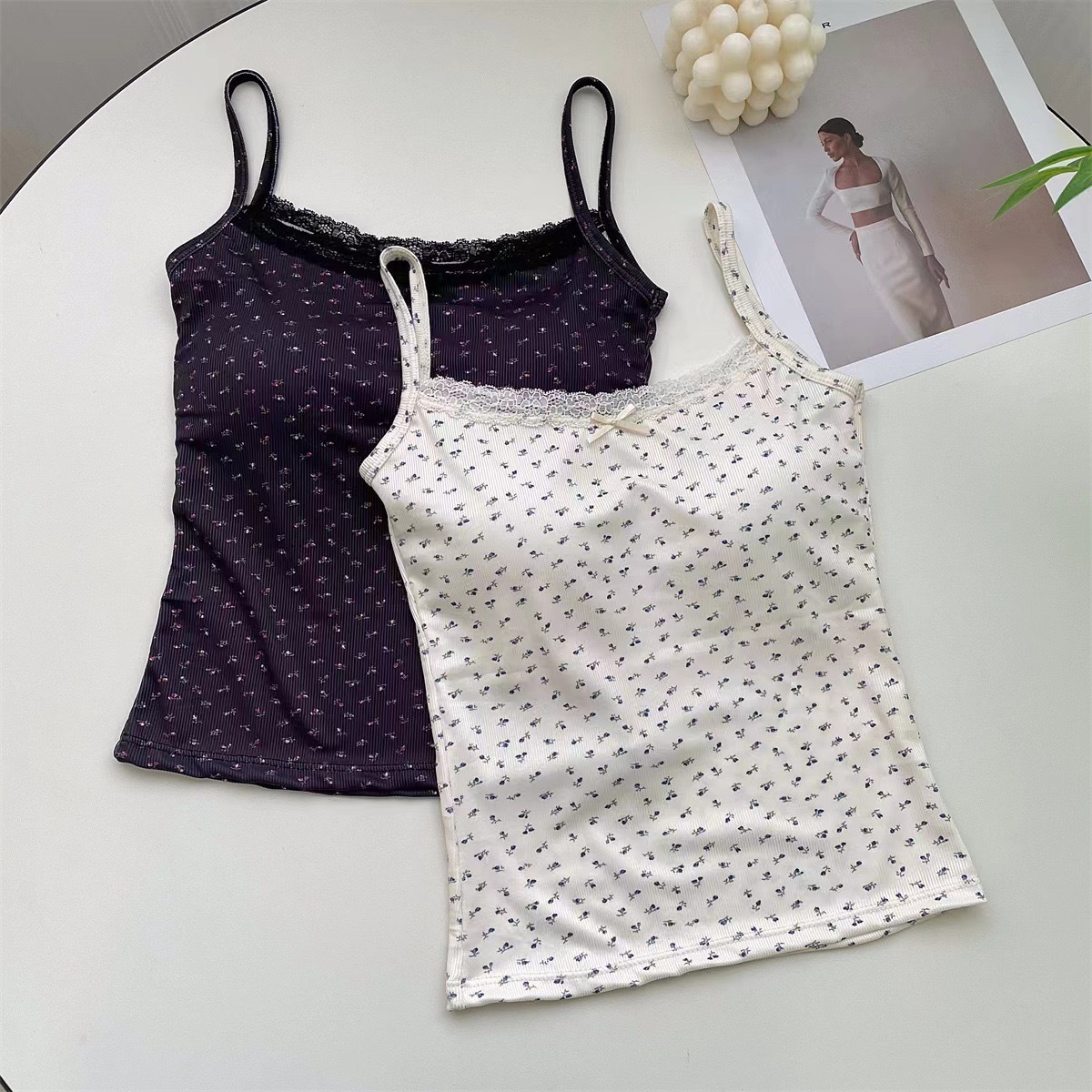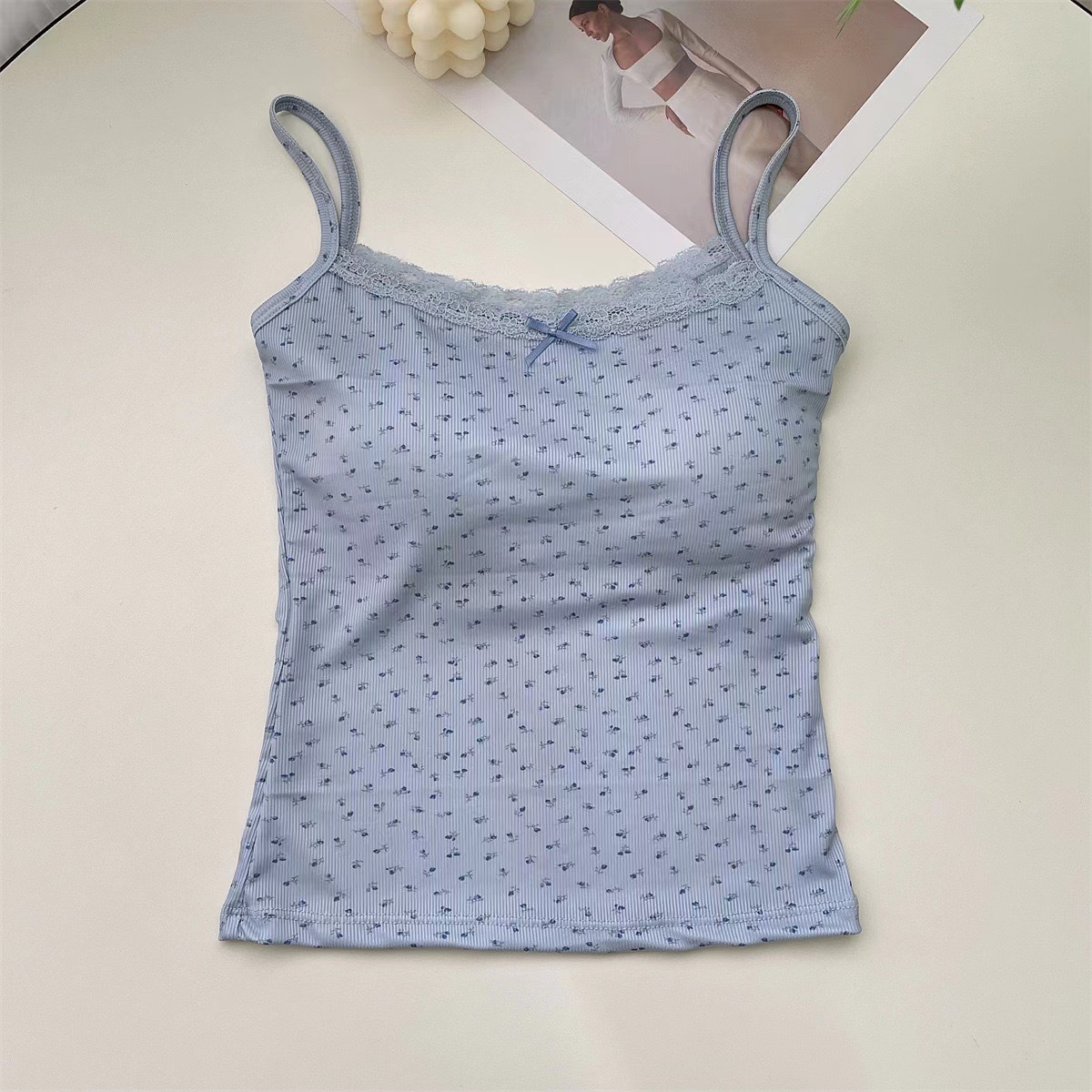 여성을 위한 크로스보더 직접 판매 인기 아이스 실크 꽃무늬 레이스 보우 캐미솔, 달콤하고 다재다능하며 작은 가슴 슬리밍 아우터웨어