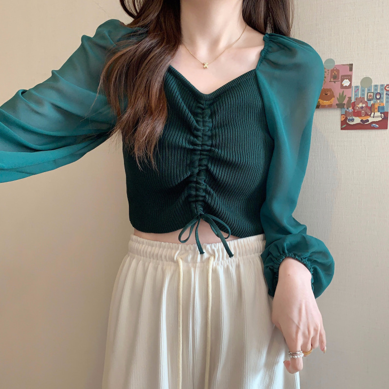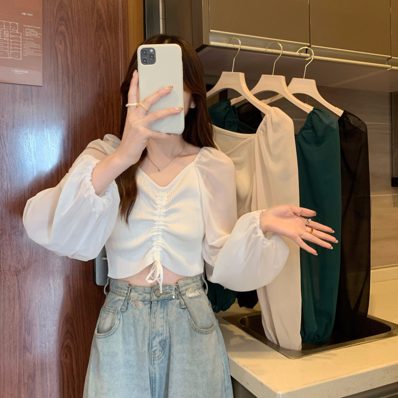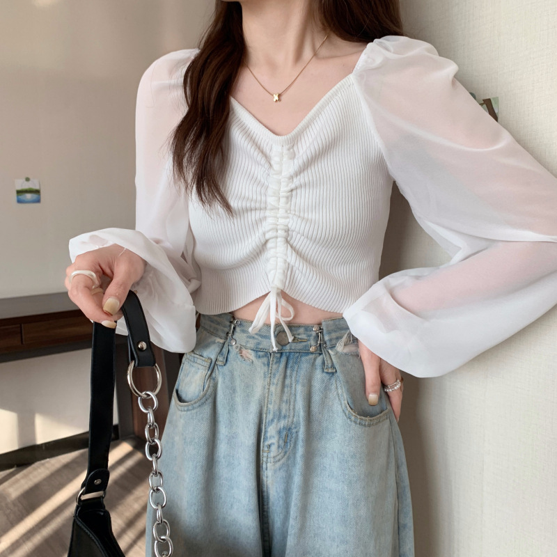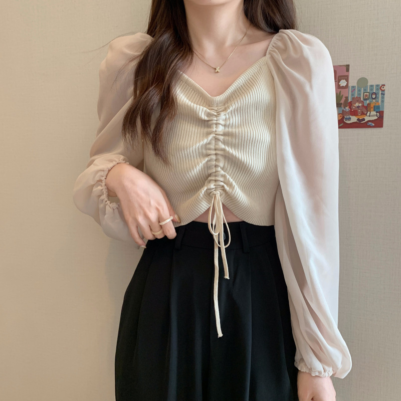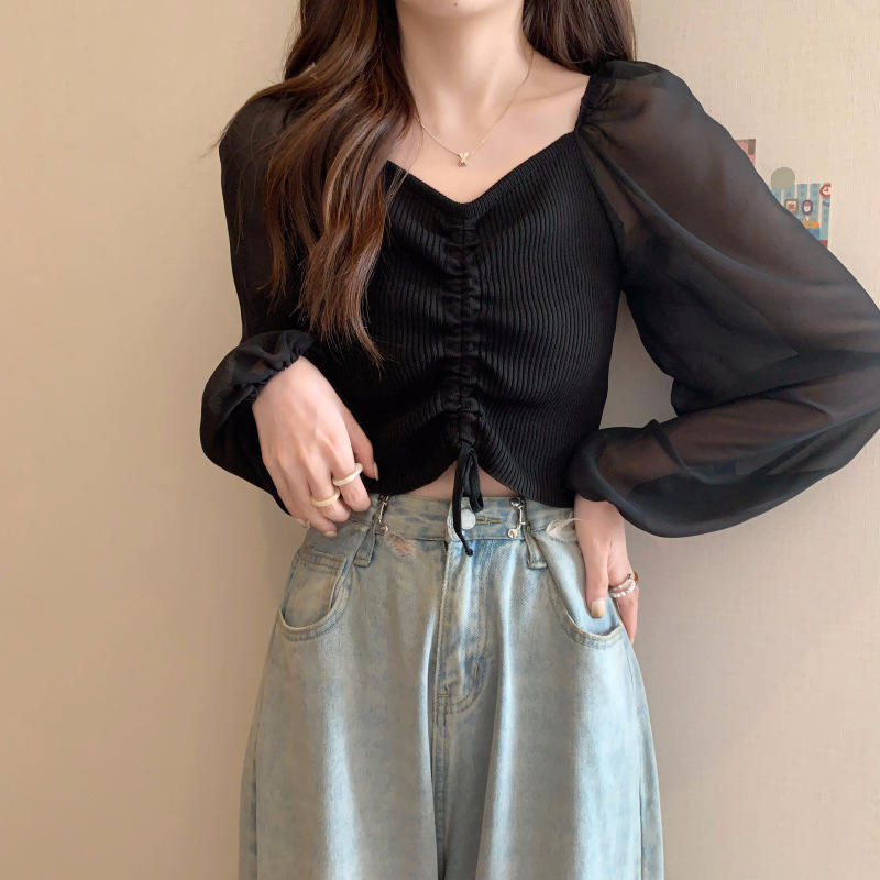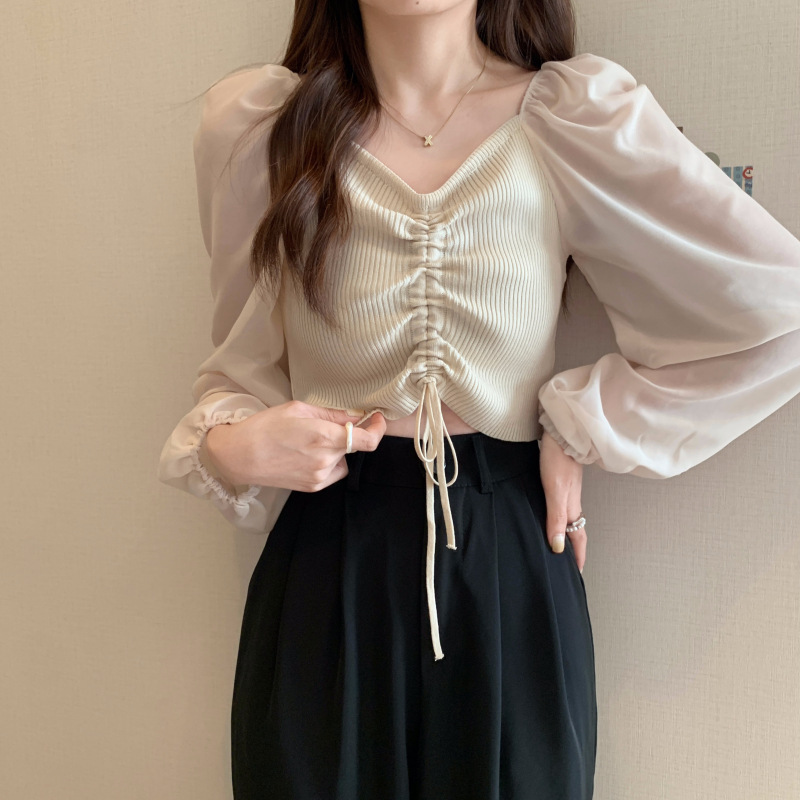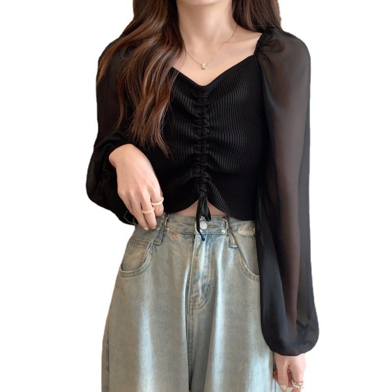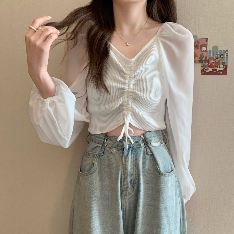 Bubble Sleeve Drawstring 니트 스웨터 2025 이른 봄 프랑스 스타일 배꼽 노출 된 외국 스타일 V 넥 짧은 쇄골 노출 시폰 탑스토어 가기