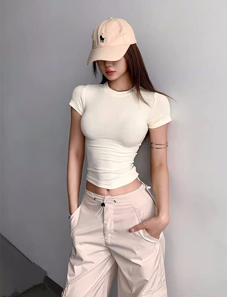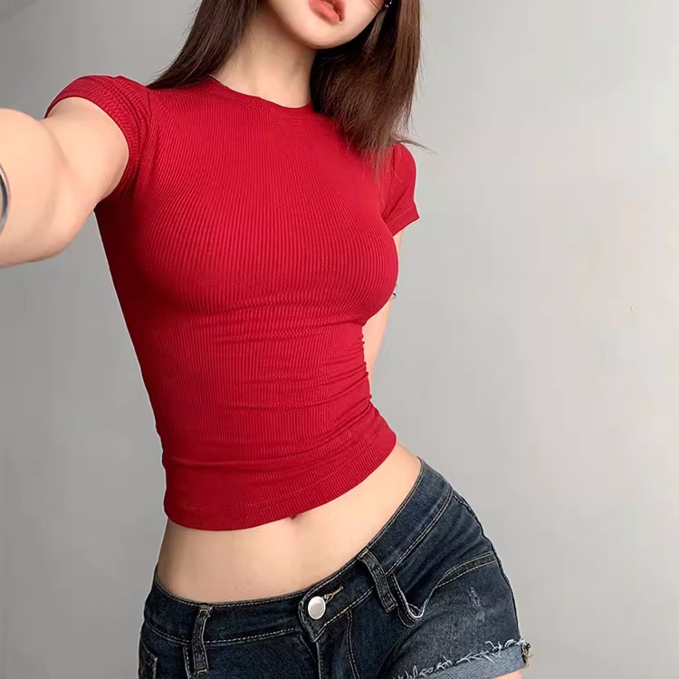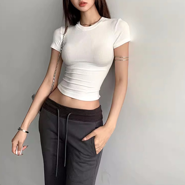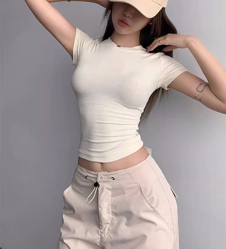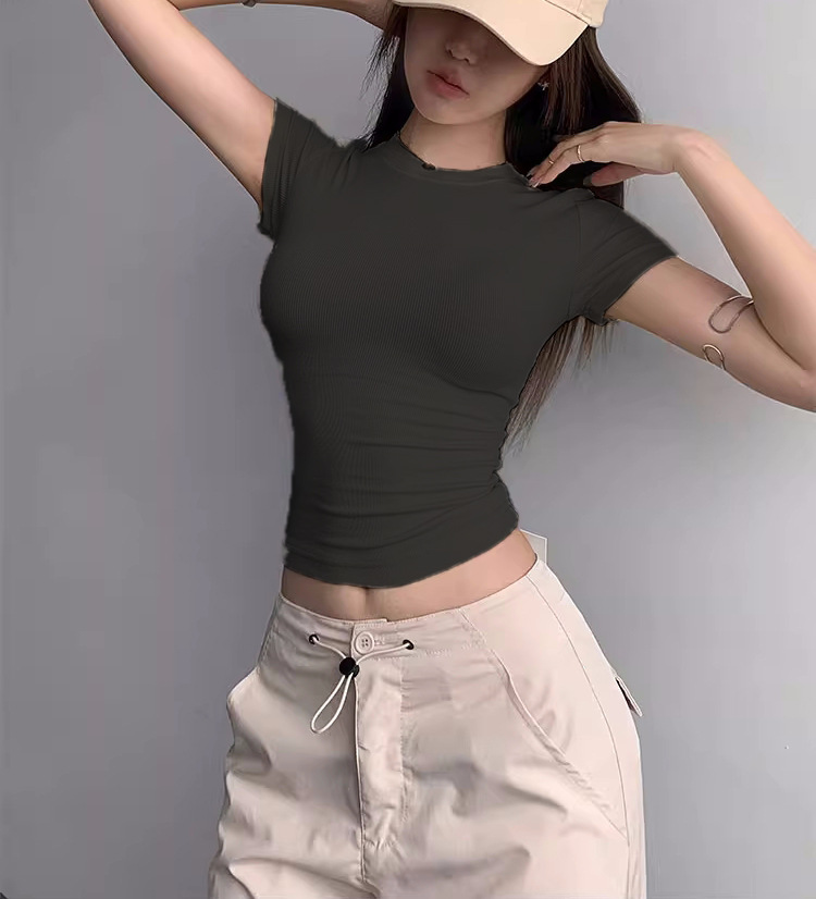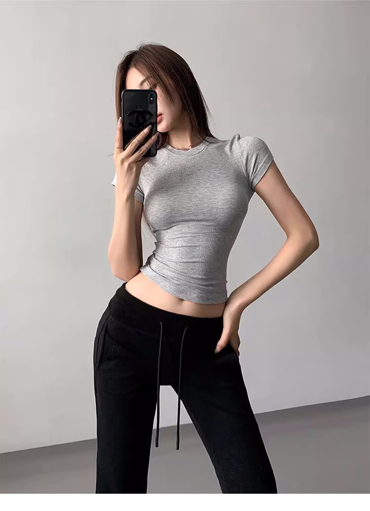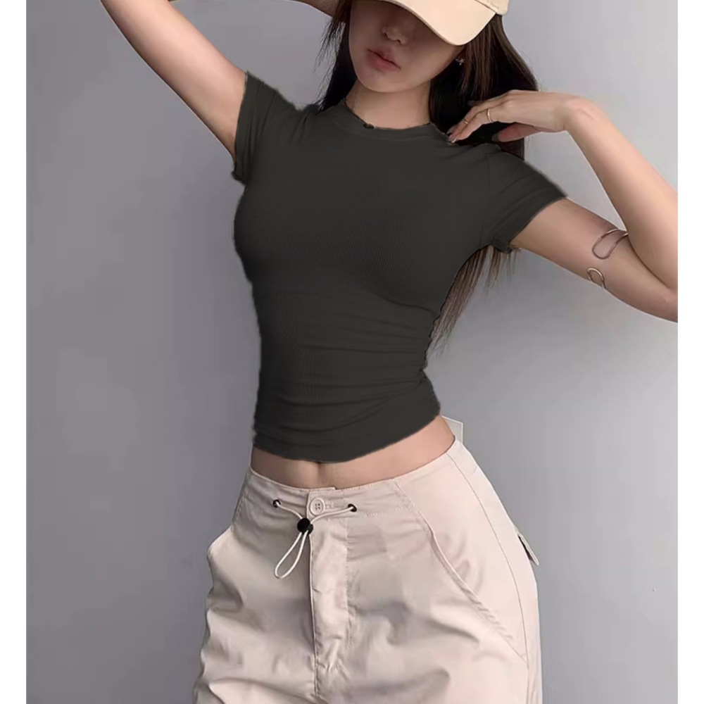Kardashian 반팔 여성 기본 Bottoming Thread 스포츠 티셔츠 섹시한 슬림 핏 라운드 넥 솔리드 컬러 캐주얼 티셔츠 1433스토어 가기