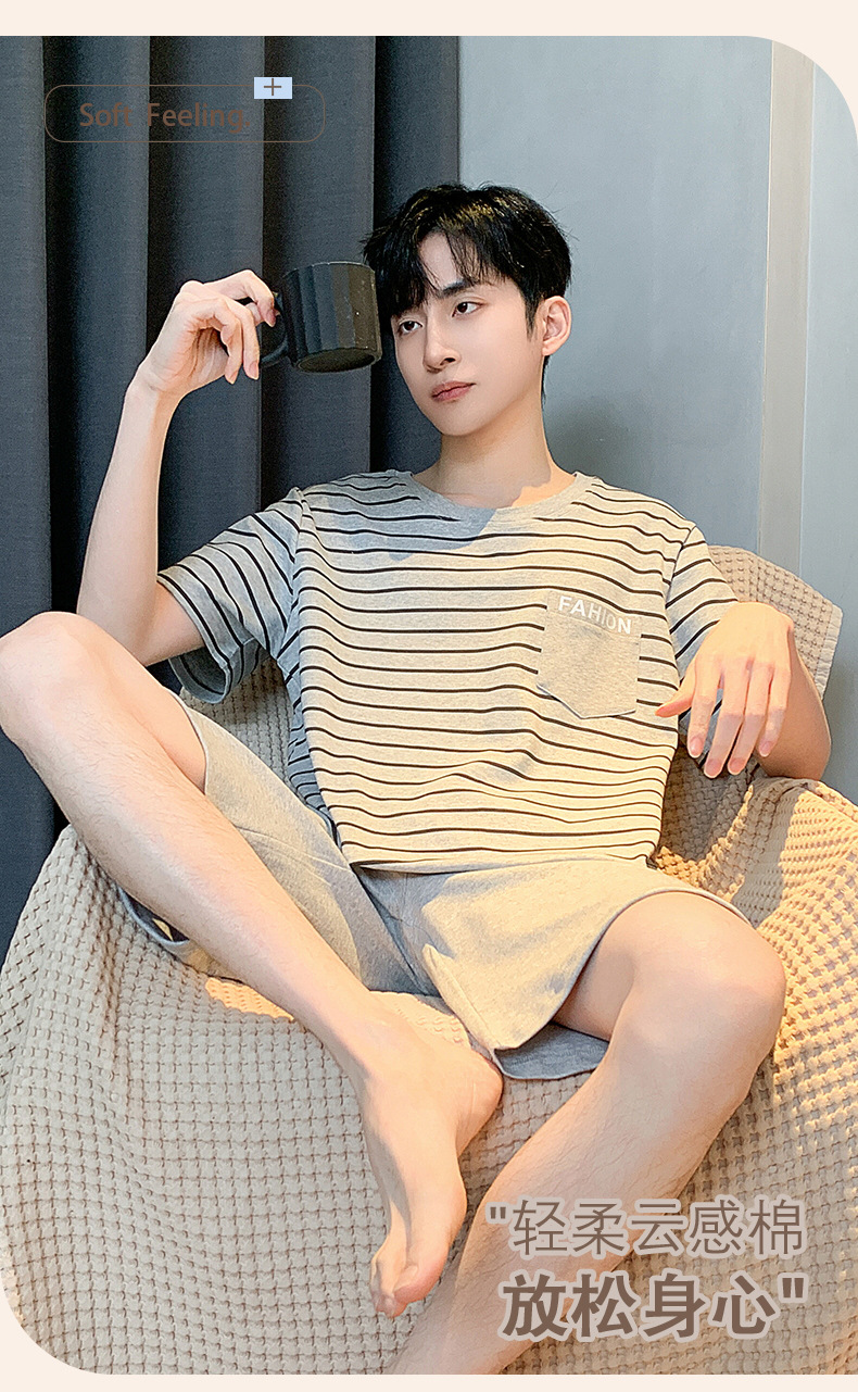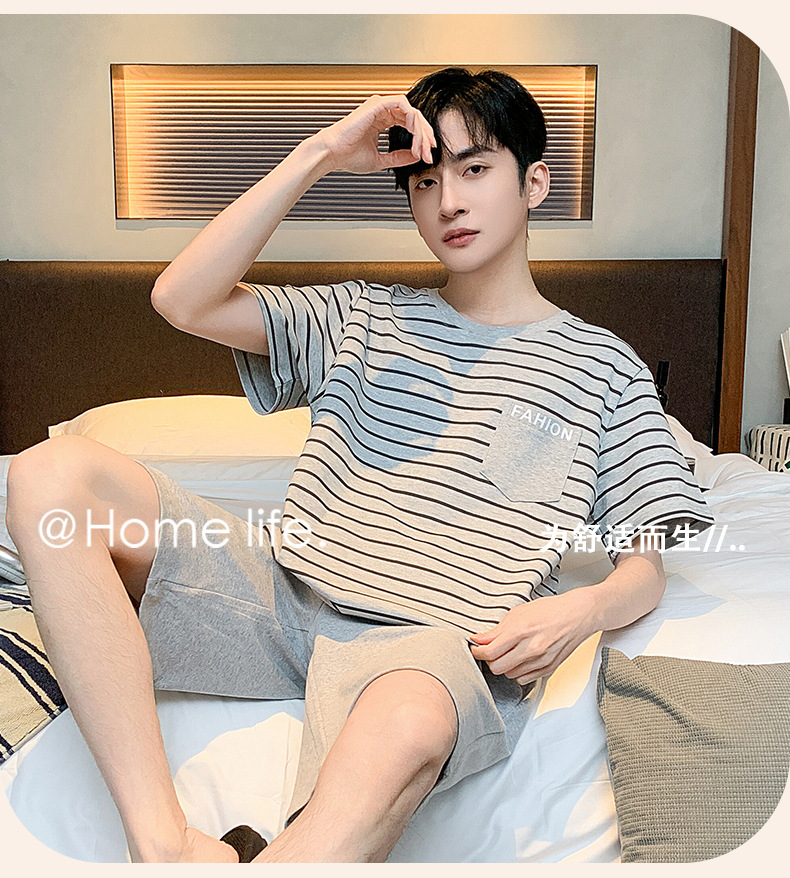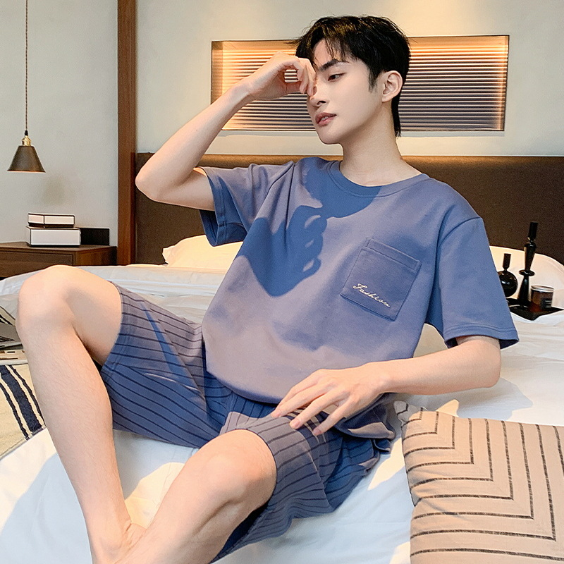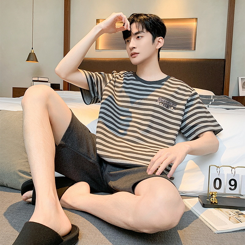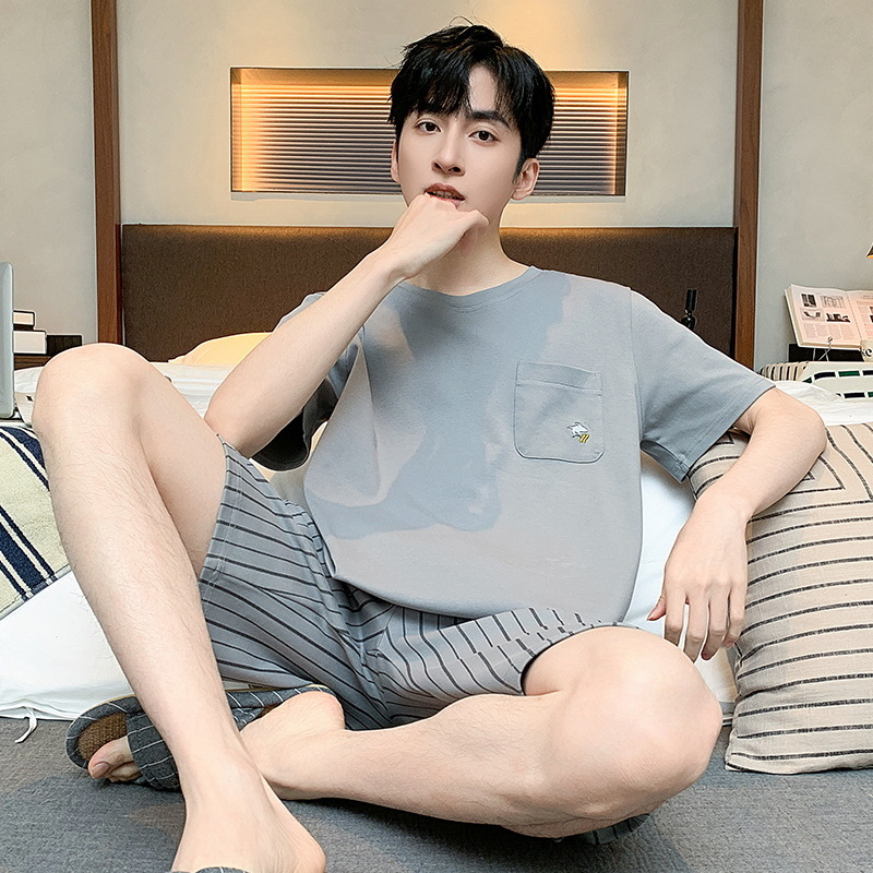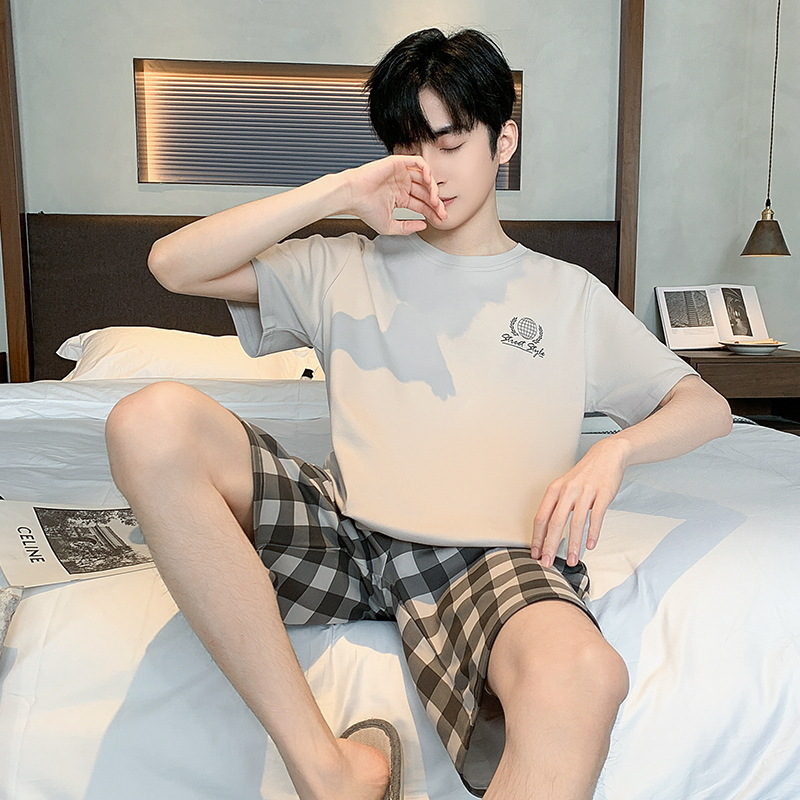 남자 잠옷 간단한 캐주얼 청소년 여름 한국 스타일 코튼 짧은 소매 반바지 남자 세트 홈웨어스토어 가기