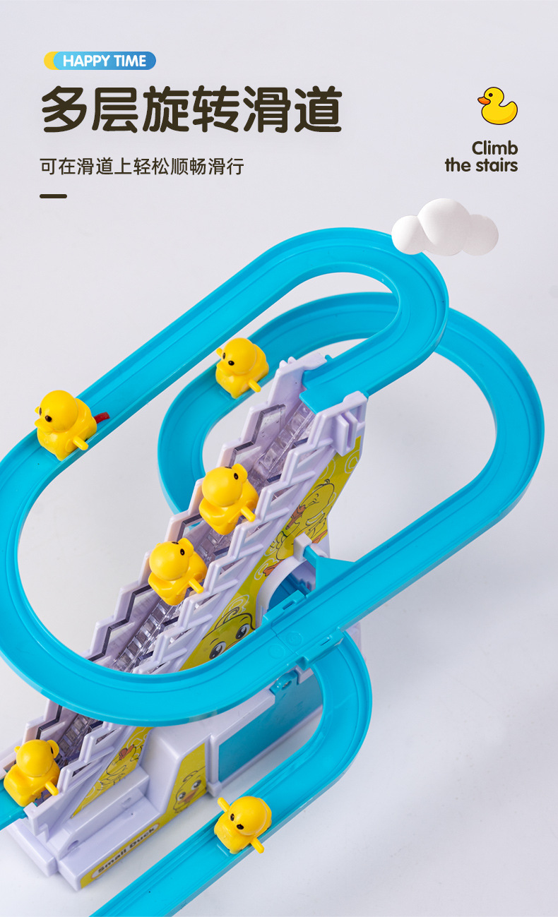 작은 노란색 오리 등반 계단 빛 음악 작은 오리 전기 슬라이드 퍼즐 조립 어린이 트랙 장난감 도매