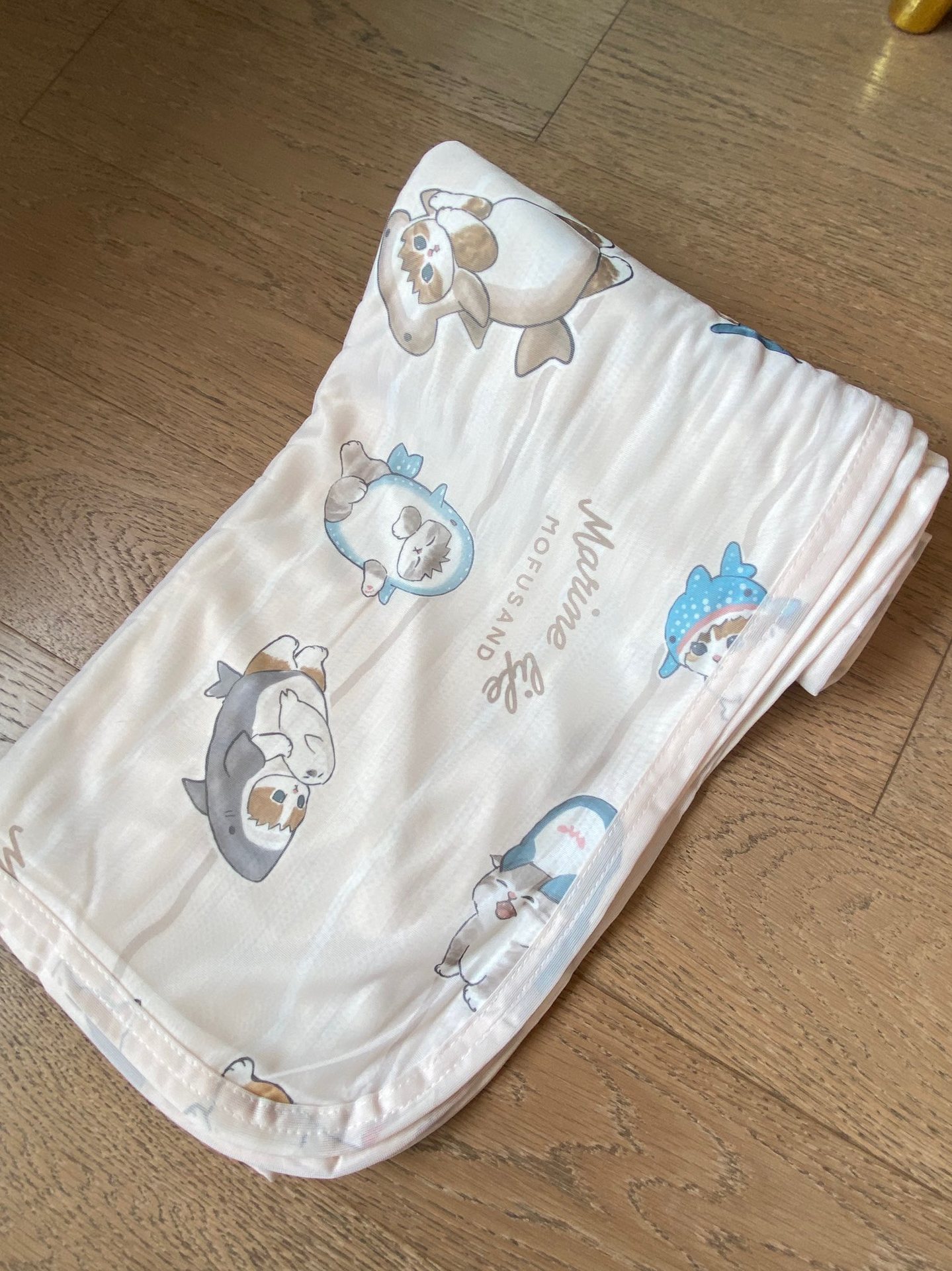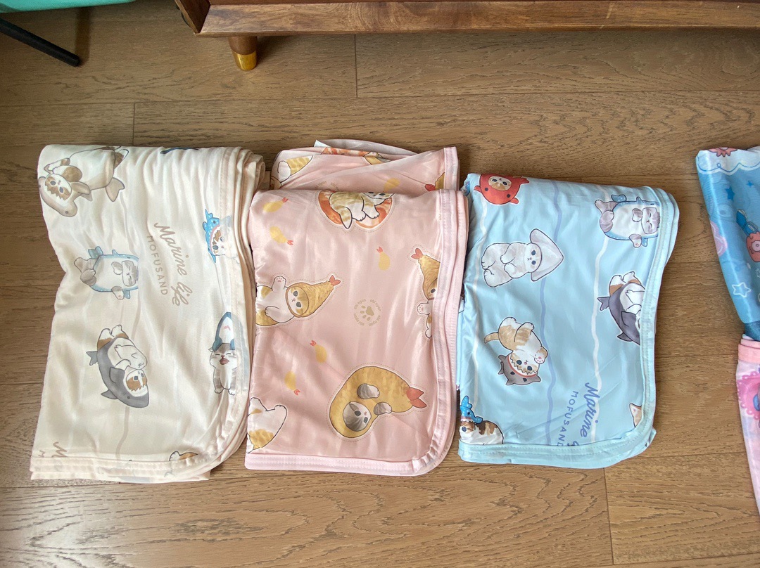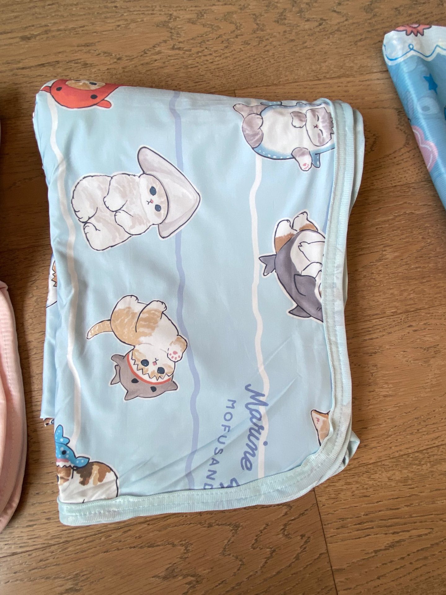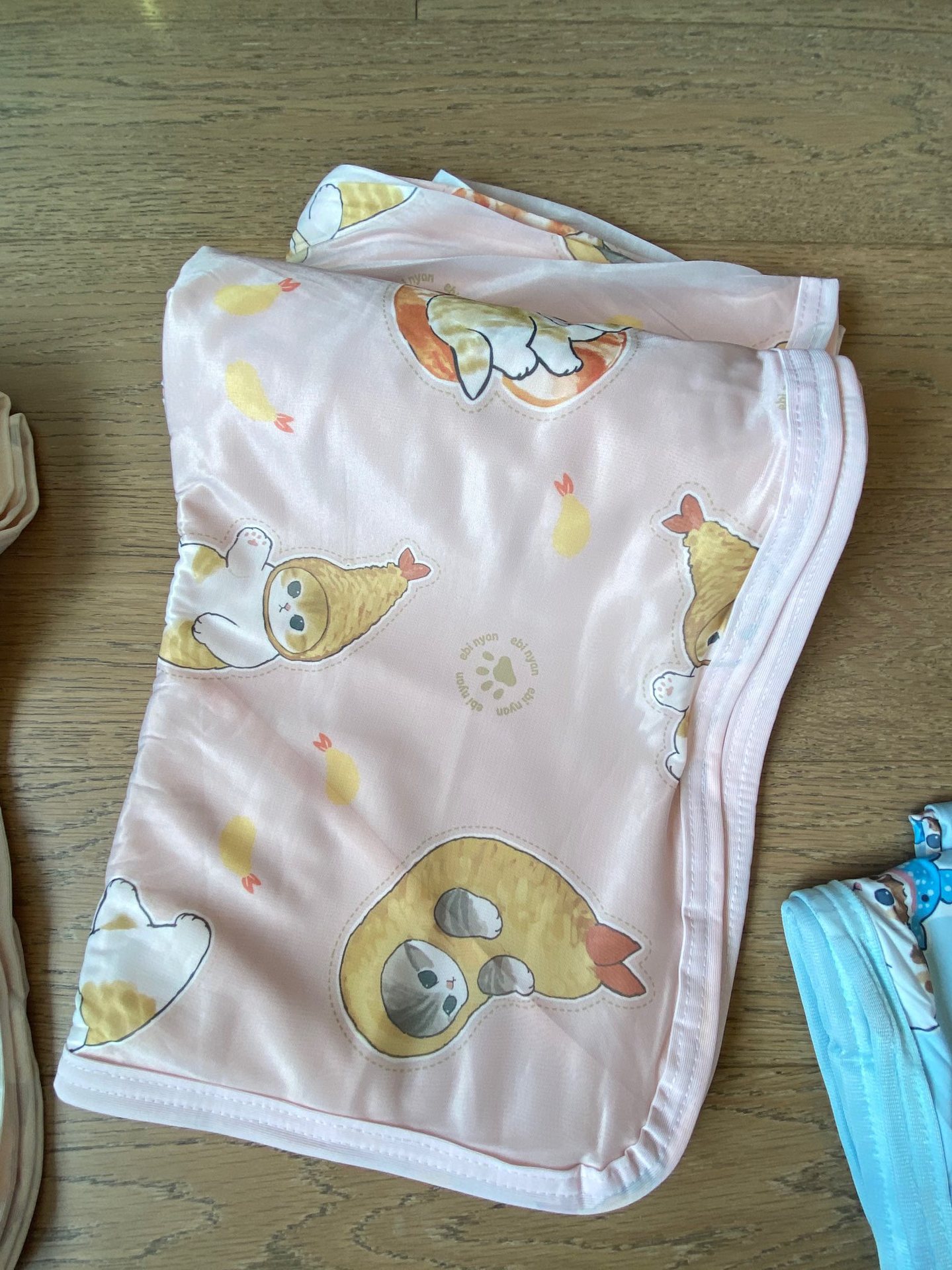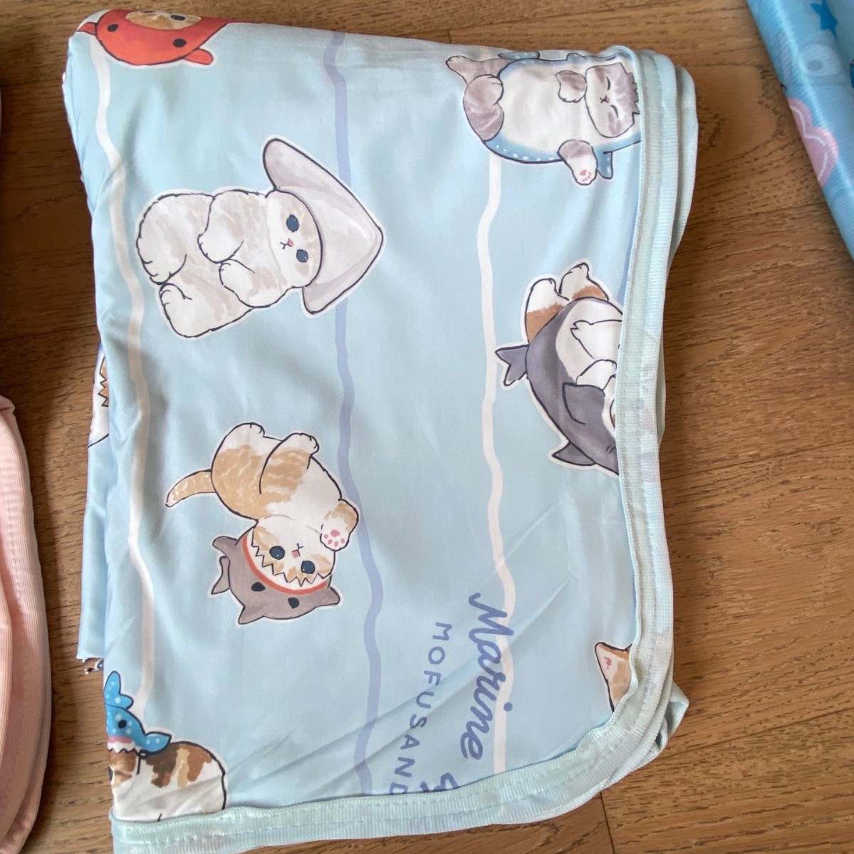 140*190日单外贸尾货夏凉毯空调冷感盖毯,可以当作午睡毯都是AB面的,一面带有图案的,一面顺色搭配的,订单批次不同毯子厚薄,克重都有差别,洗标也会因为批次不同有差别,介意的亲慎拍,。鲨鱼猫蓝色,鲨鱼猫米色,炸虾猫粉色,丑鱼,粉色变装,库洛米,玉桂狗,每个花色都好看呀,尺寸也够大,孩子大人都可以用的一款盖毯