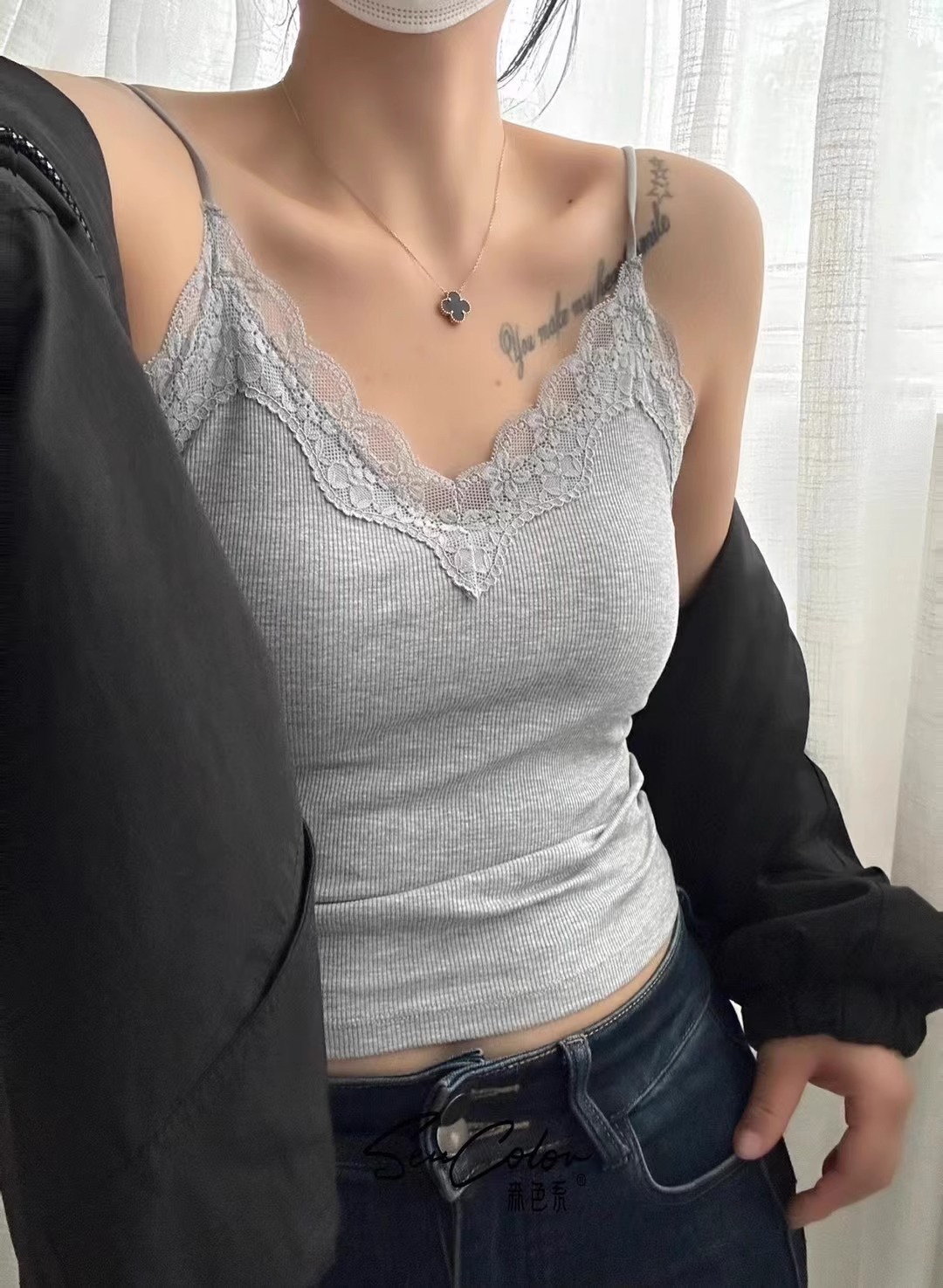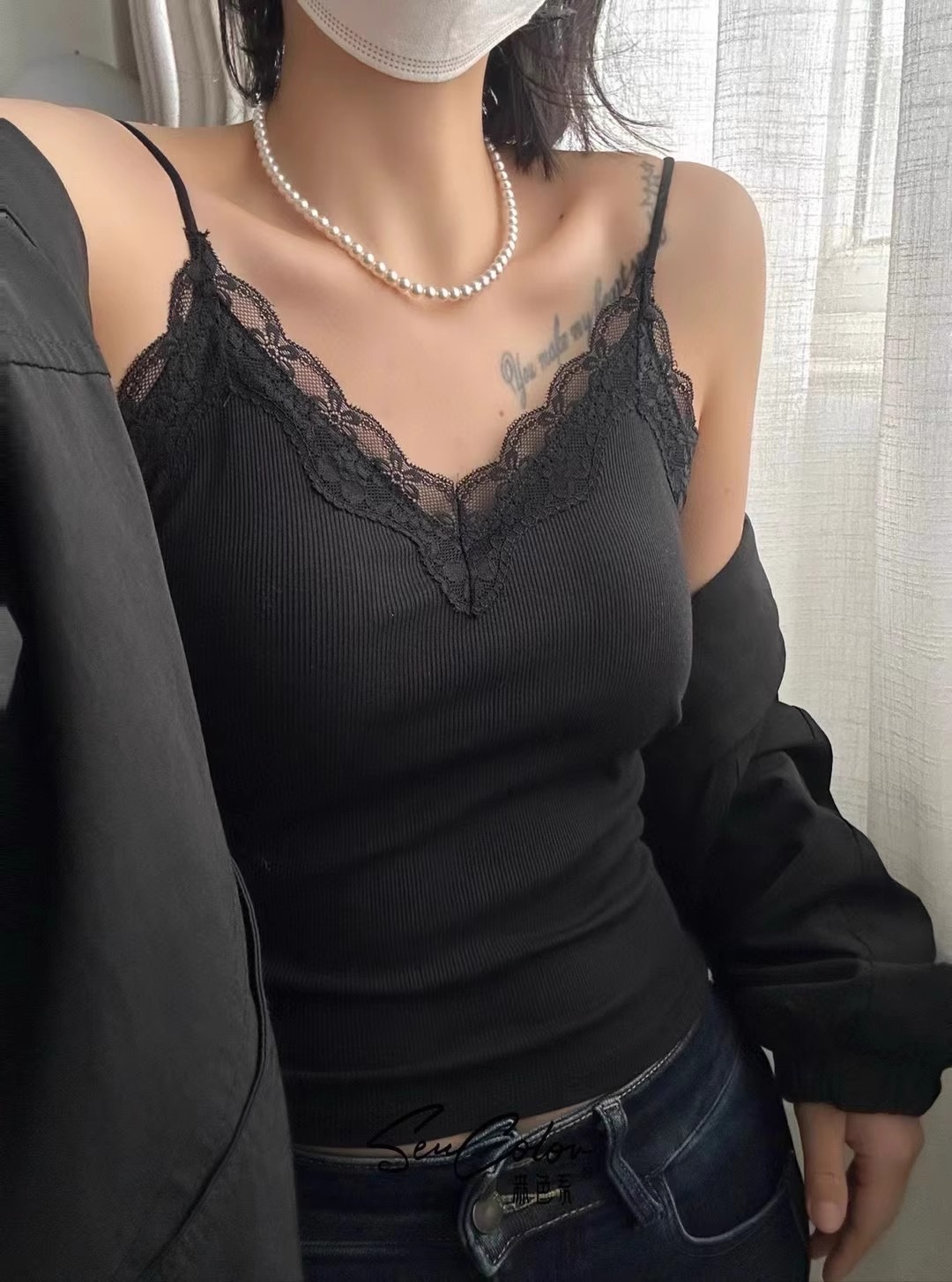 2035 이른 봄 새로운 모리 레이스 편안한 비 마킹 카미 솔 V 넥 얇은 어깨 스트랩 슬림 핏 푸시 업