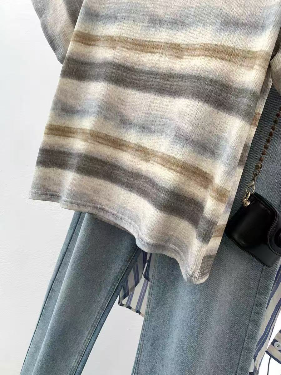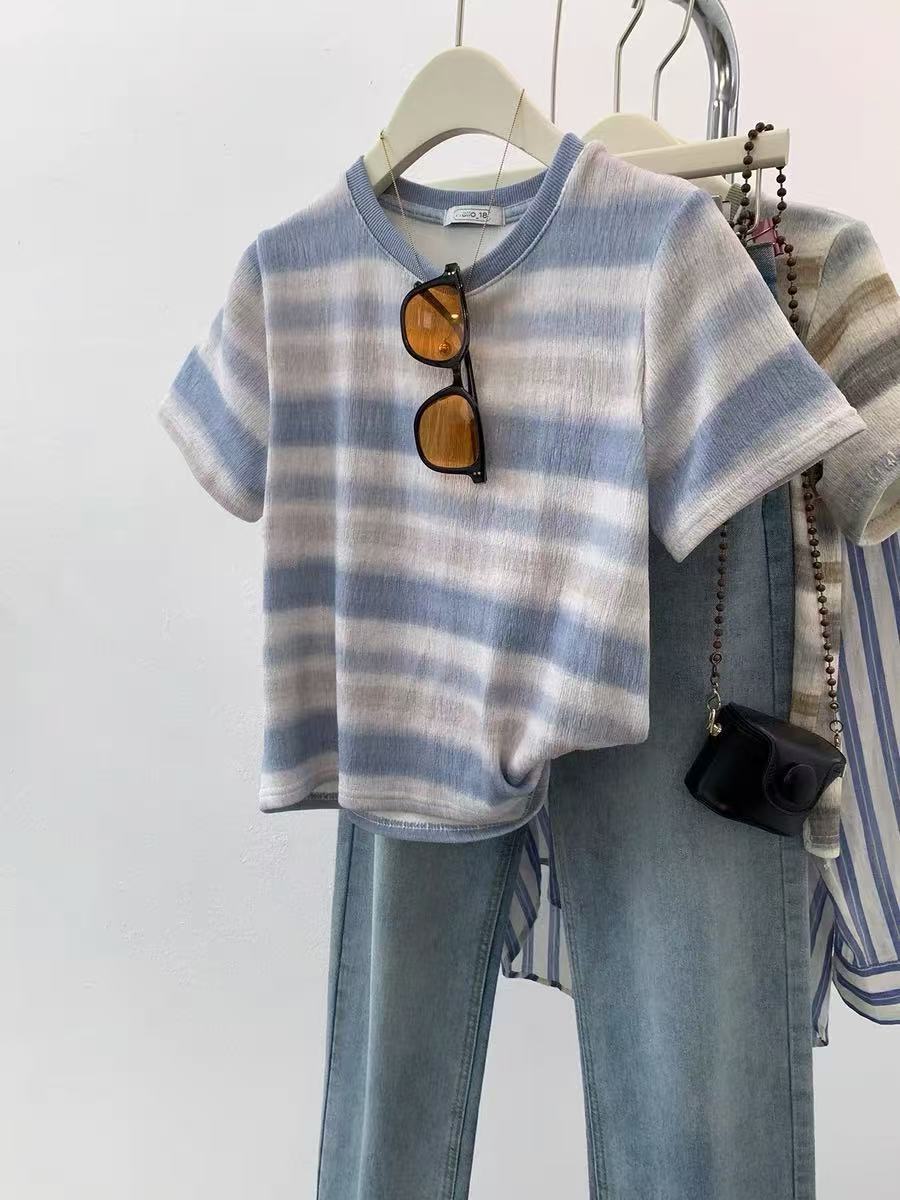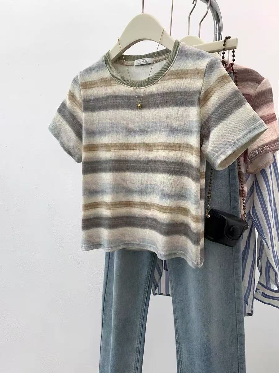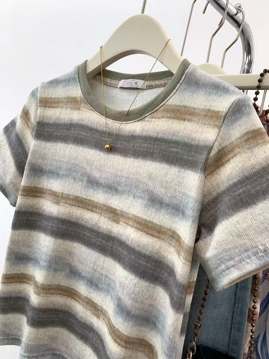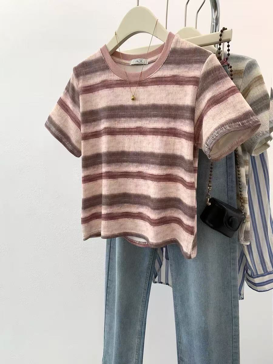 그라디언트 스트라이프 어깨 반팔 티셔츠 여성 여름 2025 새로운 디자인 센스 니쉬 반소매 쇼트 탑스토어 가기