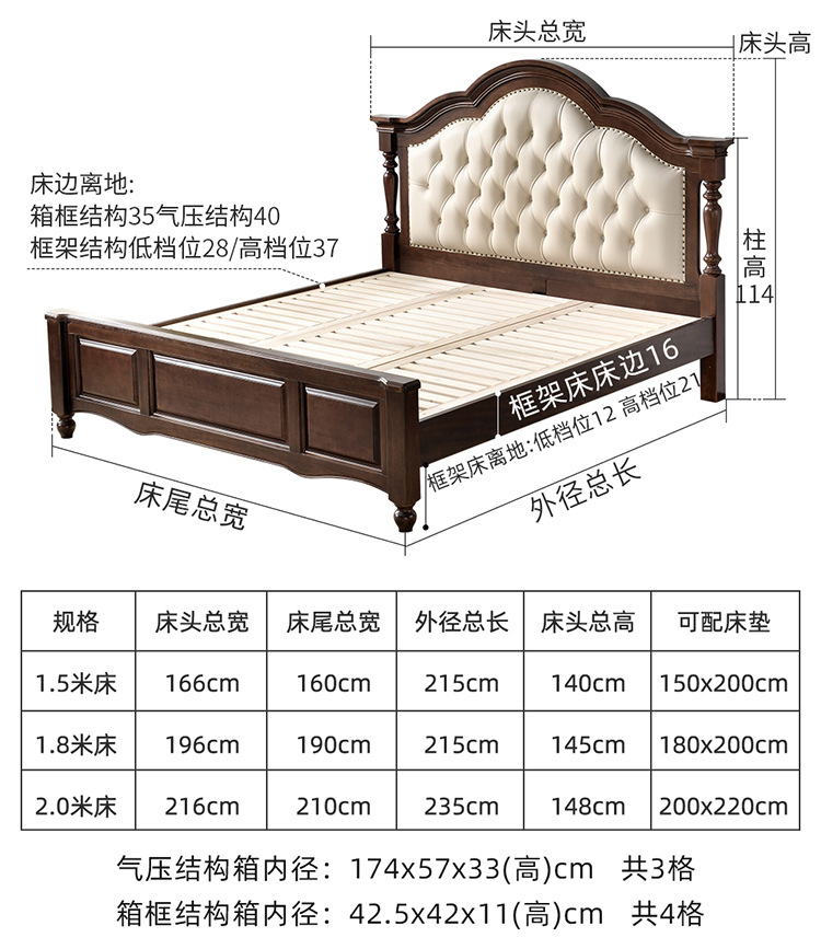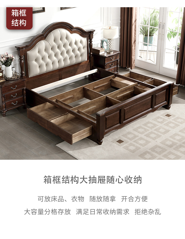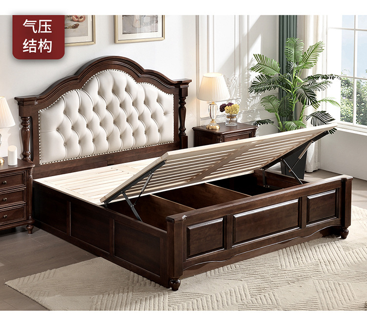 미국의 단단한 나무 침대 마스터 침실 높은 상자 저장 가죽 부드러운 가방 복고풍 1.8 미터 더블 웨딩 침대 200 × 220 큰 침대