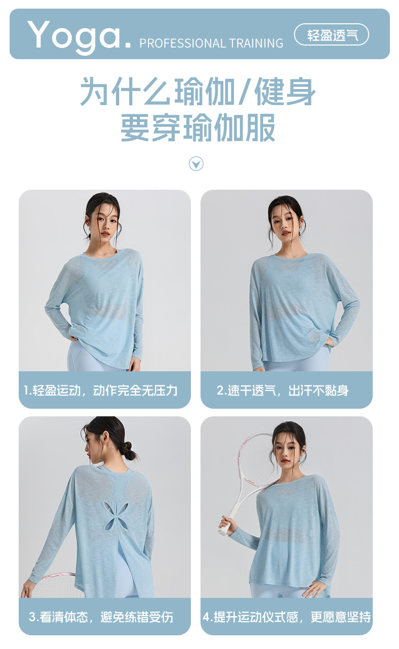 여성을 위한 새로운 통기성 요가 커버업, 슬림 스포츠 피트니스 탑, 가벼운 요가복, 루즈한 긴팔 도매스토어 가기
