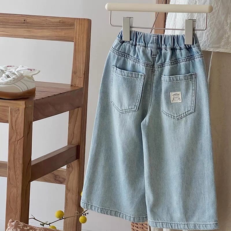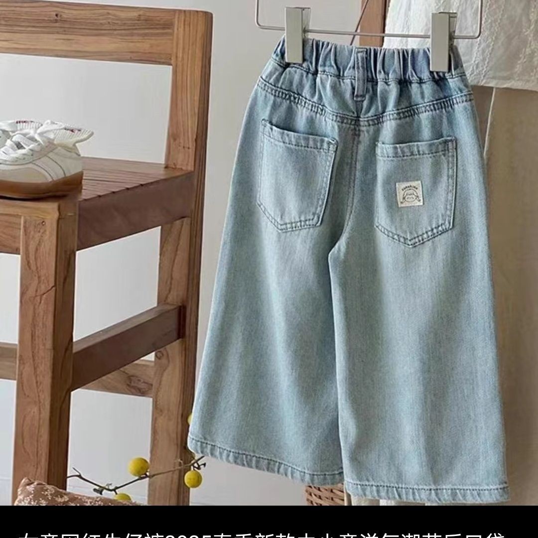 소녀 사이버 축하 청바지 2025 봄 새로운 어린이 서양 스타일 유행 스타일 포켓 포스트 넓은 다리 스트레이트 다리 바지스토어 가기