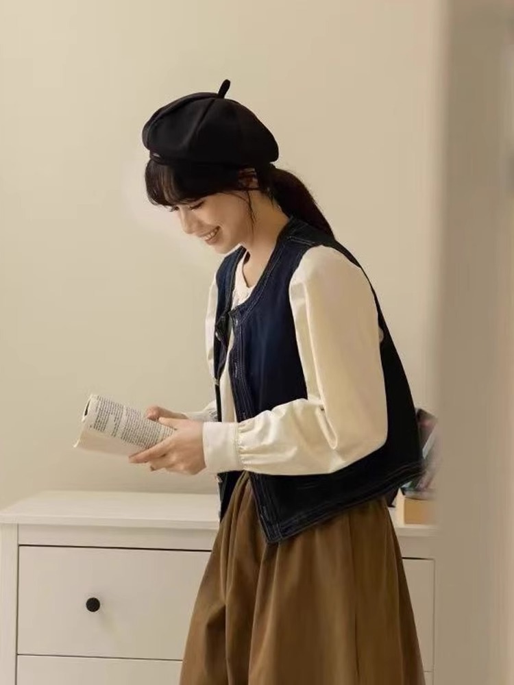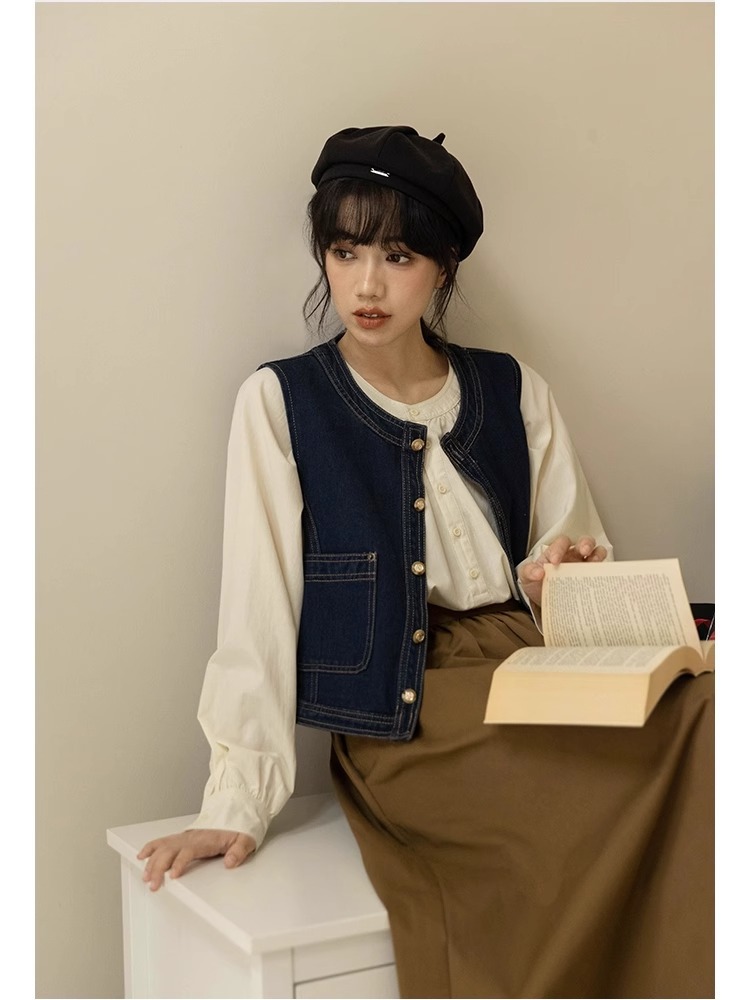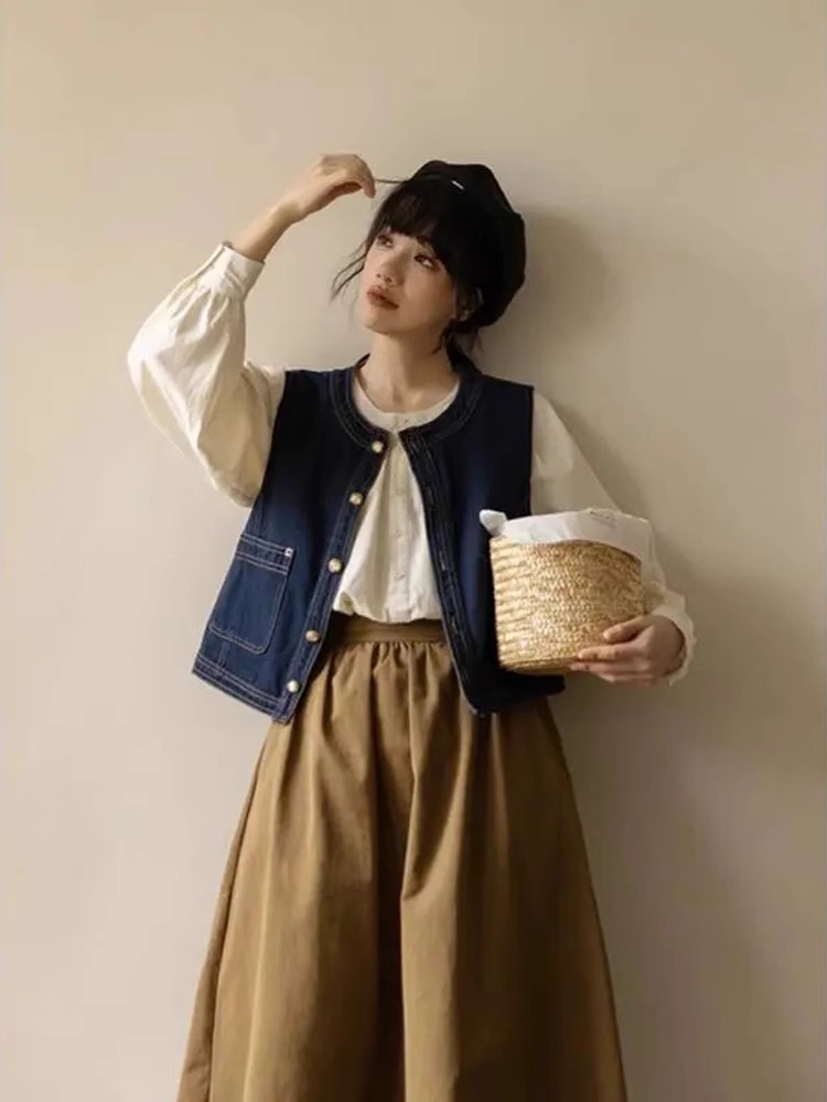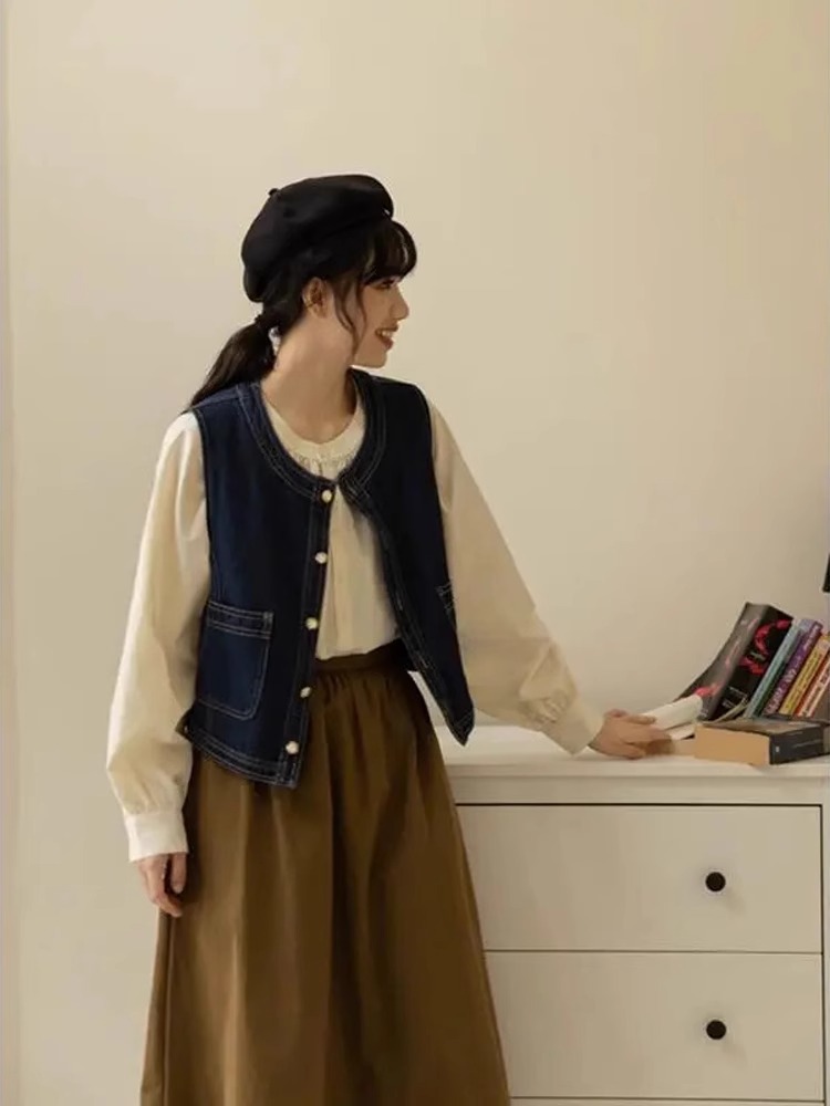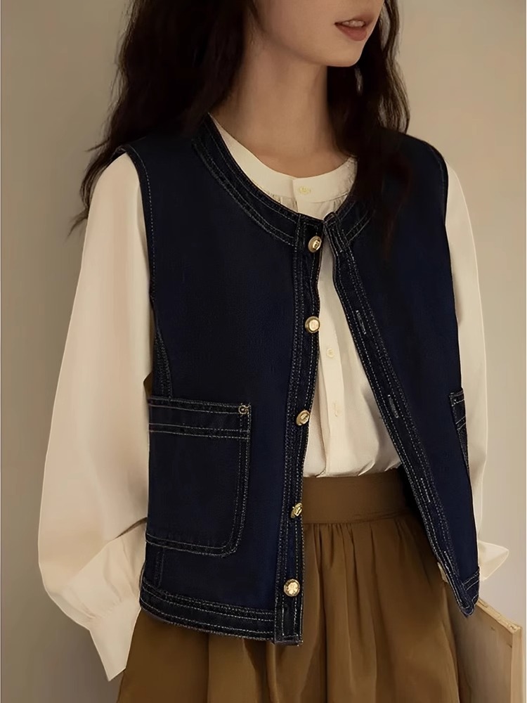 빈티지 스타일 카디건 데님 조끼 재킷 봄 가을 아우터 여성용 디자인 조끼 3190