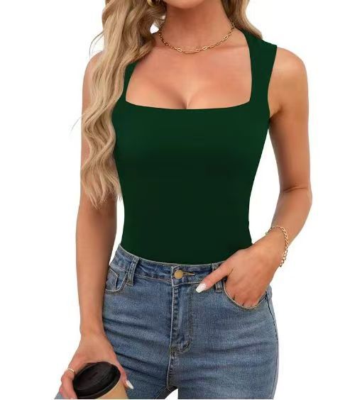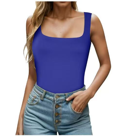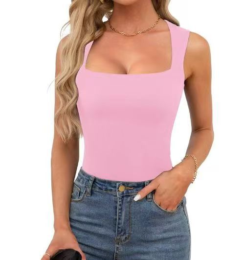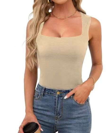 2025 새로운 아마존 여름 새로운 여성 스퀘어 칼라 민소매 더블 레이어 조끼 기본 타이트 티셔츠 블랙스토어 가기