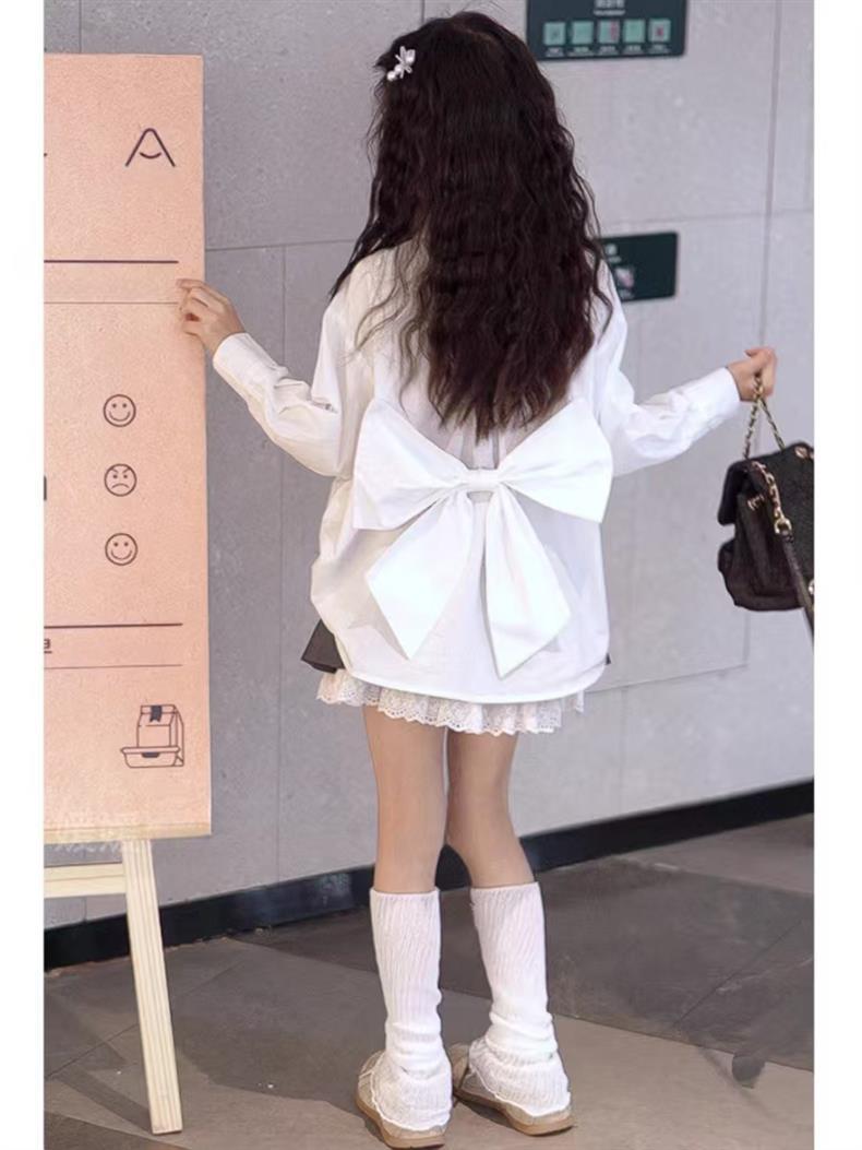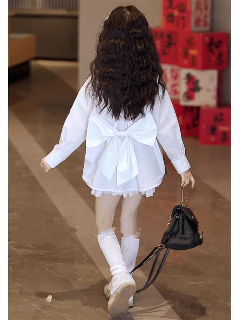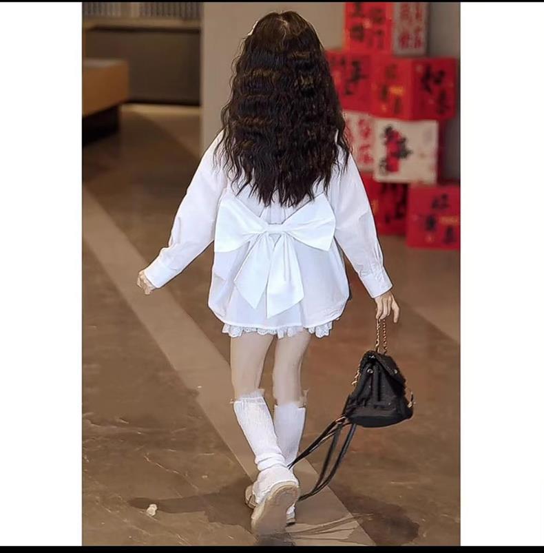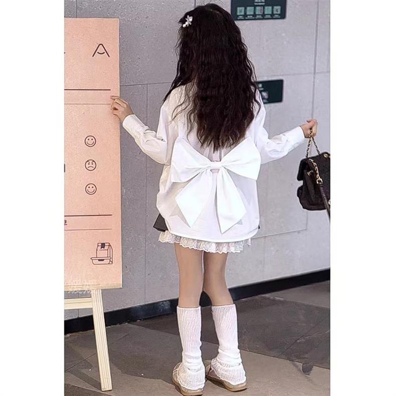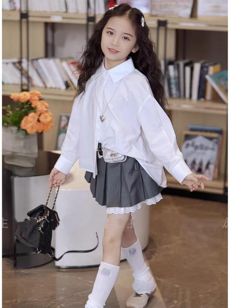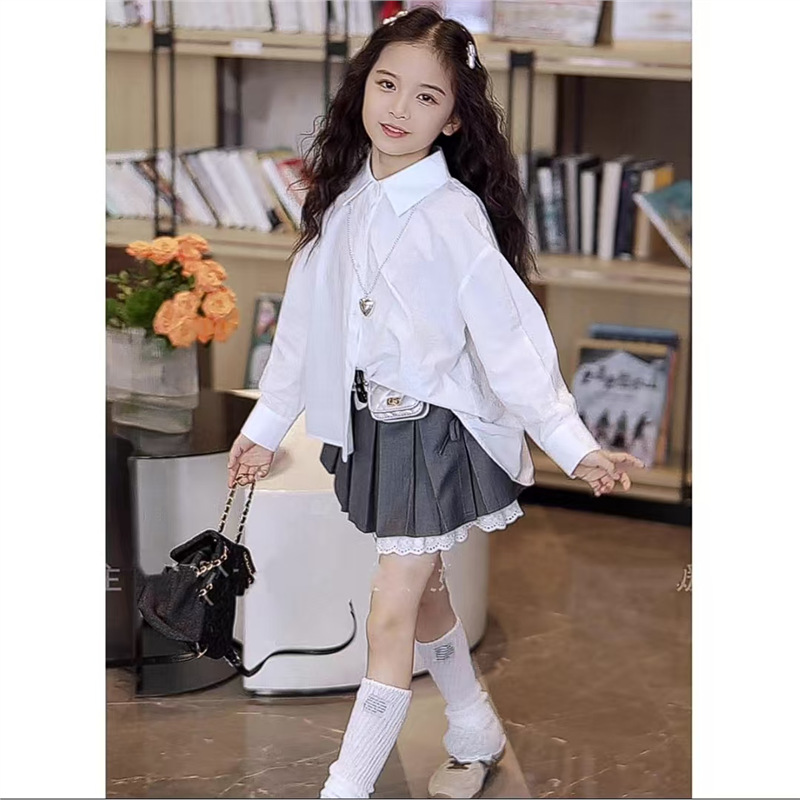 2025 새로운 소녀 유행 패션 세트 소녀의 한국 스타일 활 셔츠 주름 치마 큰 어린이 긴 소매스토어 가기