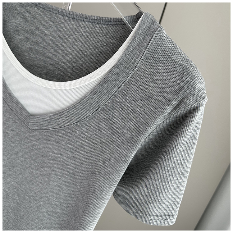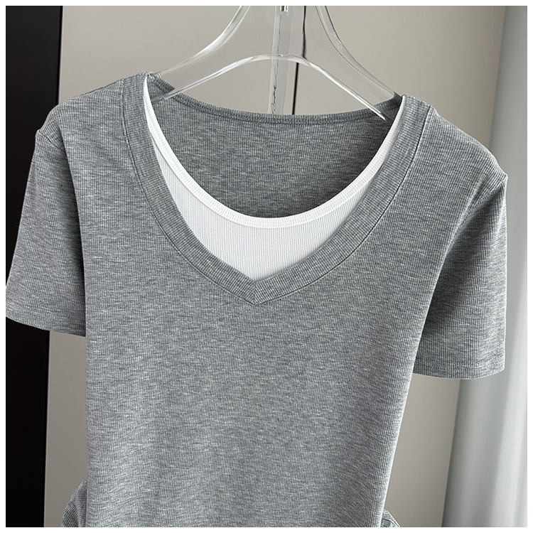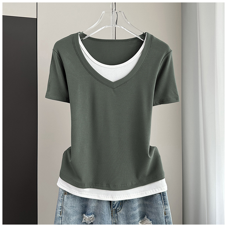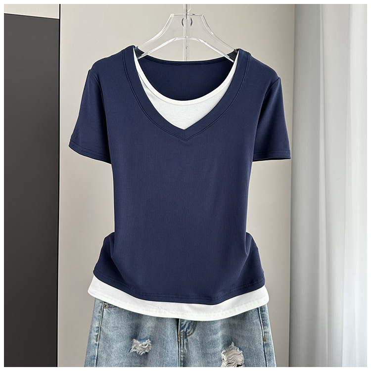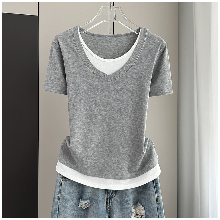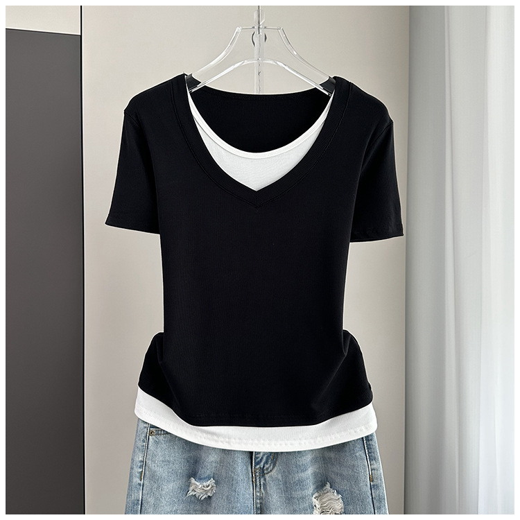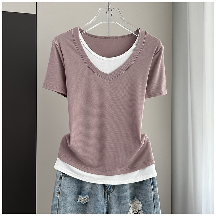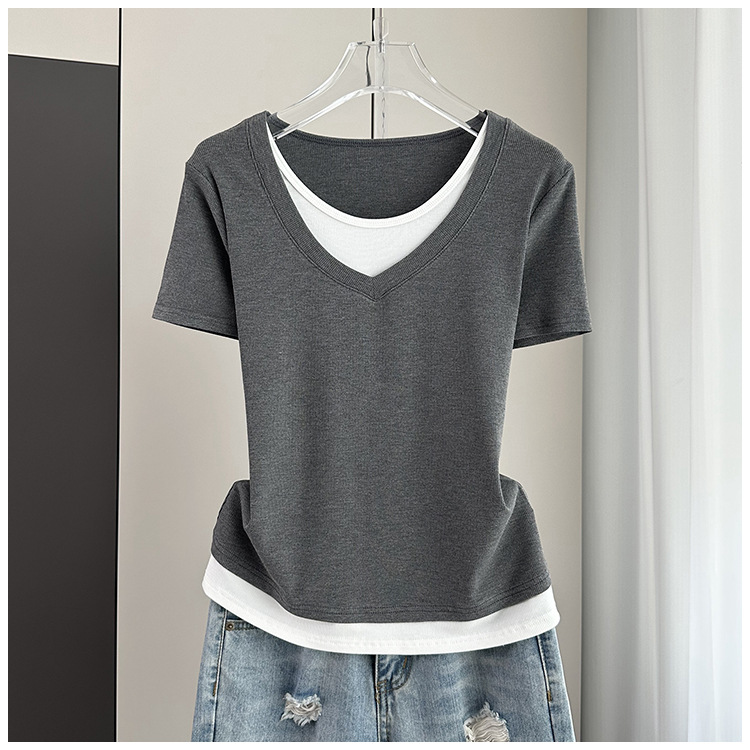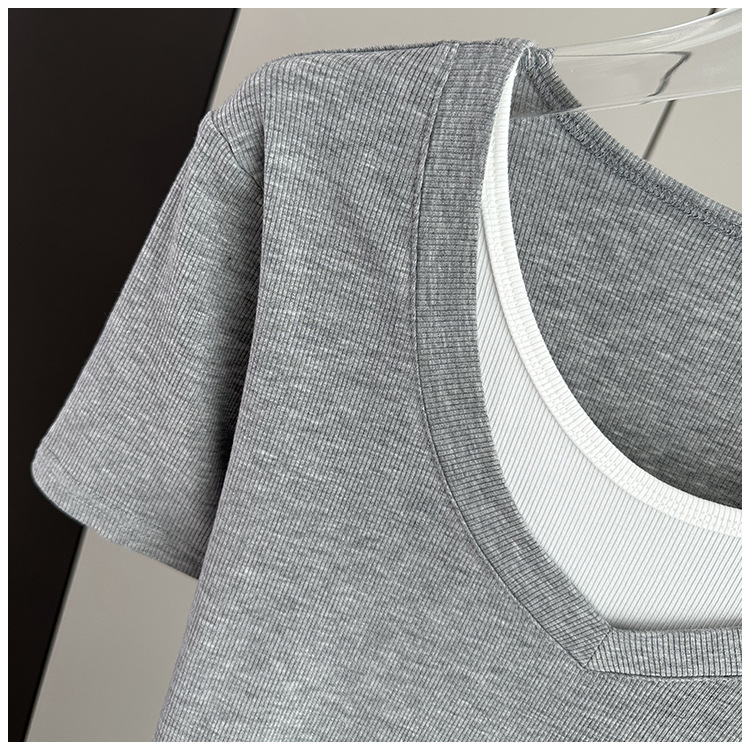 여름 느슨한 플러스 사이즈 가짜 투피스 반팔 티셔츠 여성용 2025 새 스레드 스티칭 벨리 커버 슬림 탑