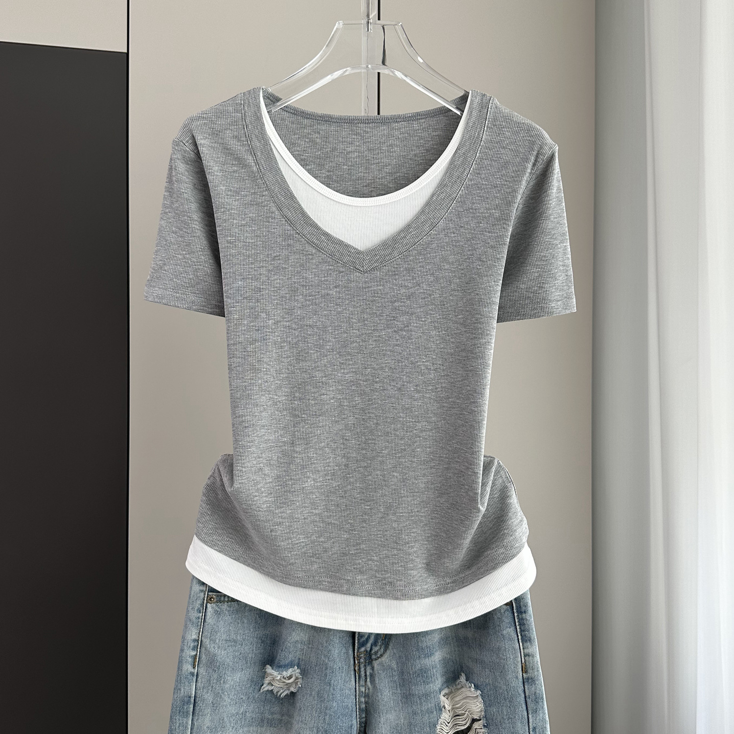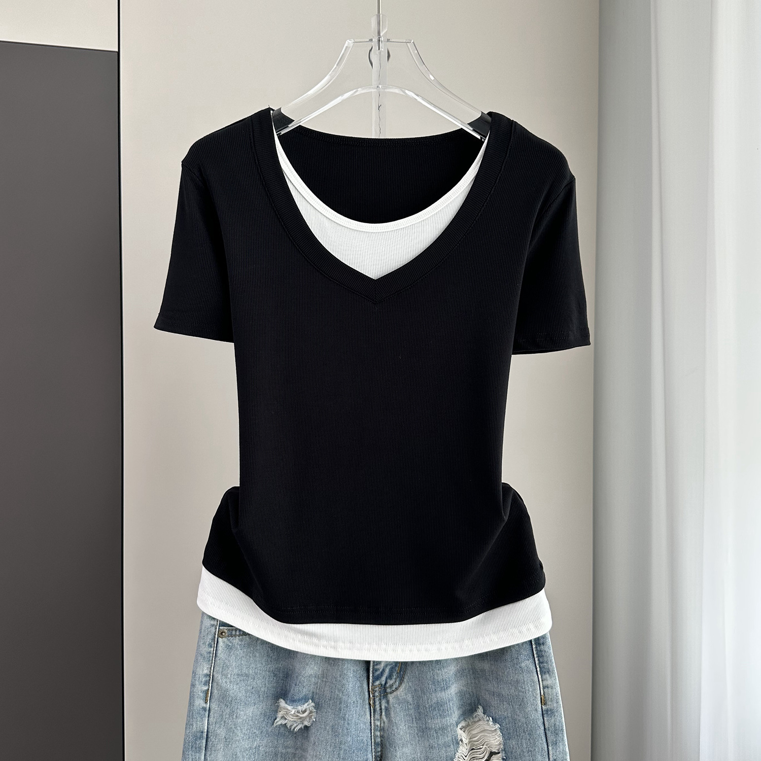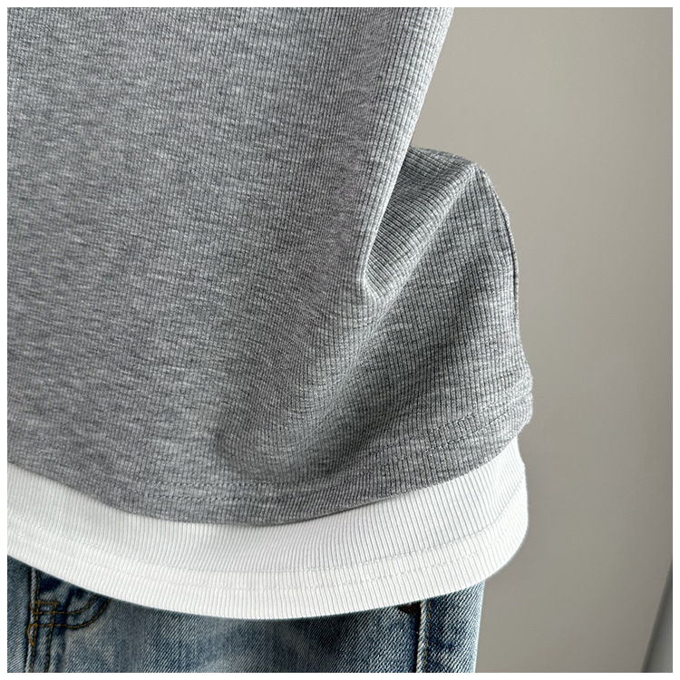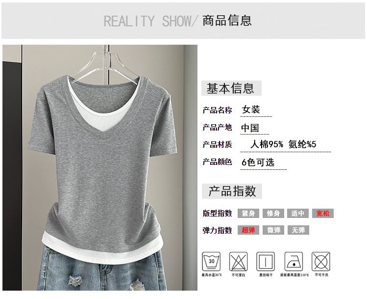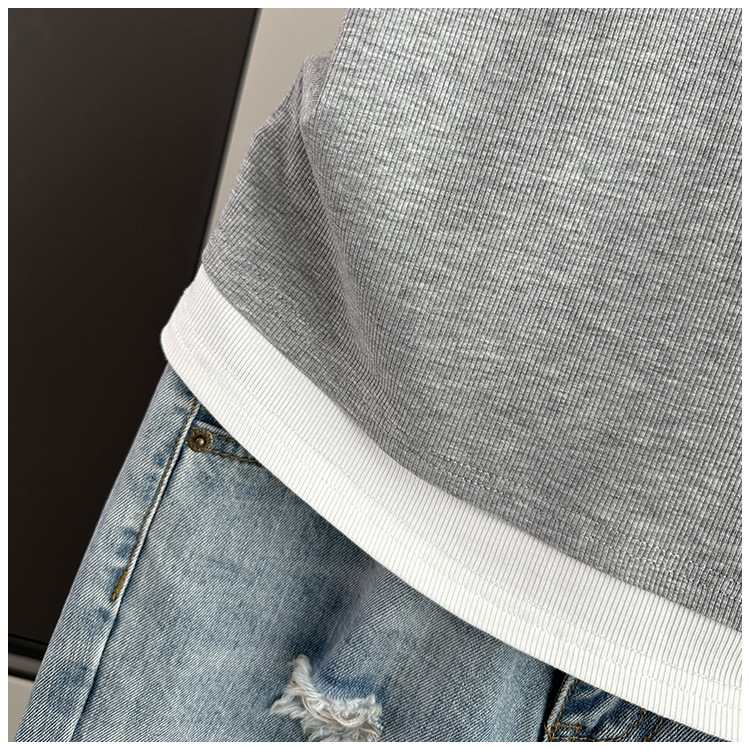 夏季宽松大码假两件短袖T恤女装2024新款螺纹拼接遮肚子显瘦上衣