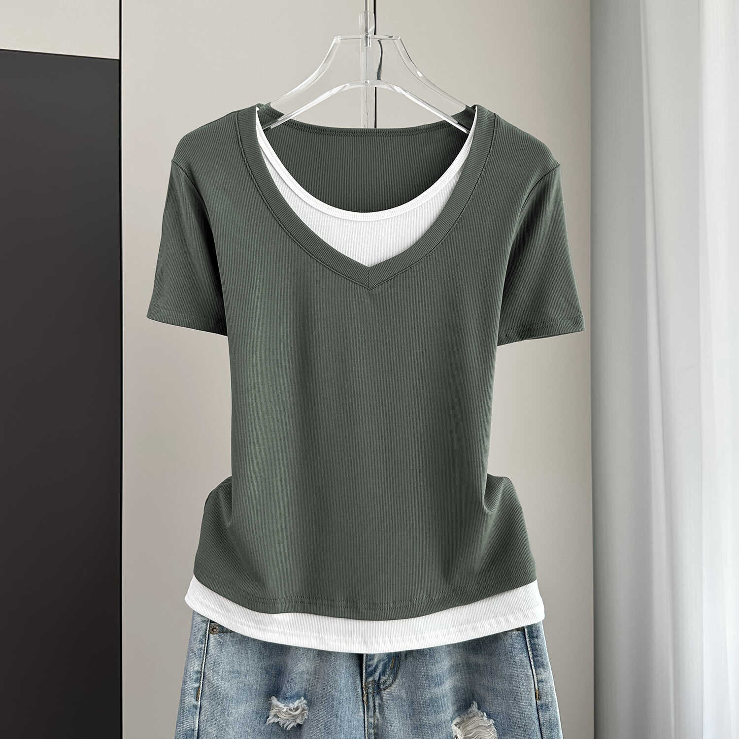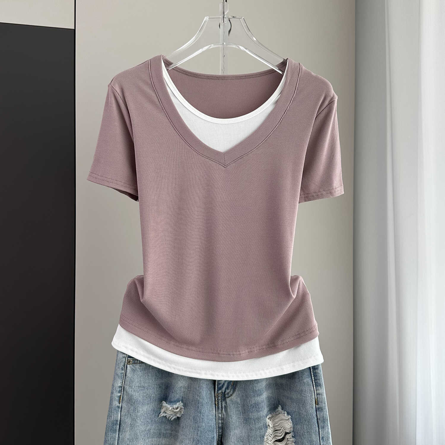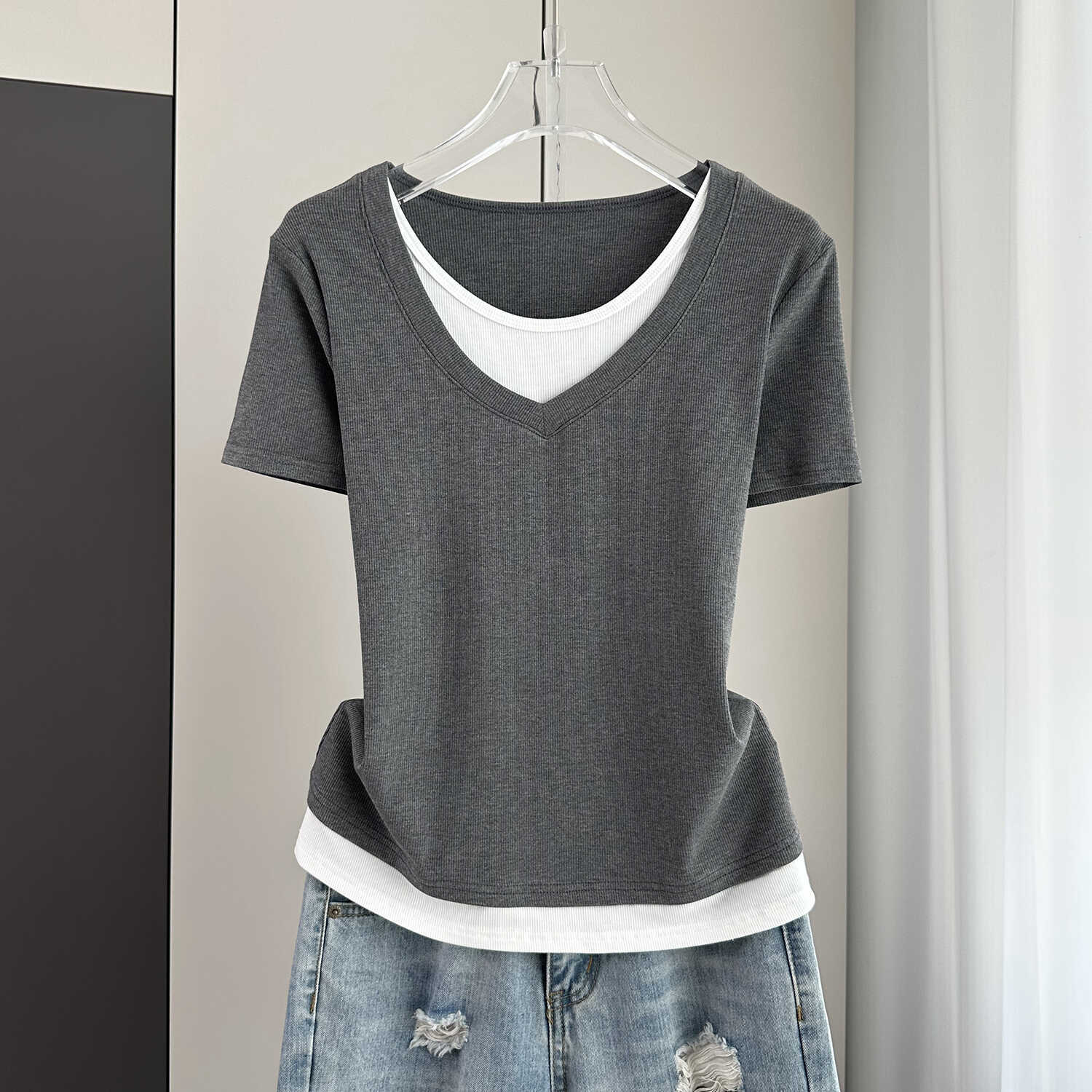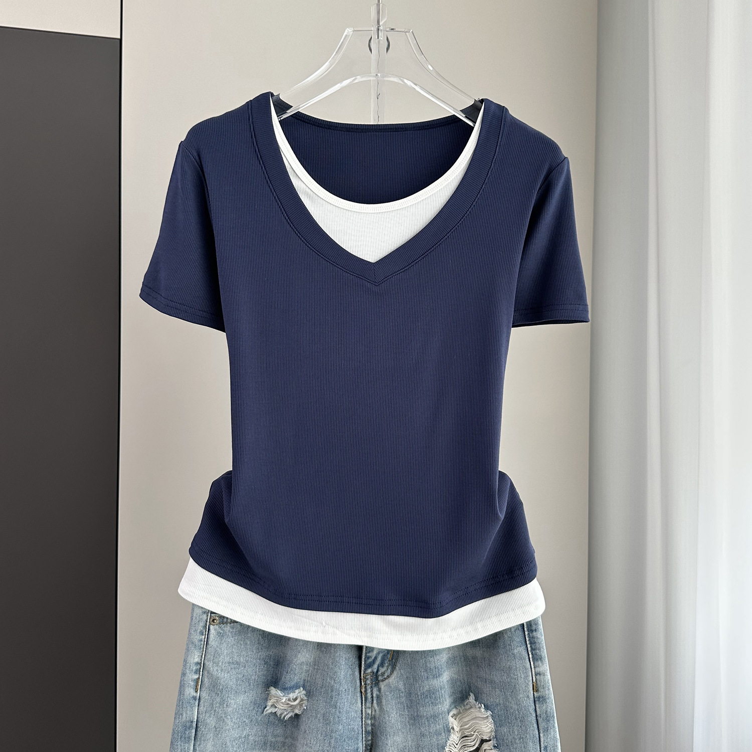 夏季宽松大码假两件短袖T恤女装2024新款螺纹拼接遮肚子显瘦上衣