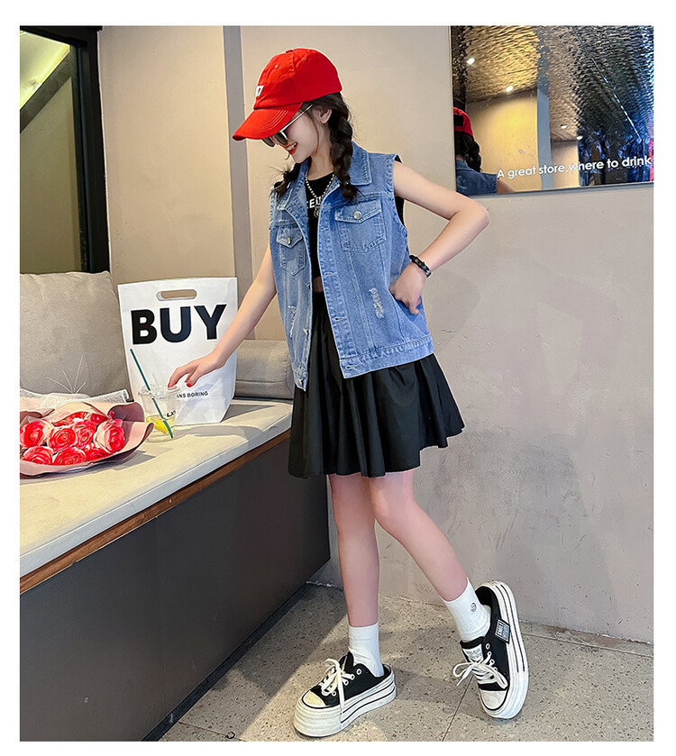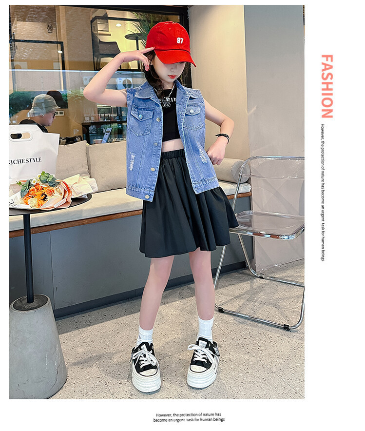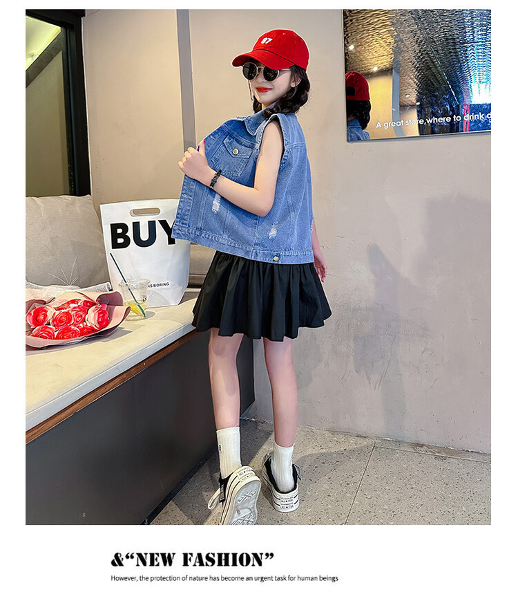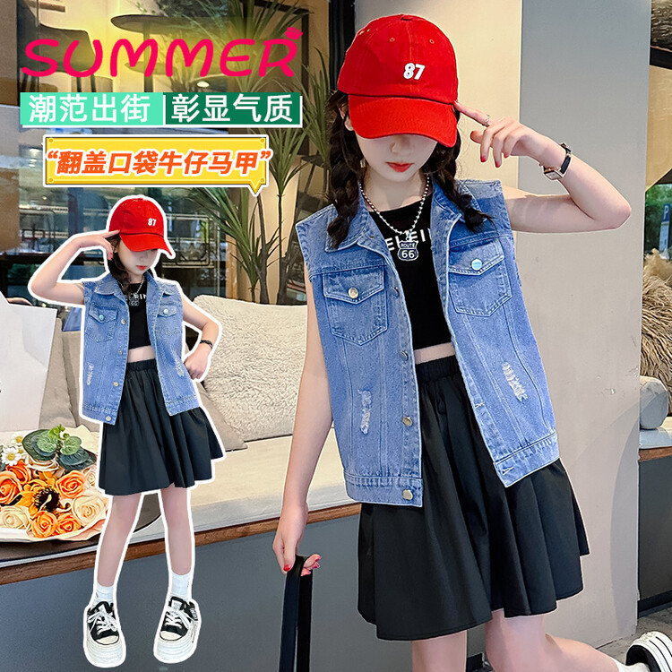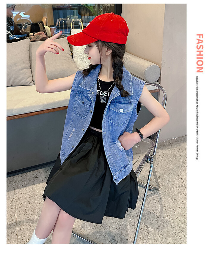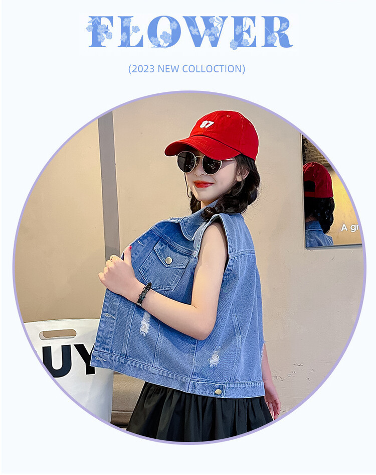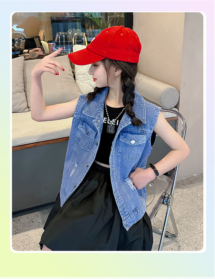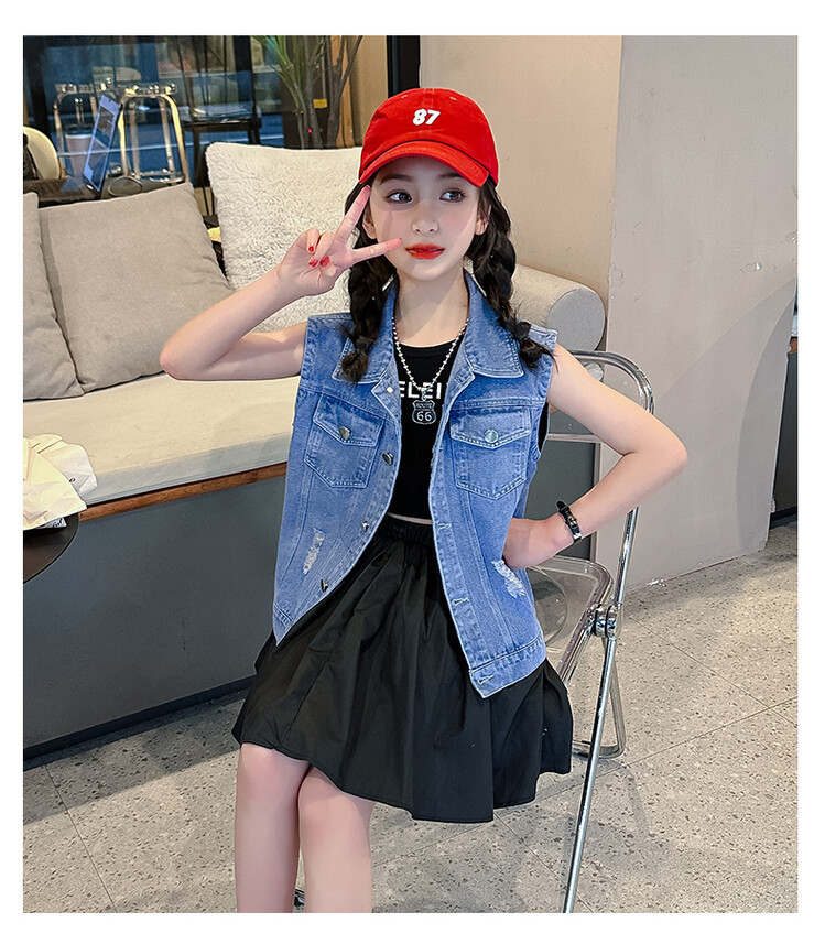 국경 간 소녀 데님 조끼 얇은 봄과 여름 어린이 조끼 새로운 스타일 중대형 어린이 단색 소매 재킷 트렌디스토어 가기