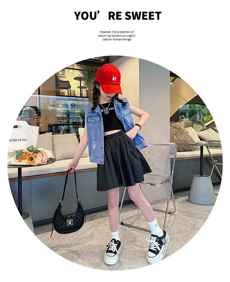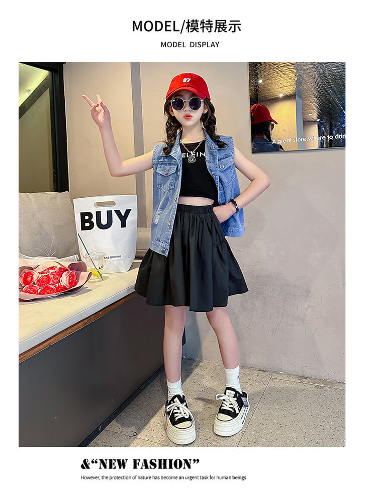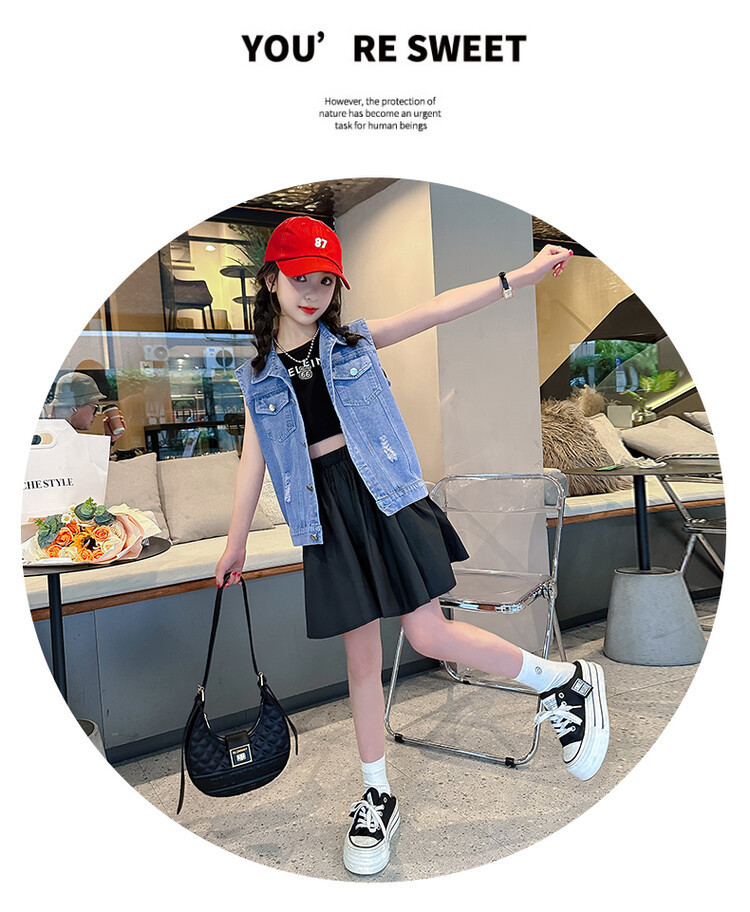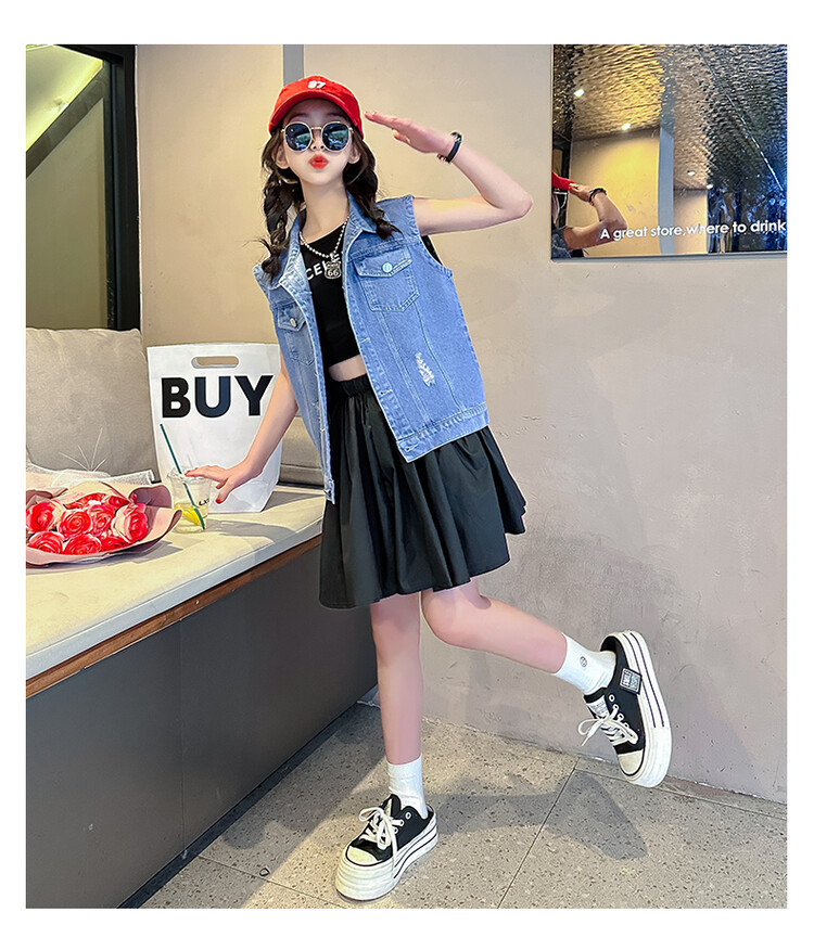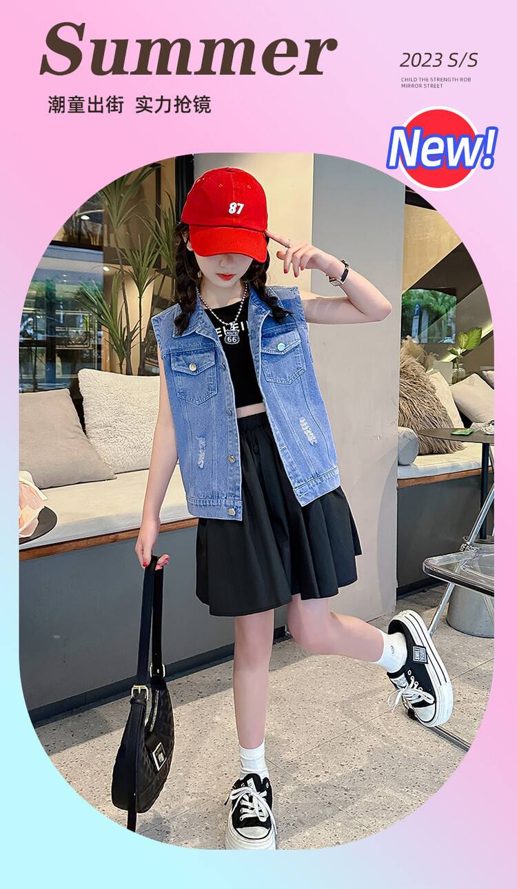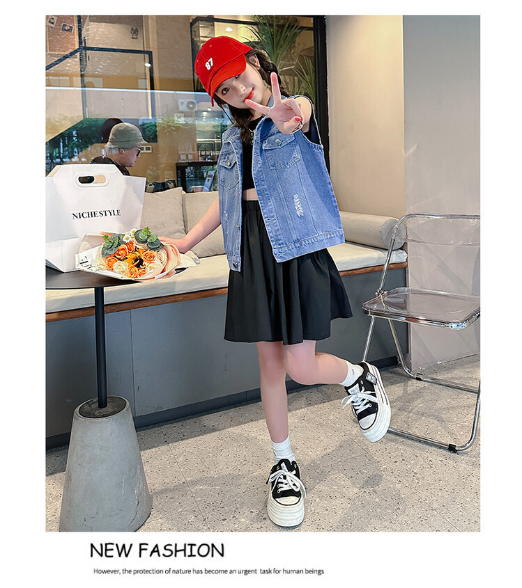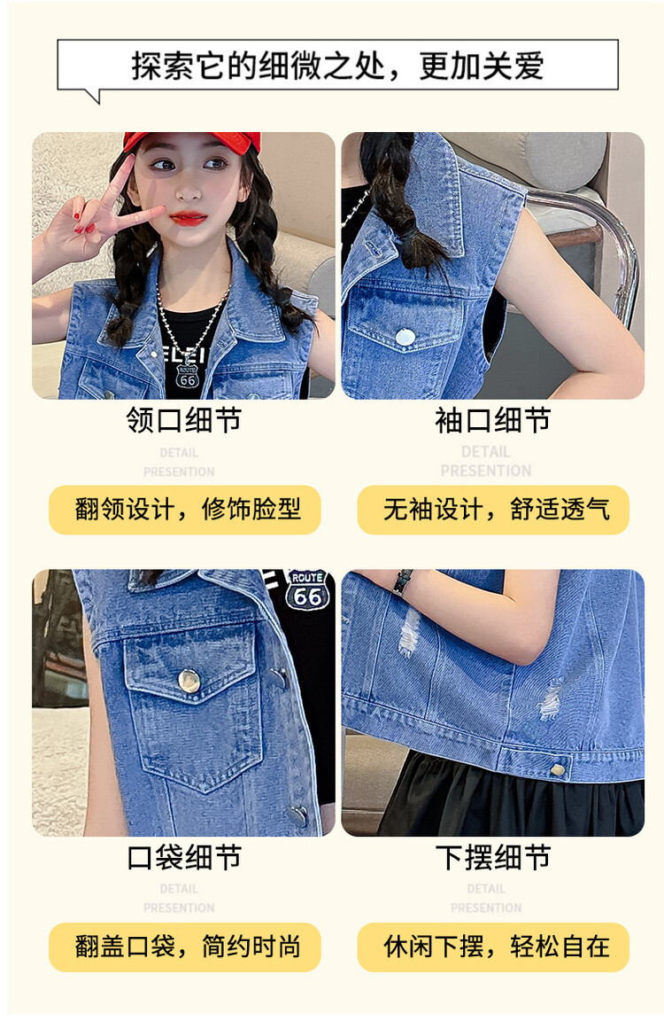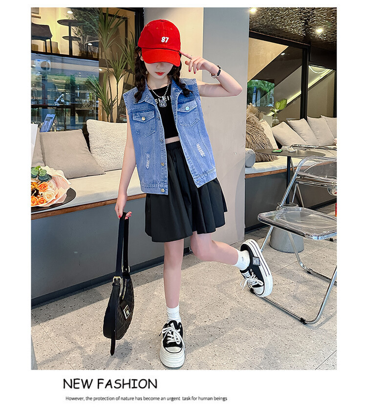 국경 간 소녀 데님 조끼 얇은 봄과 여름 어린이 조끼 새로운 스타일 중대형 어린이 단색 소매 재킷 트렌디스토어 가기