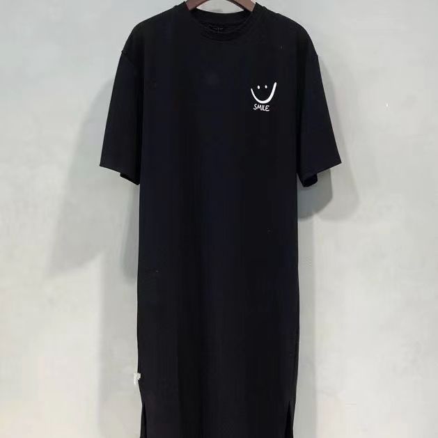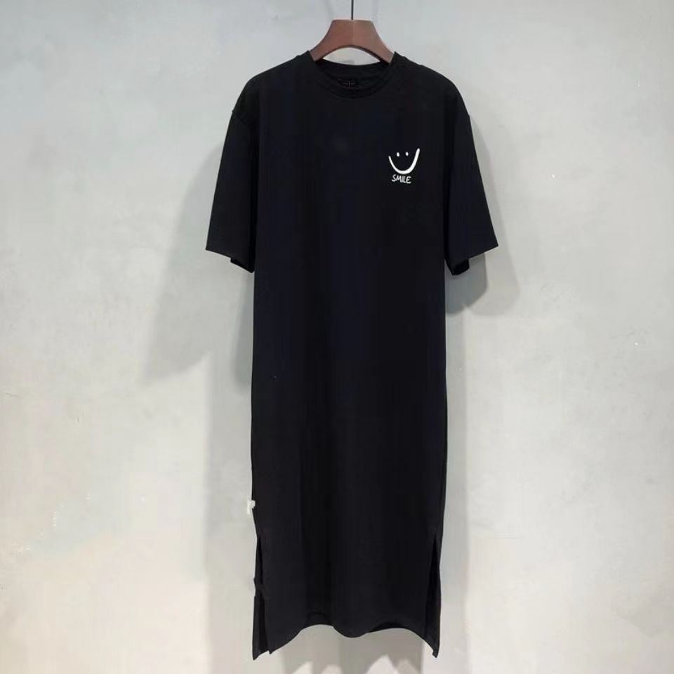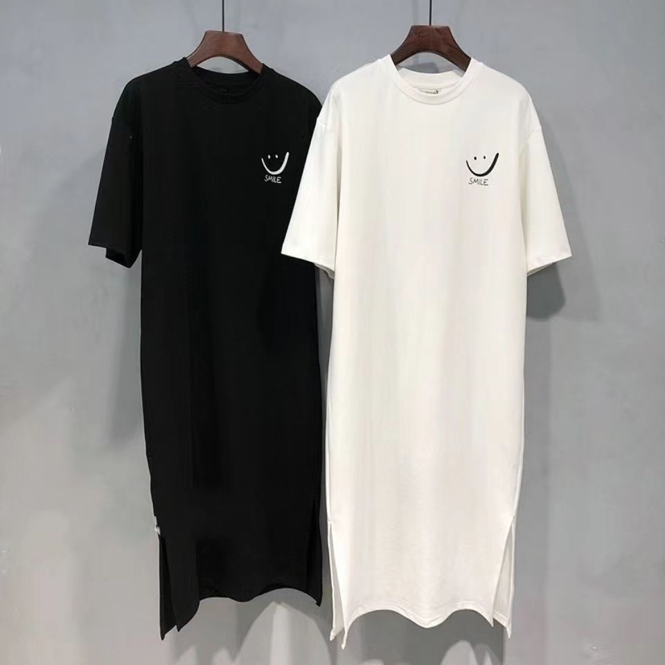 여름 새로운 올 매치 칼리지 스타일 짧은 소매 느슨한 한국식 인쇄 된 분할 미디 원피스 티셔츠 여성스토어 가기