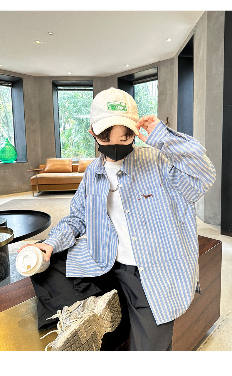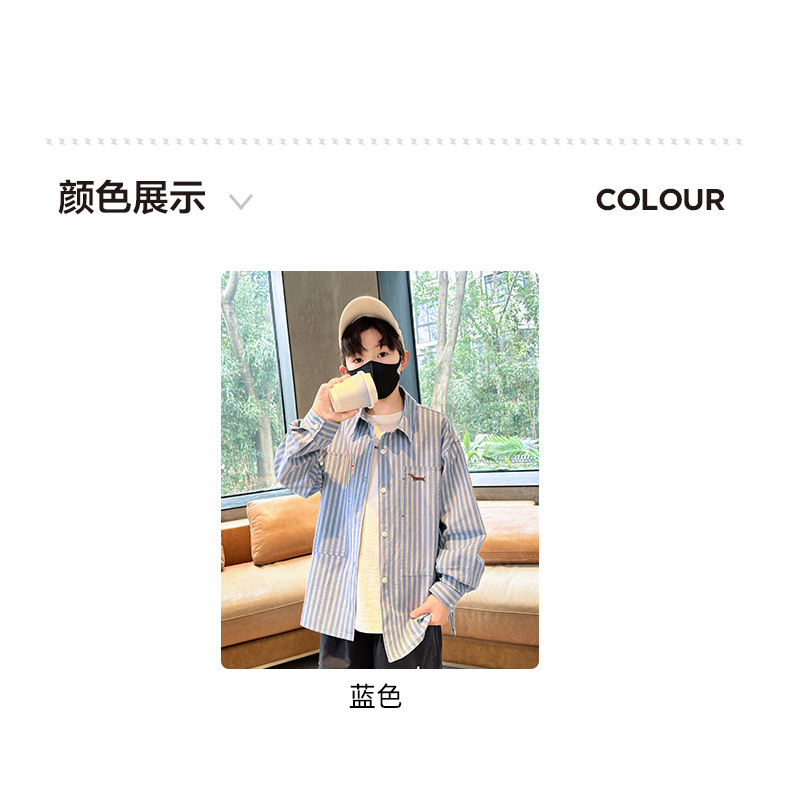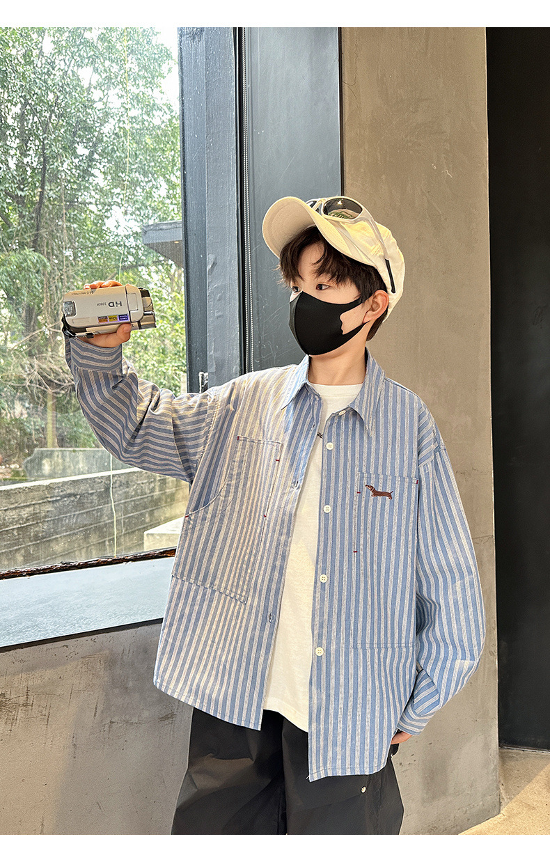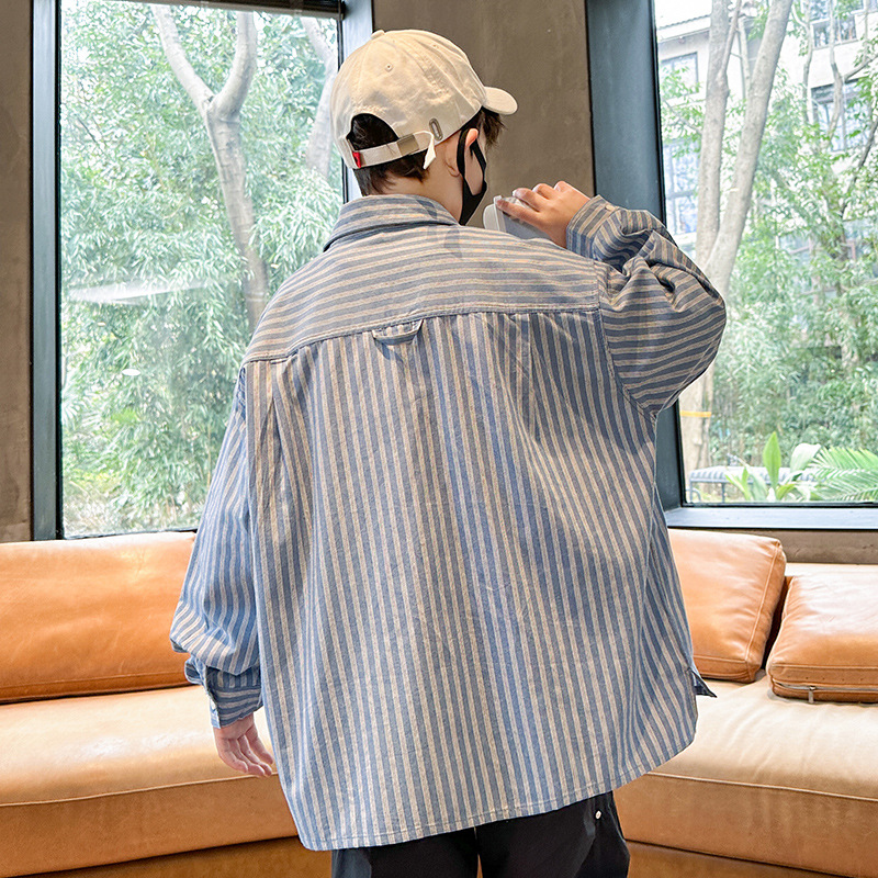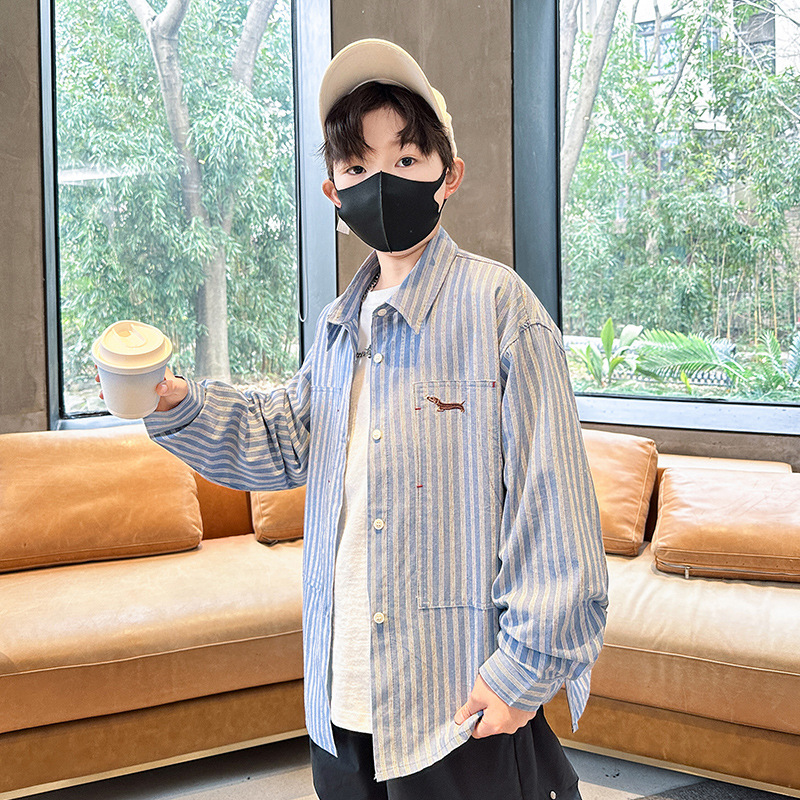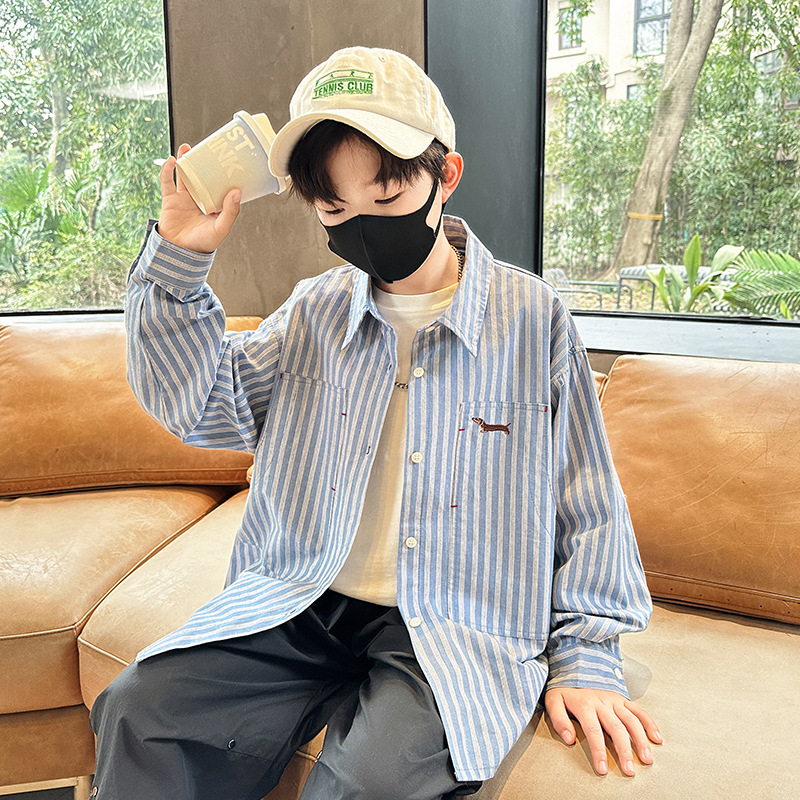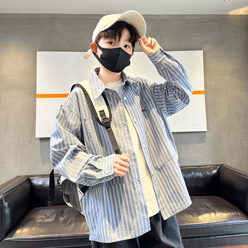 봄 소년 셔츠 큰 어린이 착용 어린이 소년의 봄과 가을 수직 줄무늬 셔츠 옷깃 최고 캐주얼 얇은 재킷