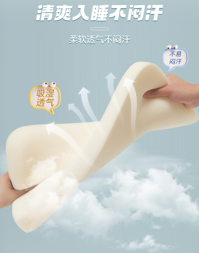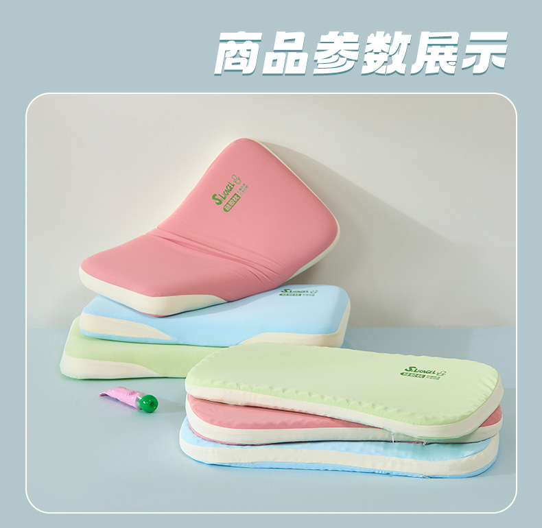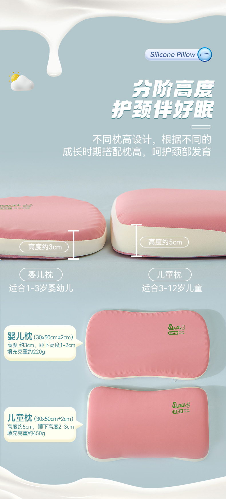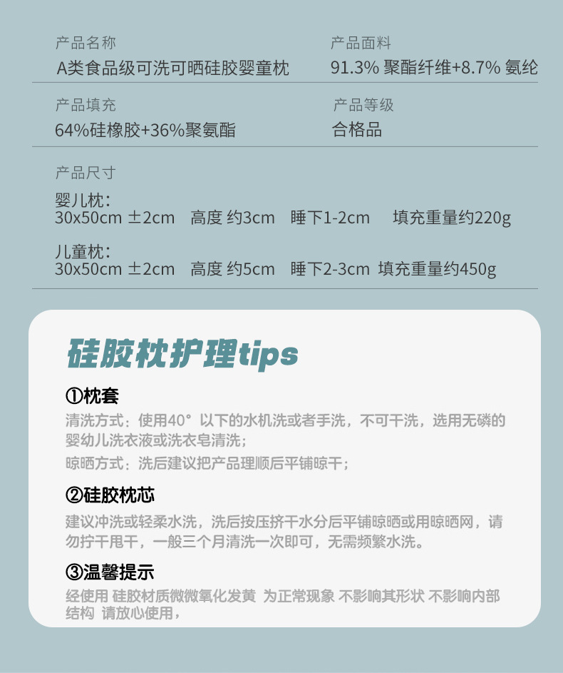 高度、填充重量: 婴儿枕:30x50cm ±2cm,高度 约3cm,睡下1-2cm,约220g 儿童枕:30x50cm ±2cm,高度 约5cm,睡下2-3cm,约450g