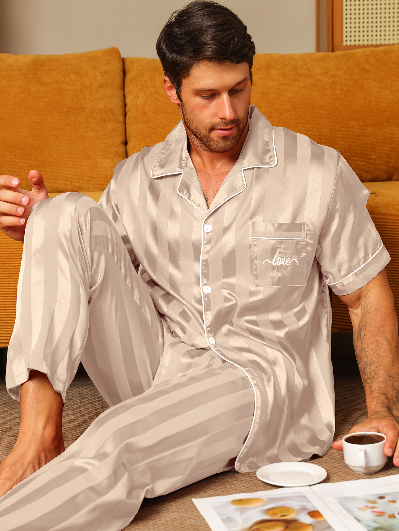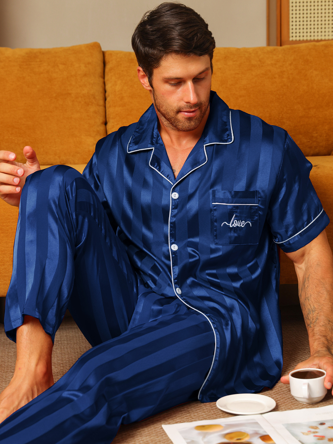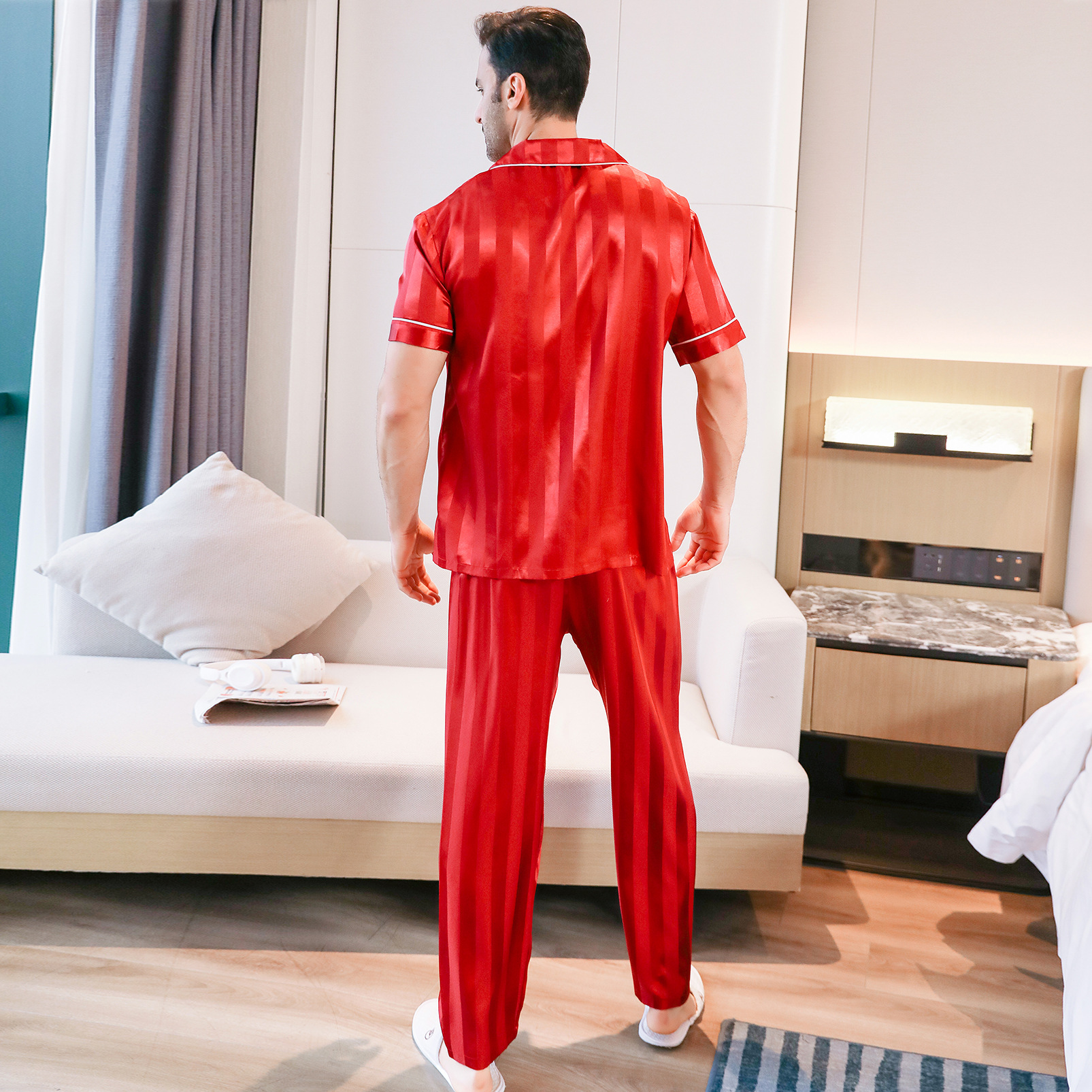 국경 간 파자마 남자 여름 반팔 긴 얇은 실크 세트 카디건 빨간 모조 실크 남자 홈 옷