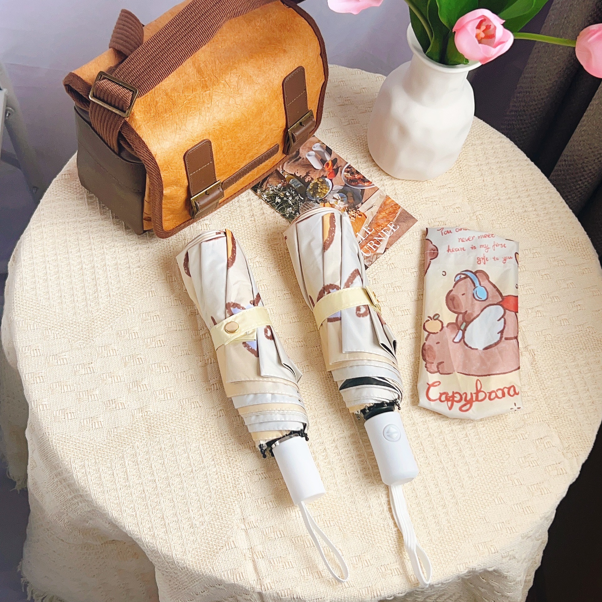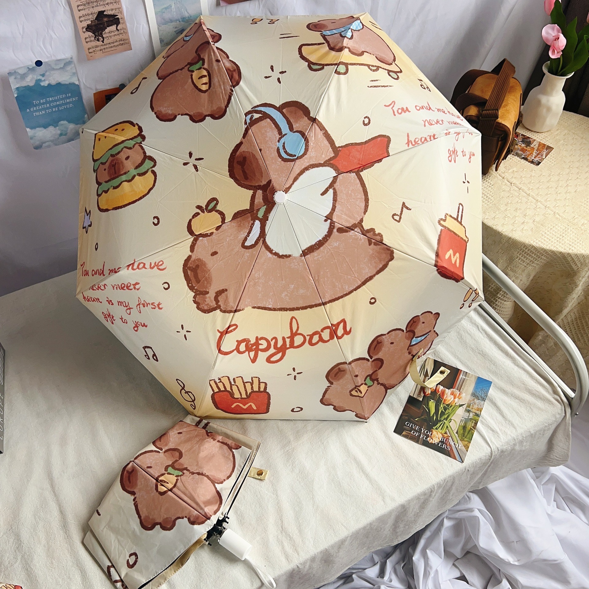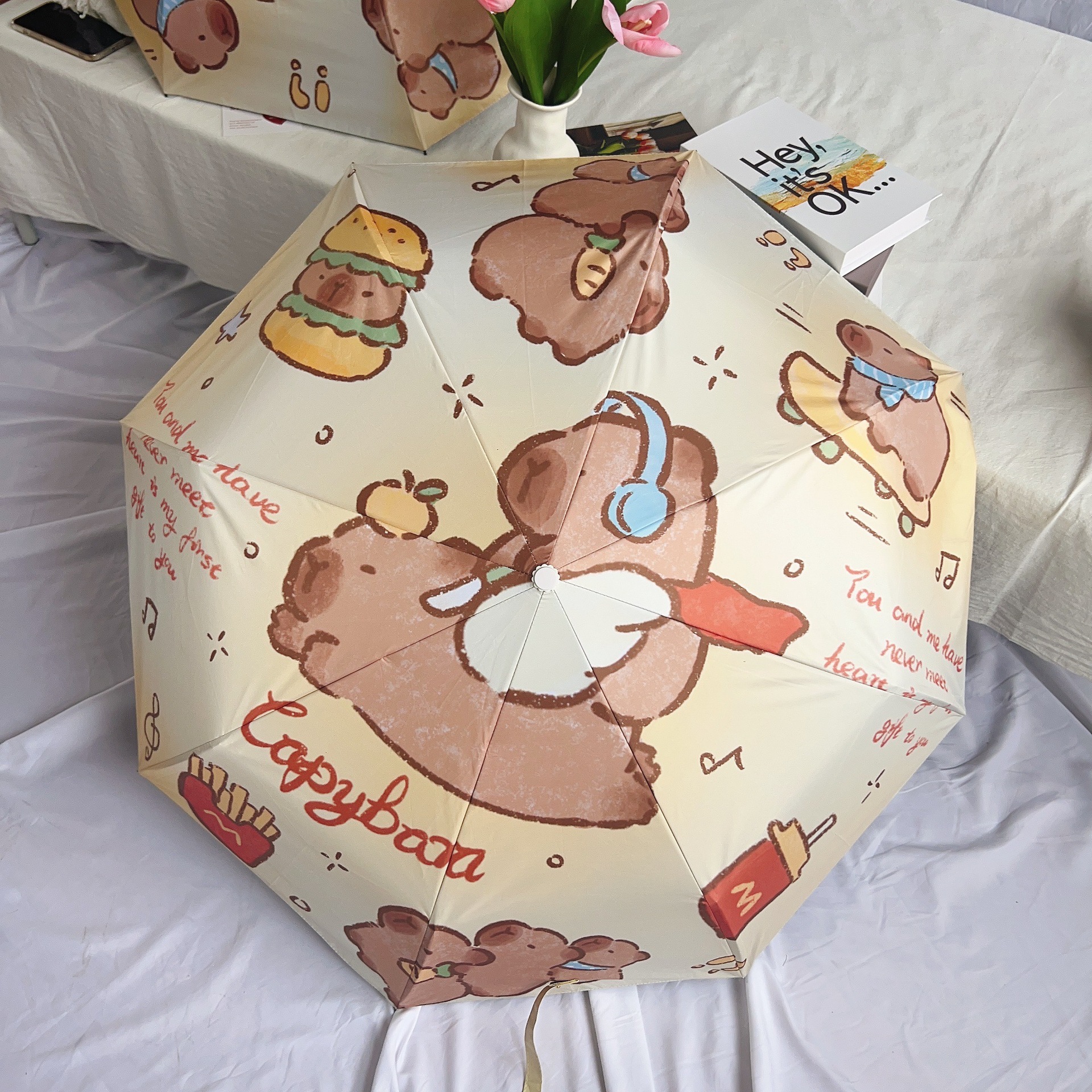 Capibala 자동 우산 Ins 틈새 만화 Capybara Sunny와 비오는 이중 사용 바람 저항하는 내구성있는 양산 여학생스토어 가기