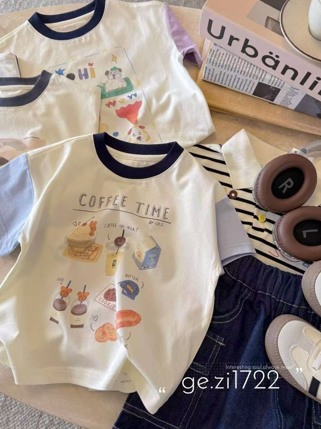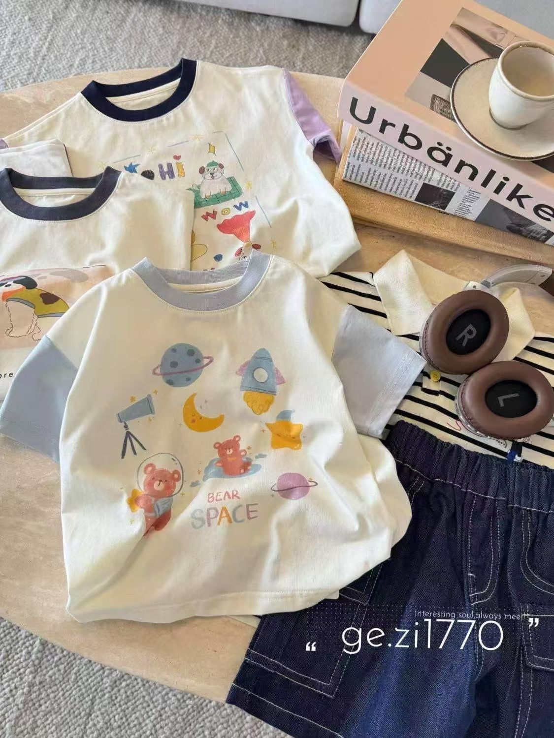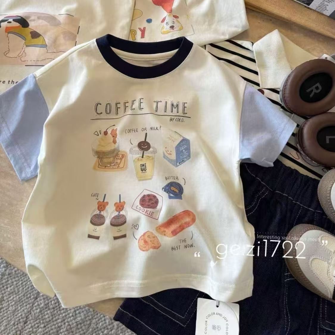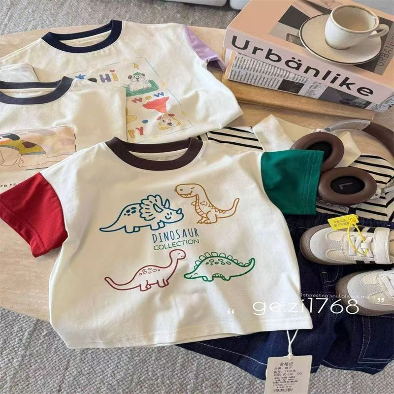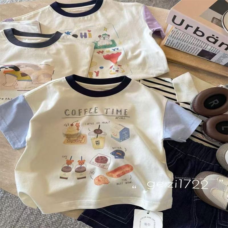 어린이 새 소년과 소녀 여름 만화 컬러 매칭 아기의 반소매 코튼 서양식 티셔츠 반소매 어린이 탑스토어 가기