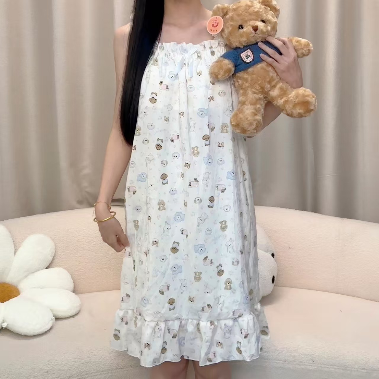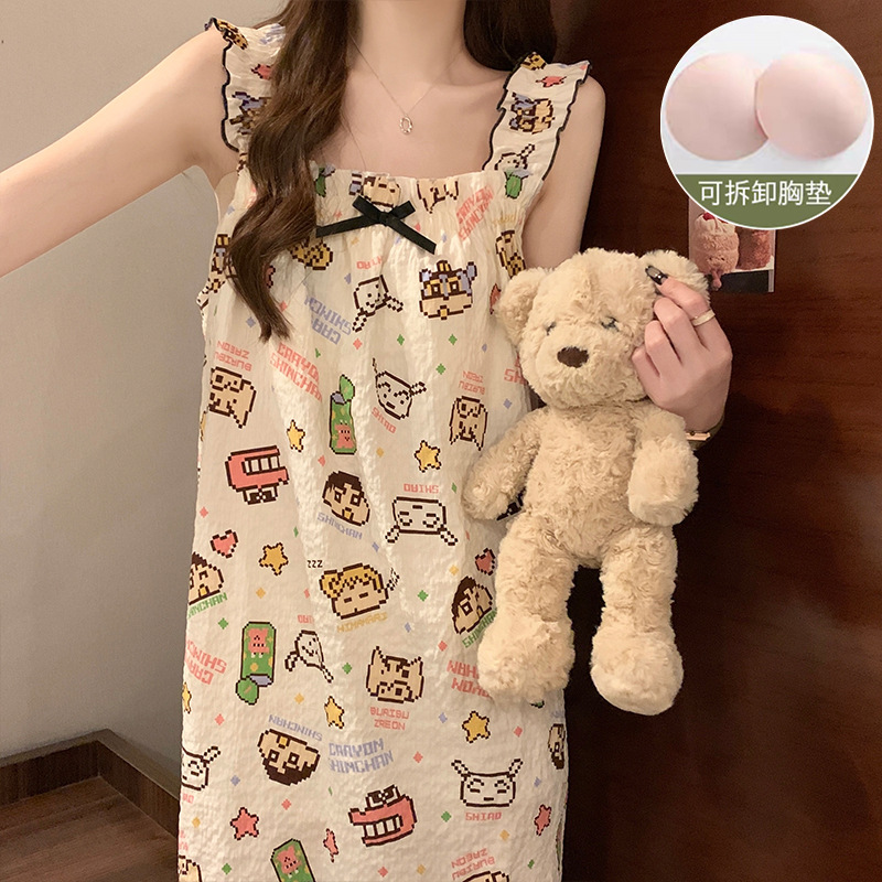 여자 여름 가슴 패드와 얇은 민소매 나이트 드레스 일본 스타일 귀여운 달콤한 소녀의 슬링 중간 길이 원피스 홈 옷