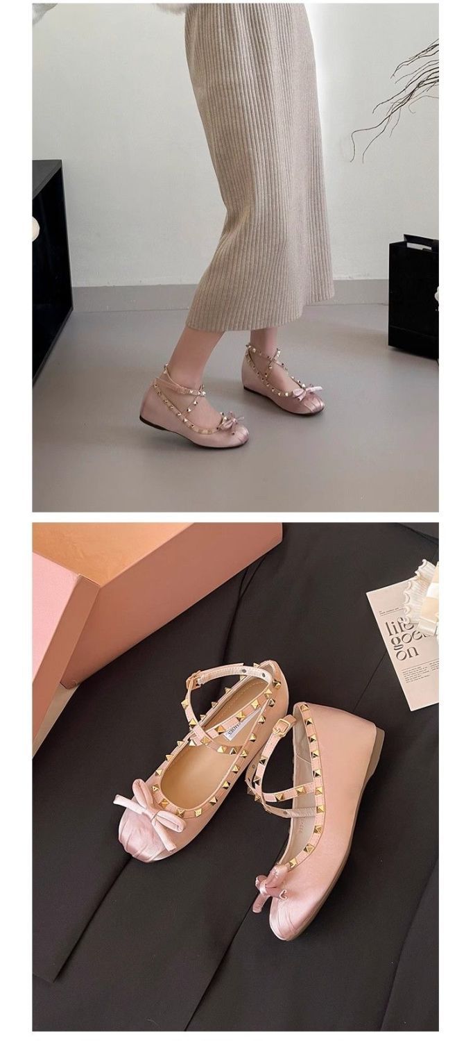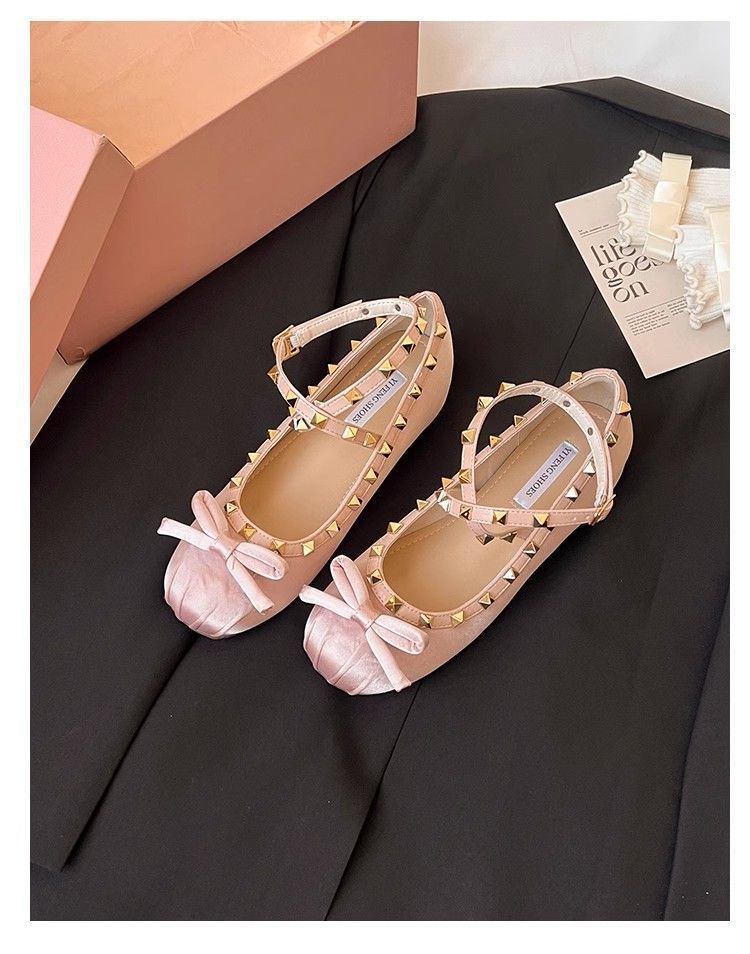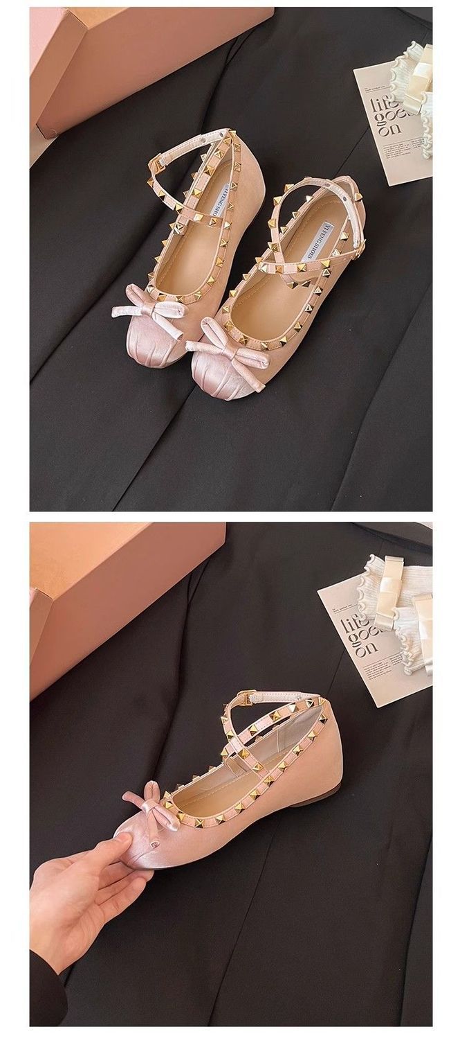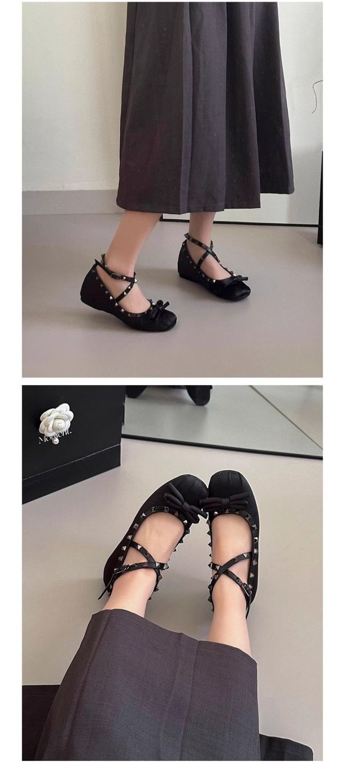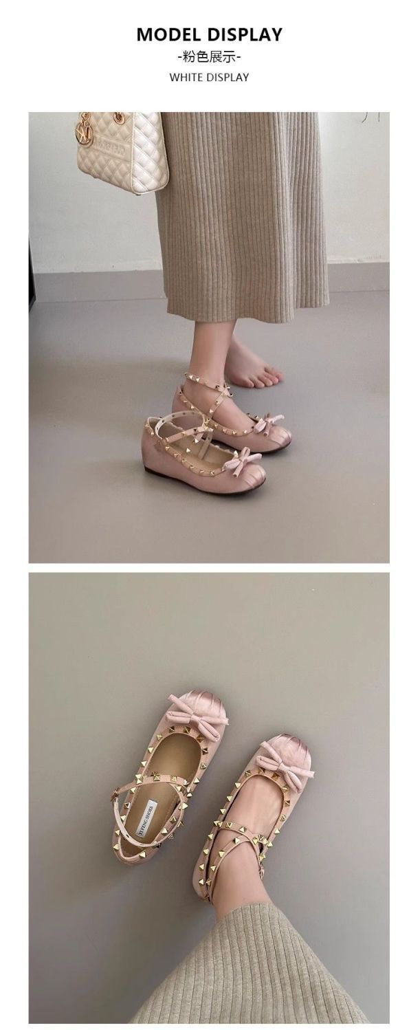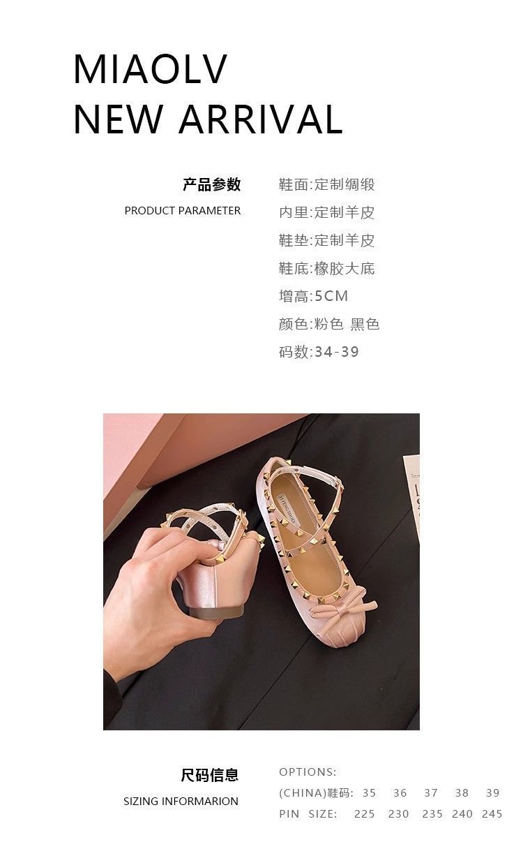 양가죽 버전 ~ 5CM 고층 평평한 바닥 메리 제인 신발 활 얕은 새틴 리벳 크로스 스트랩 발레 슈즈스토어 가기