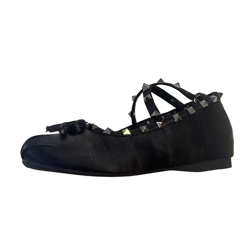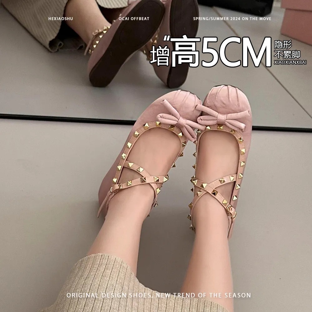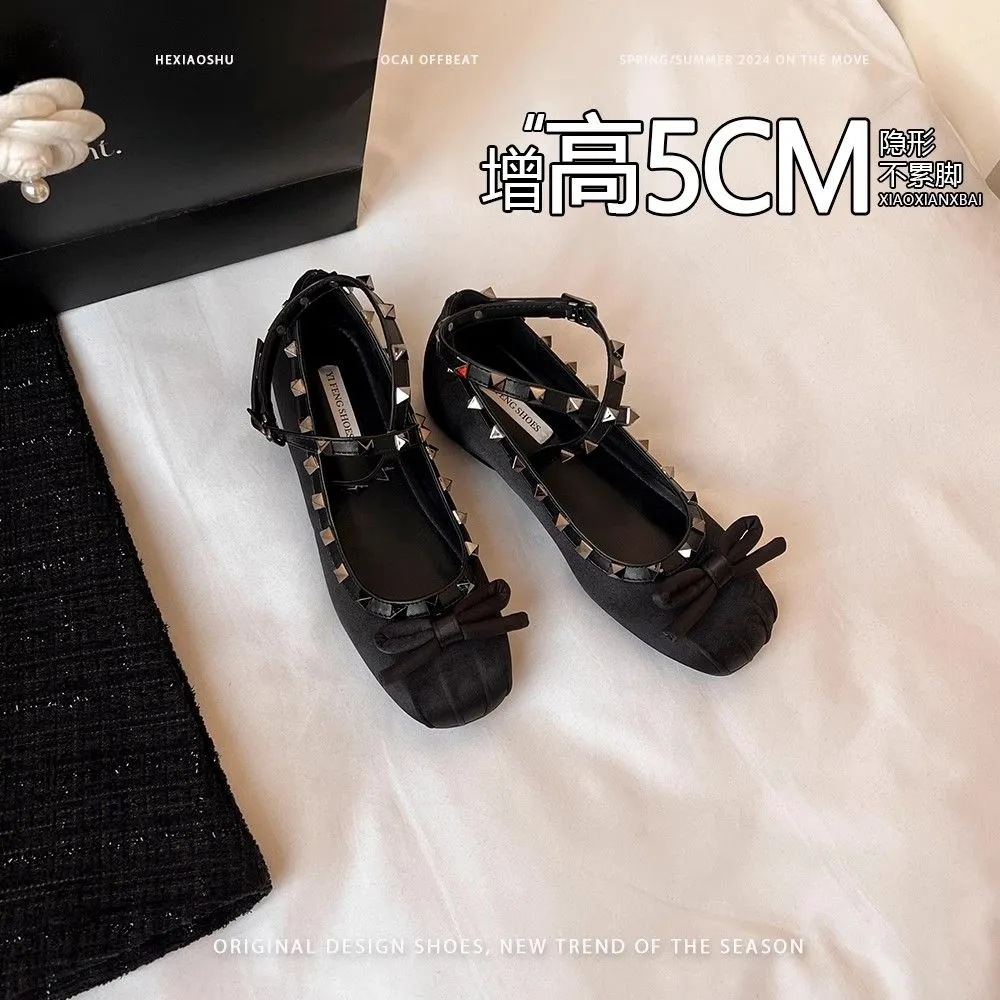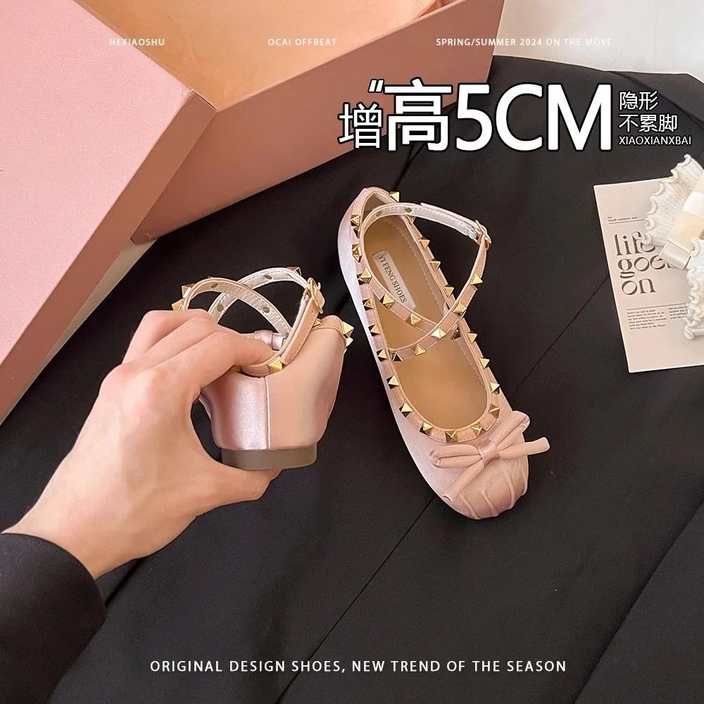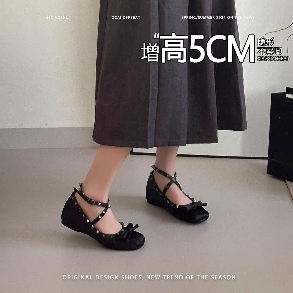 양가죽 버전 ~ 5CM 고층 평평한 바닥 메리 제인 신발 활 얕은 새틴 리벳 크로스 스트랩 발레 슈즈
