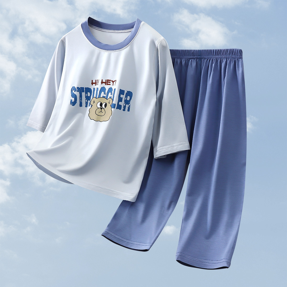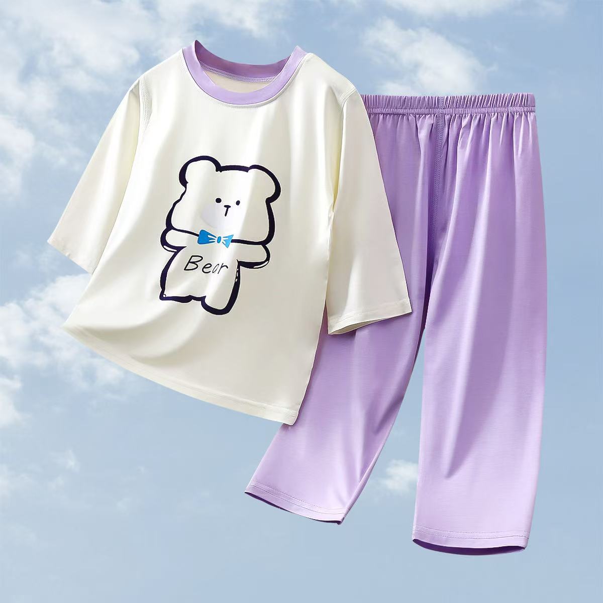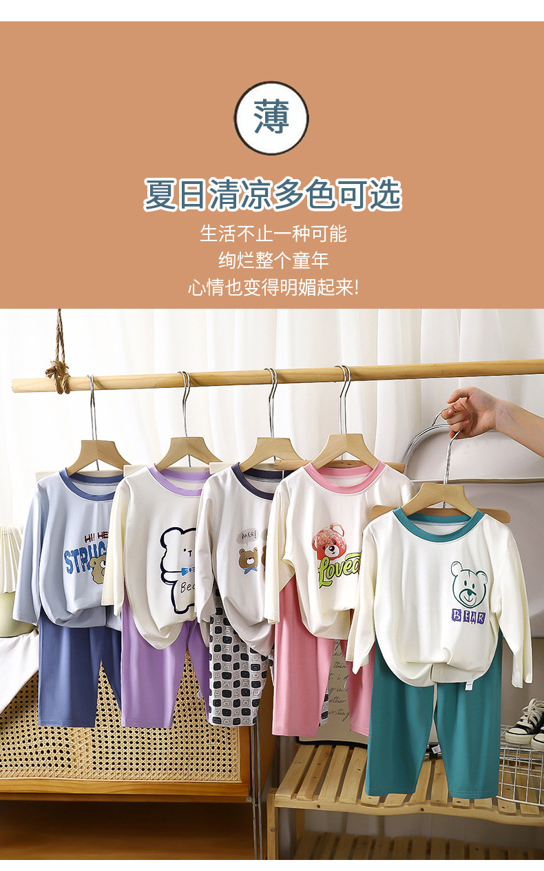 2025 여름 새 소년 소녀 7 점 슬리브 홈 옷 땀 흡수성 통기성 어린이 7 점 슬리브 에어컨 세트