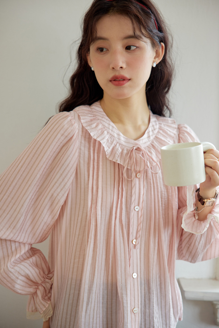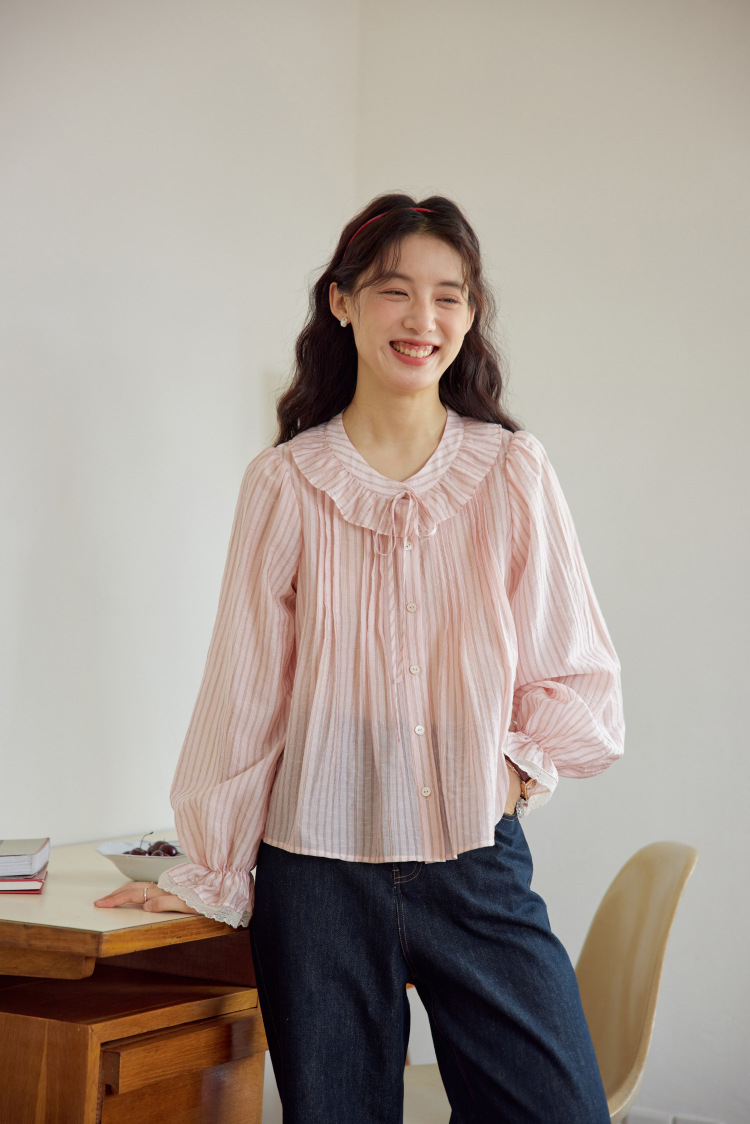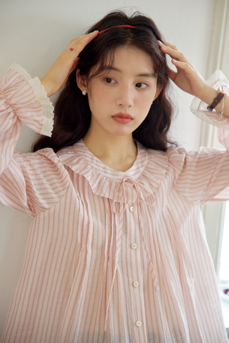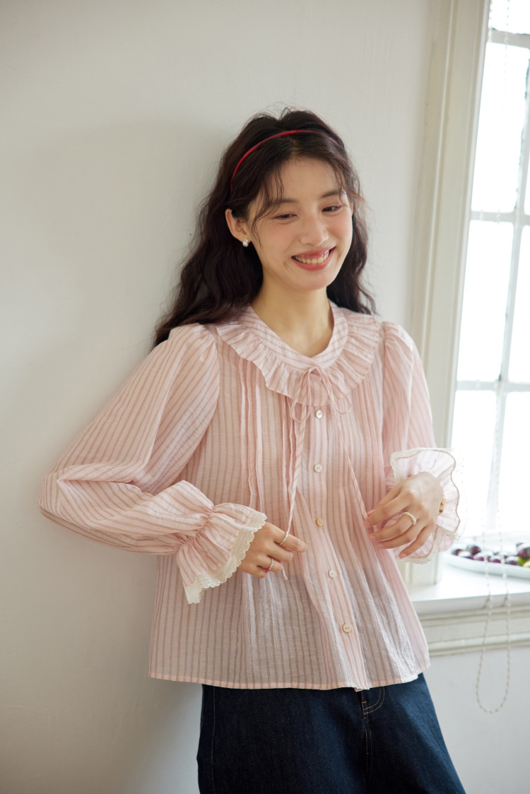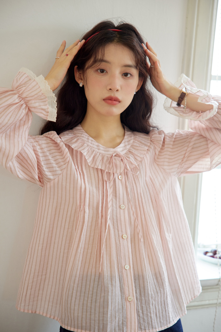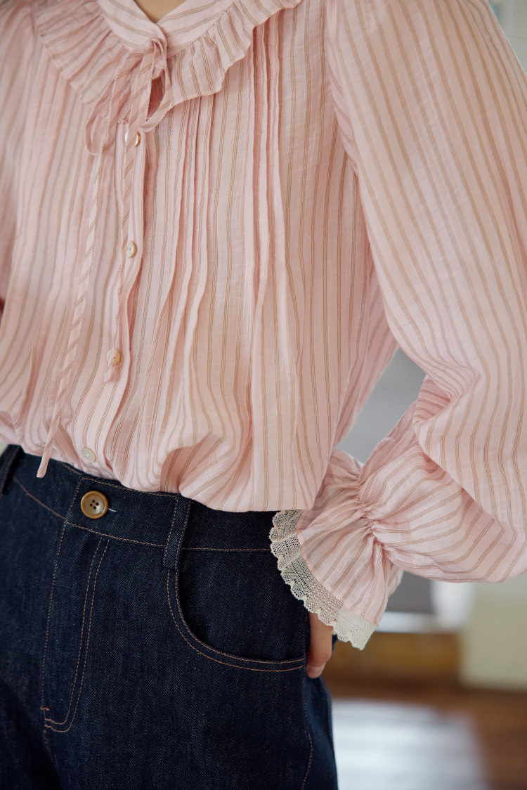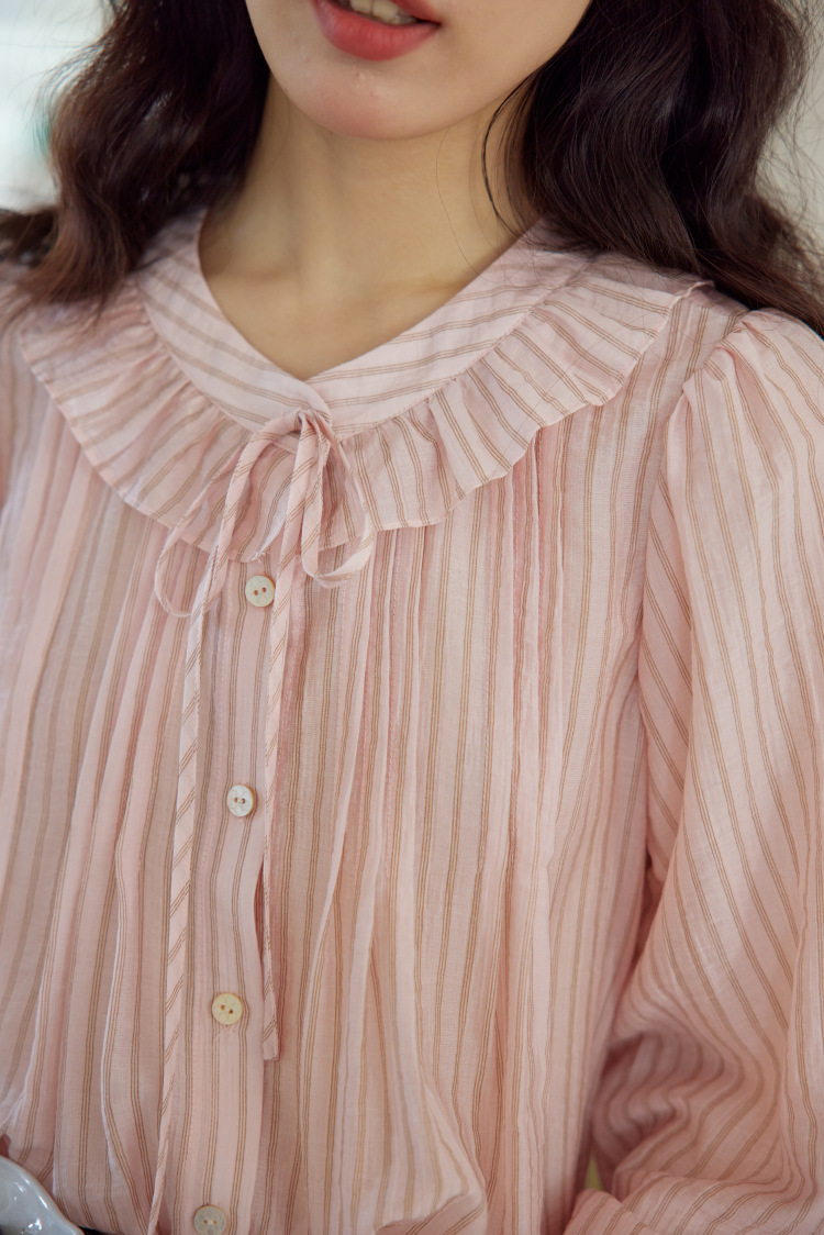 11 월 엘리스트 1 프랑스 핑크 스트라이프 러플 칼라 레이스 업 탑 봄 긴 소매 셔츠