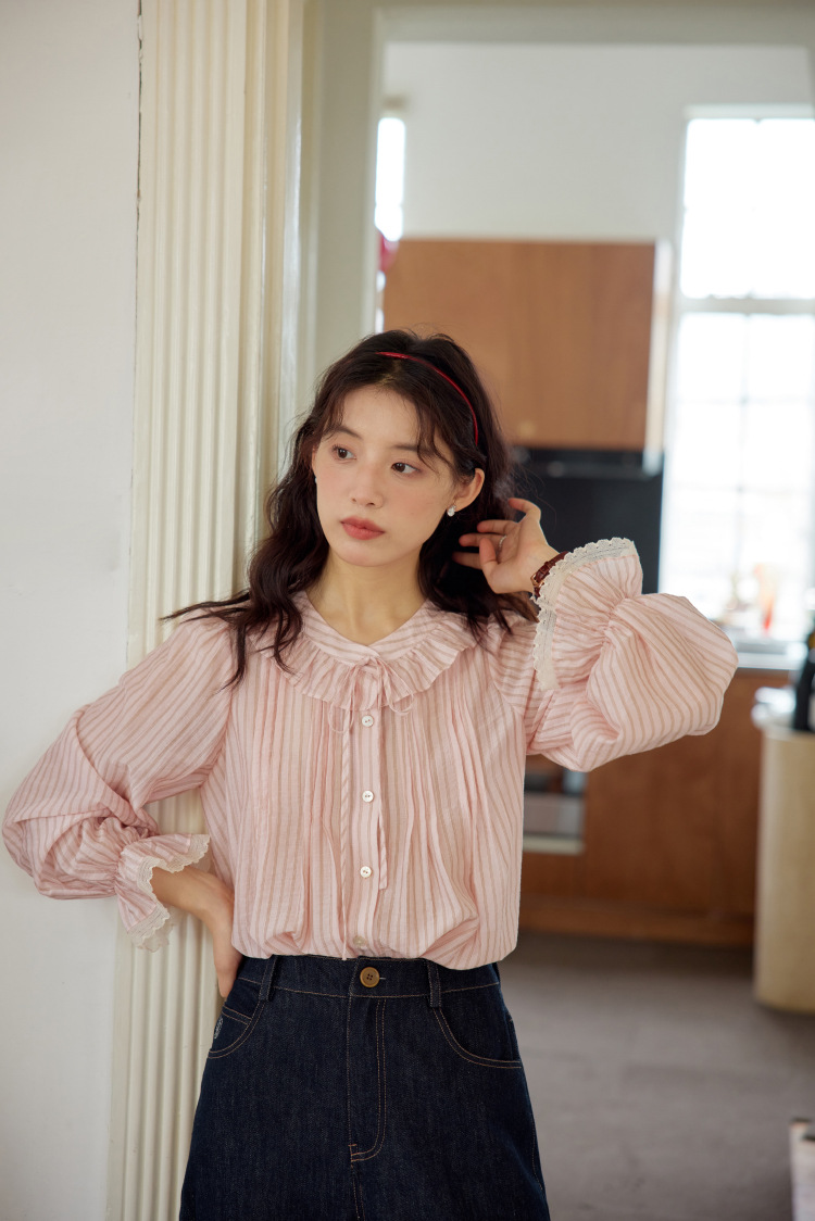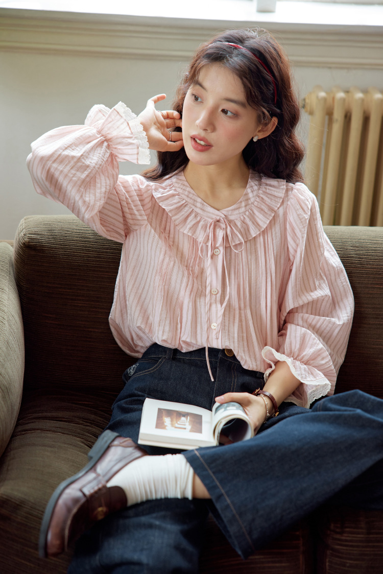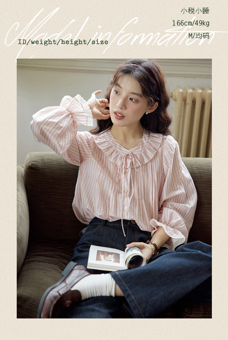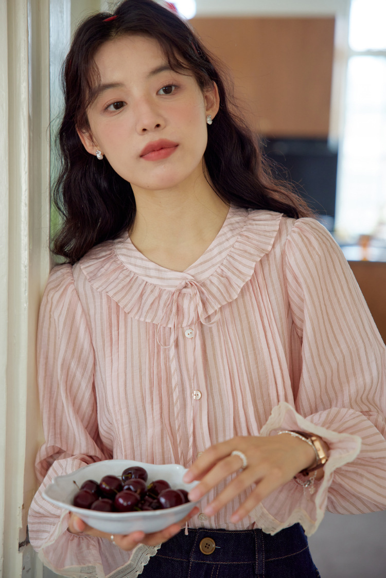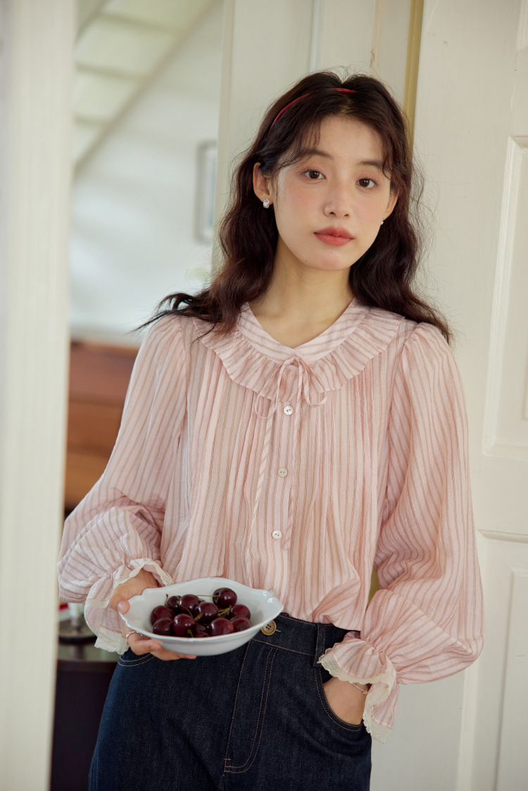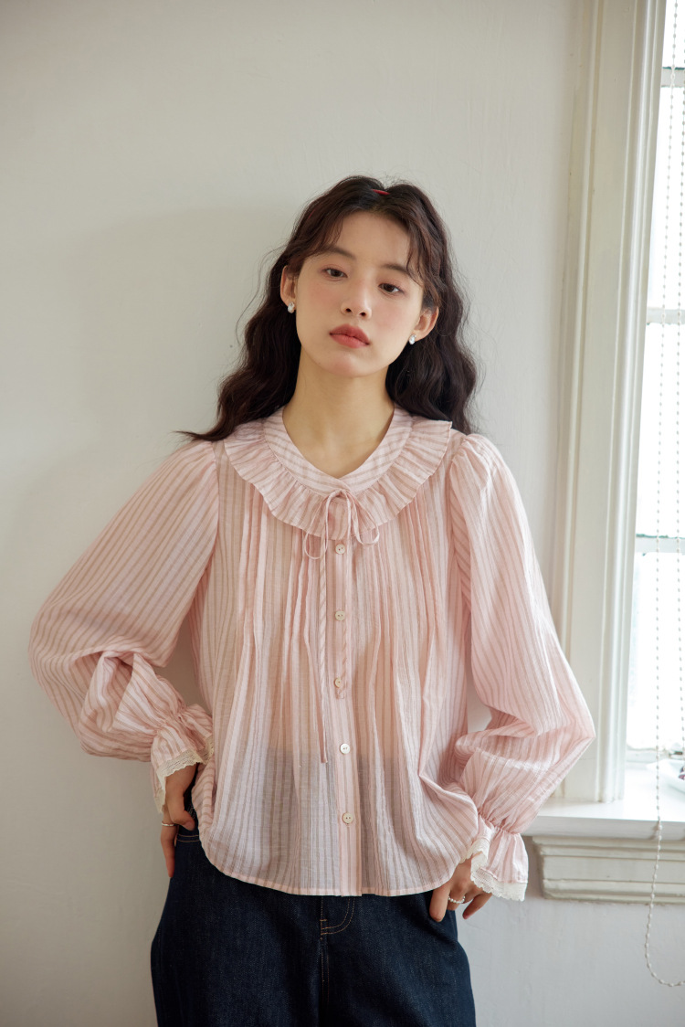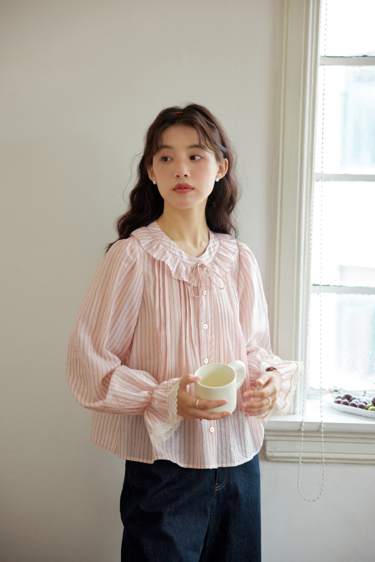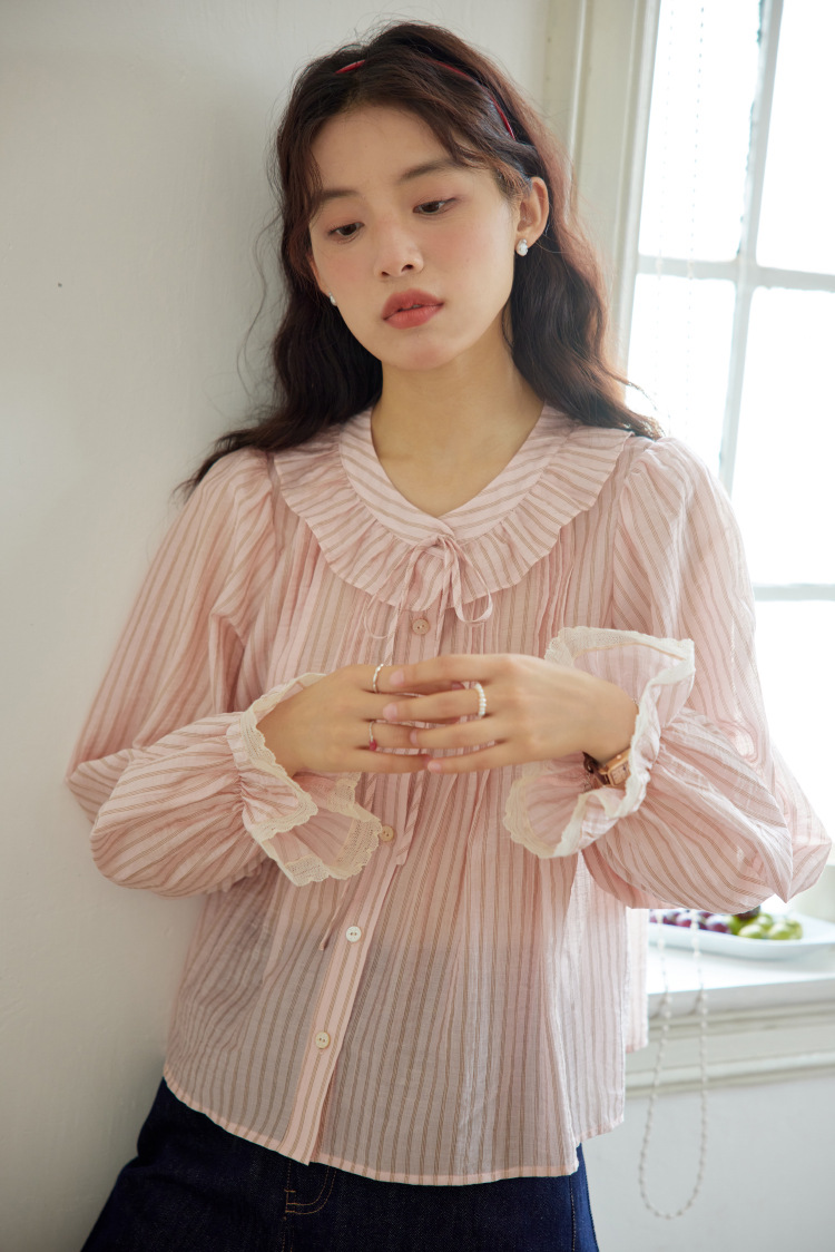 11 월 엘리스트 1 프랑스 핑크 스트라이프 러플 칼라 레이스 업 탑 봄 긴 소매 셔츠