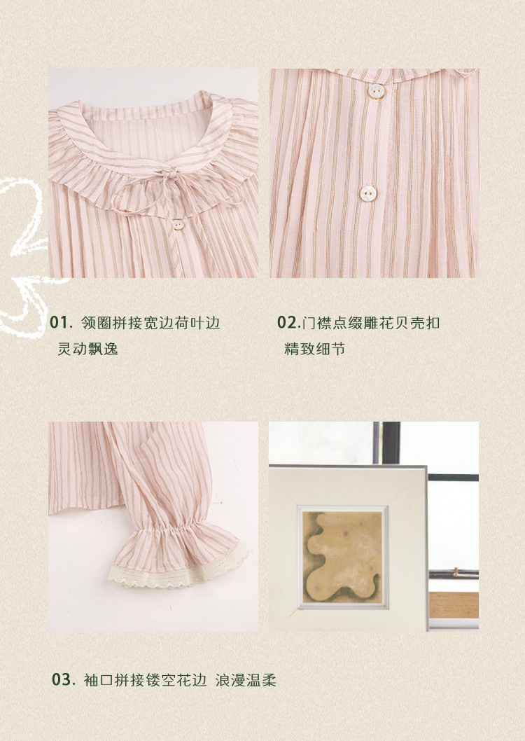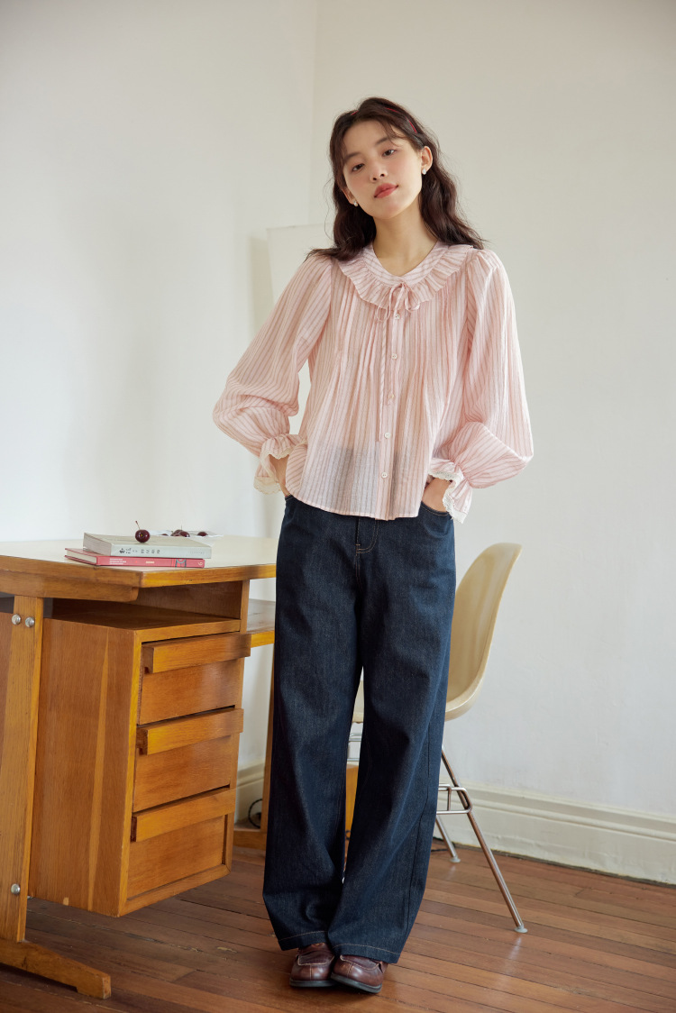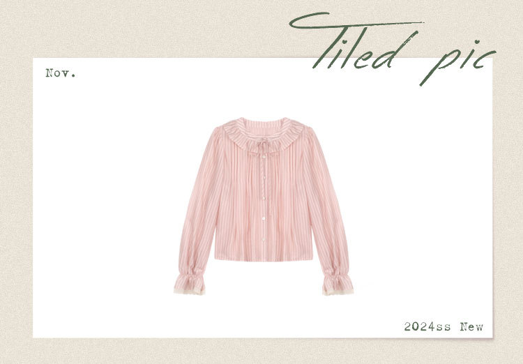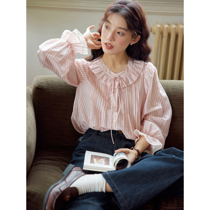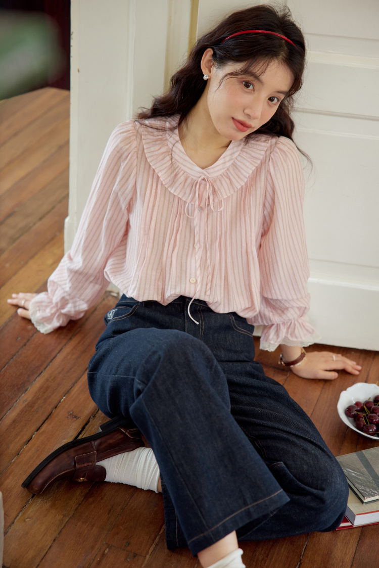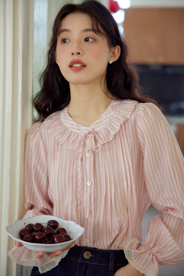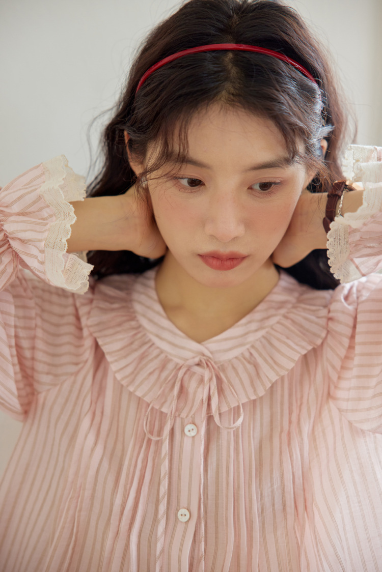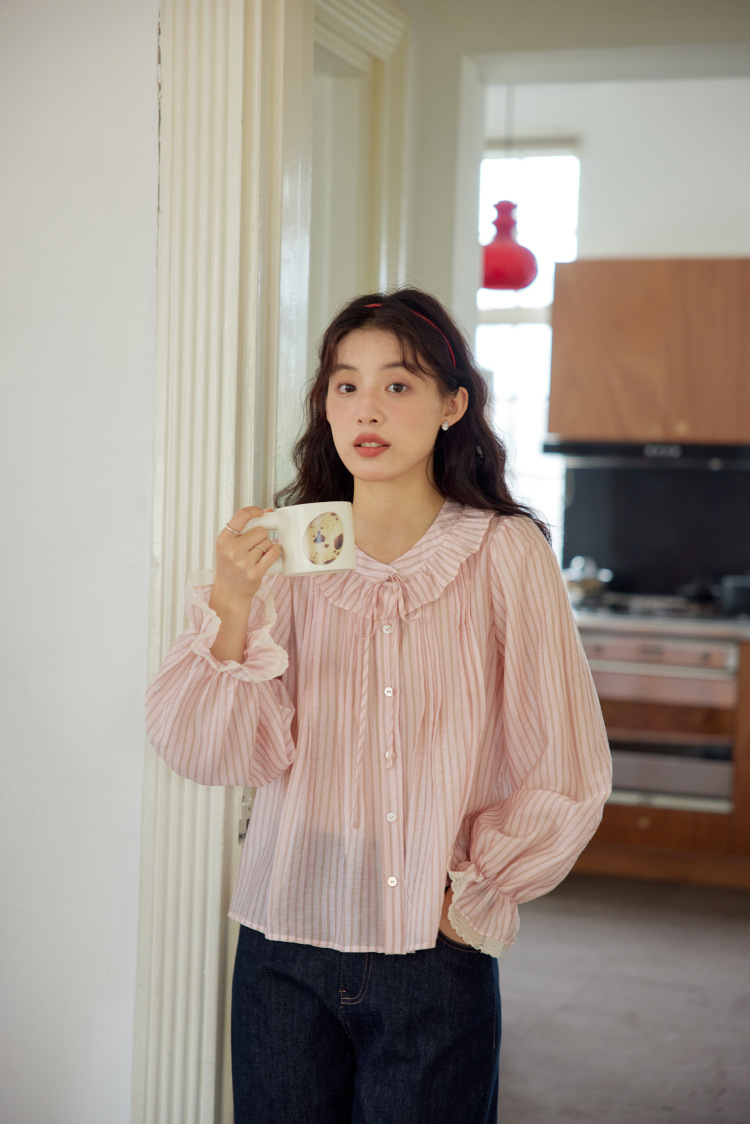11 월 엘리스트 1 프랑스 핑크 스트라이프 러플 칼라 레이스 업 탑 봄 긴 소매 셔츠