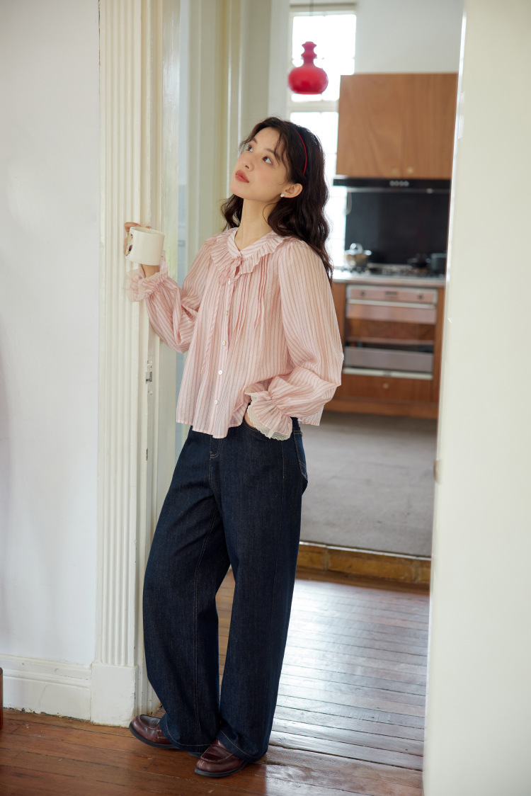 11 월 엘리스트 1 프랑스 핑크 스트라이프 러플 칼라 레이스 업 탑 봄 긴 소매 셔츠스토어 가기