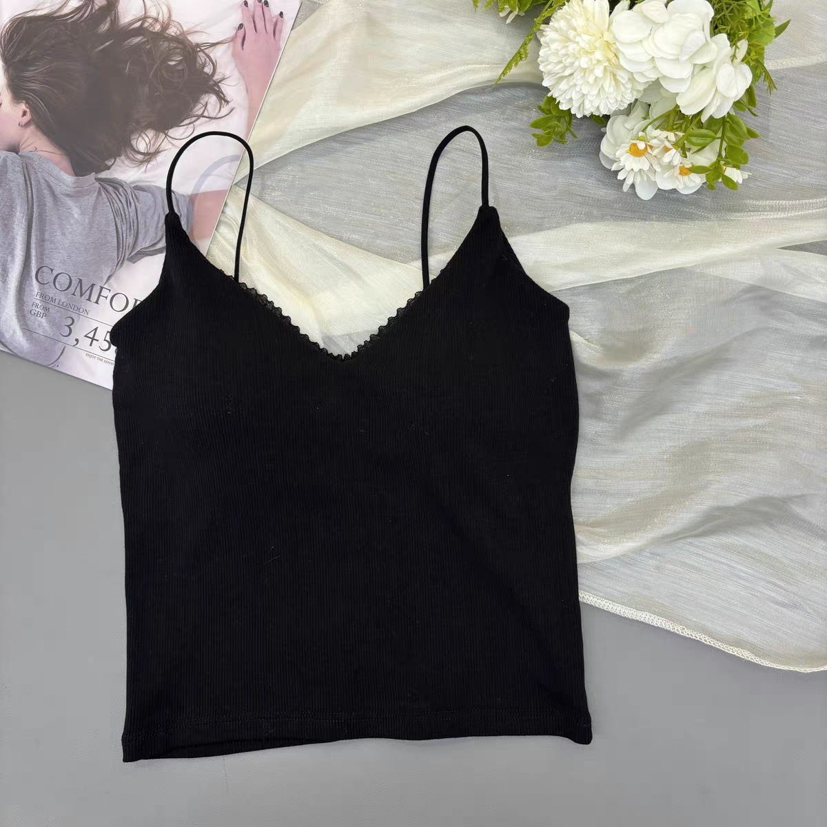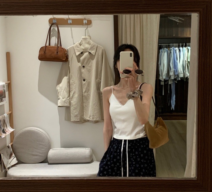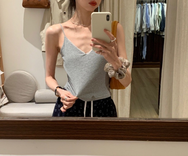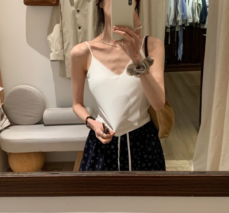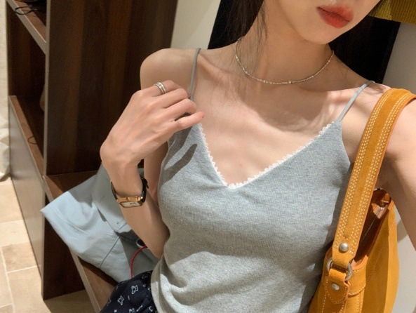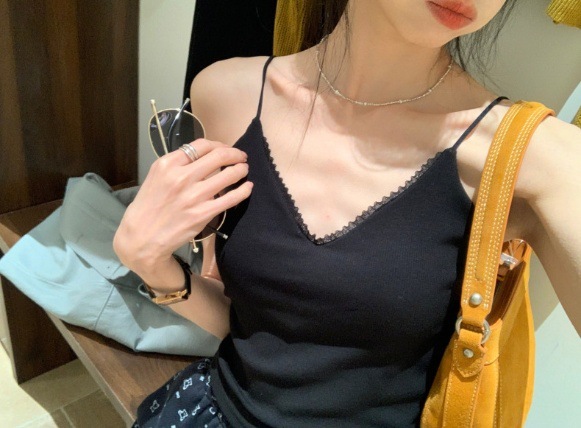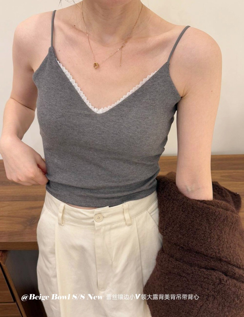 레이스 패션 얇은 어깨 스트랩 전면 및 후면 대형 V 디자인 작은 슬링 아름다운 등 가슴 패드 내부 착용 외부 착용 조끼 탑