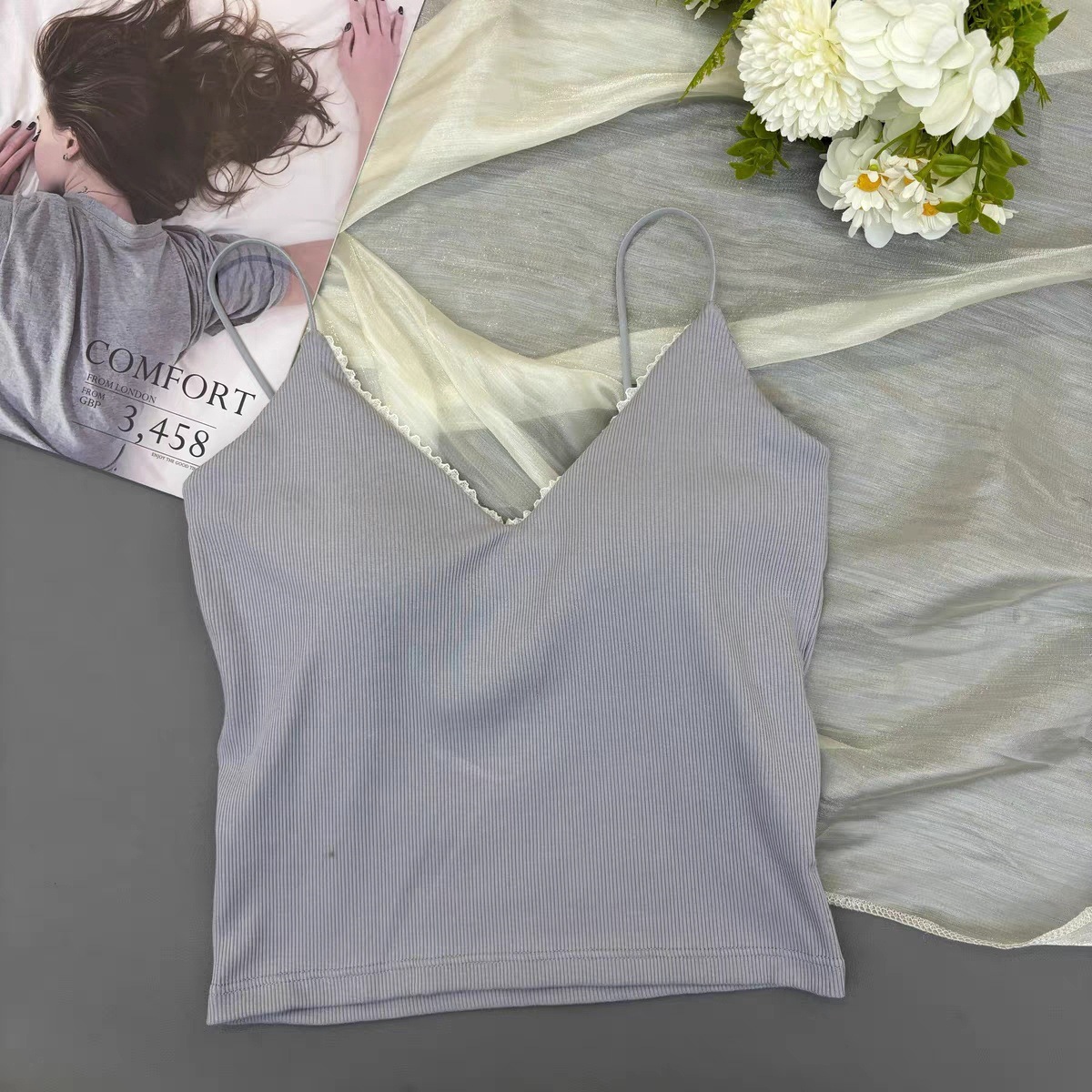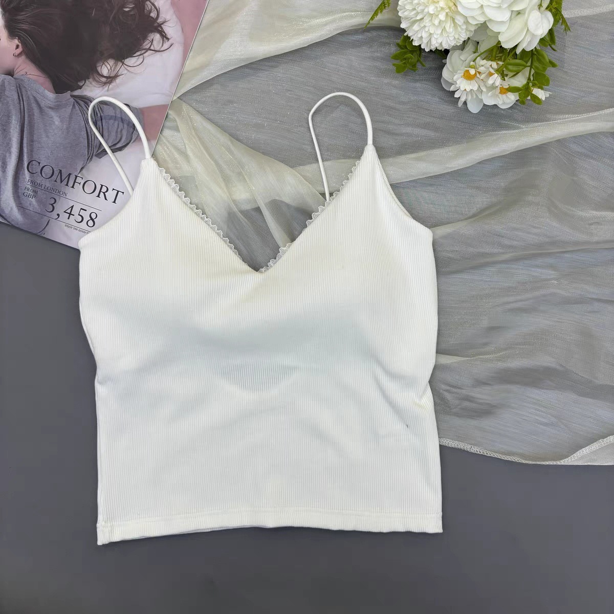 레이스 패션 얇은 어깨 스트랩 전면 및 후면 대형 V 디자인 작은 슬링 아름다운 등 가슴 패드 내부 착용 외부 착용 조끼 탑스토어 가기