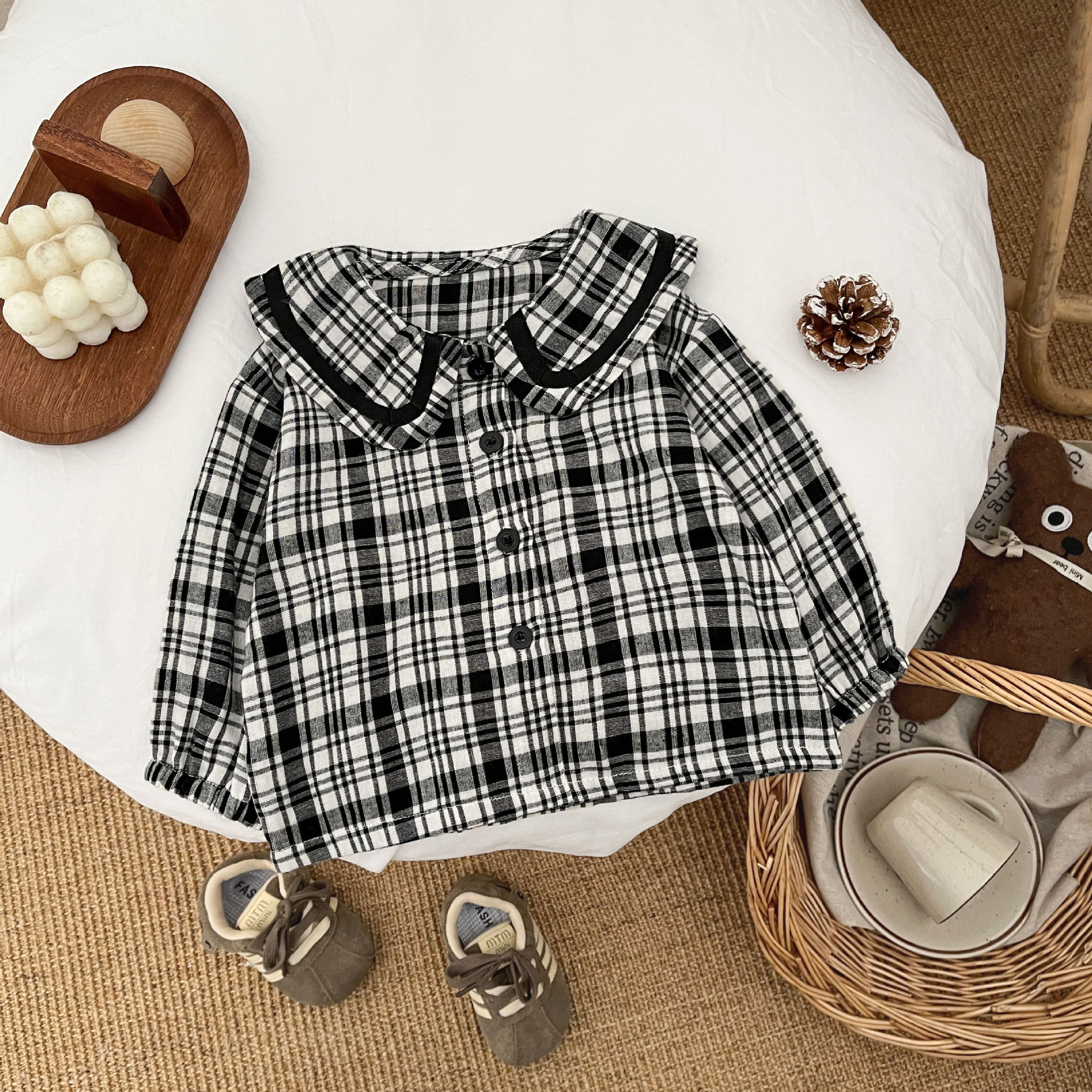 한국 아동복 어린이 셔츠 2025 봄 새로운 소녀 패션 복고풍 컬러 체크 인형 칼라 셔츠 조수스토어 가기