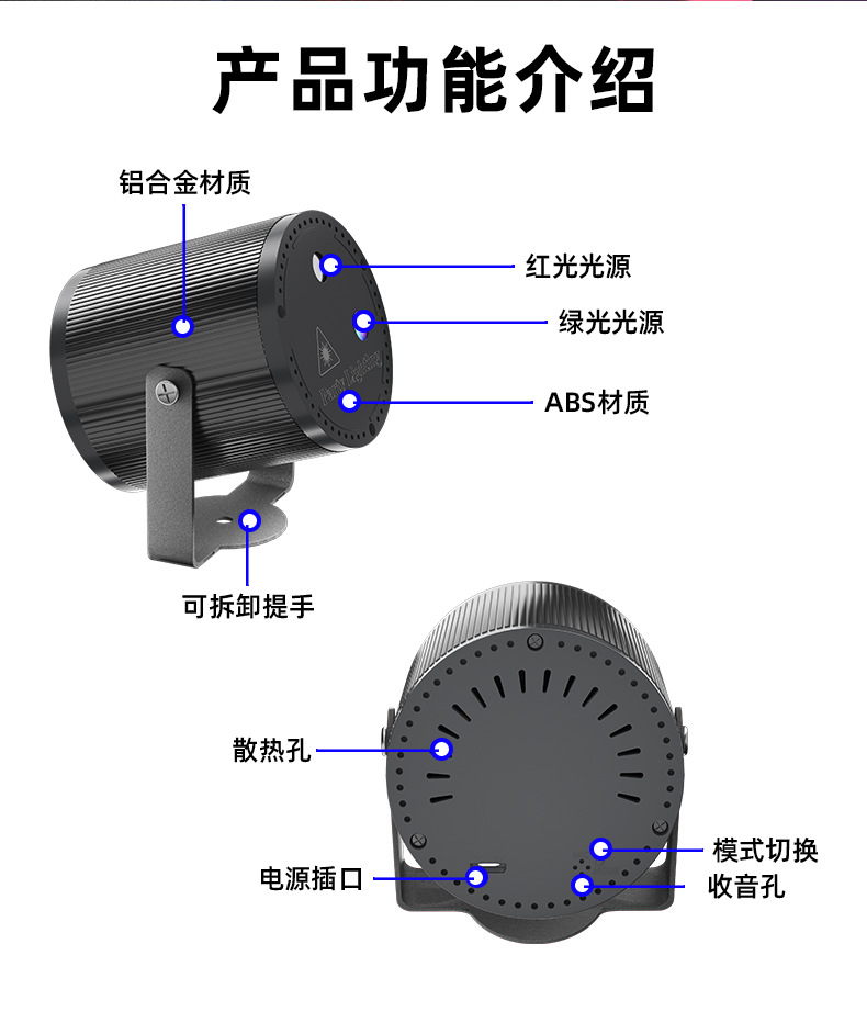 特点:红绿激光图案16图,红光绿光图案交错辉映变化,在幽暗的环境下更有氛围,外形小巧的设计,拿在手中,挂在墙上都会带来不同的体验。