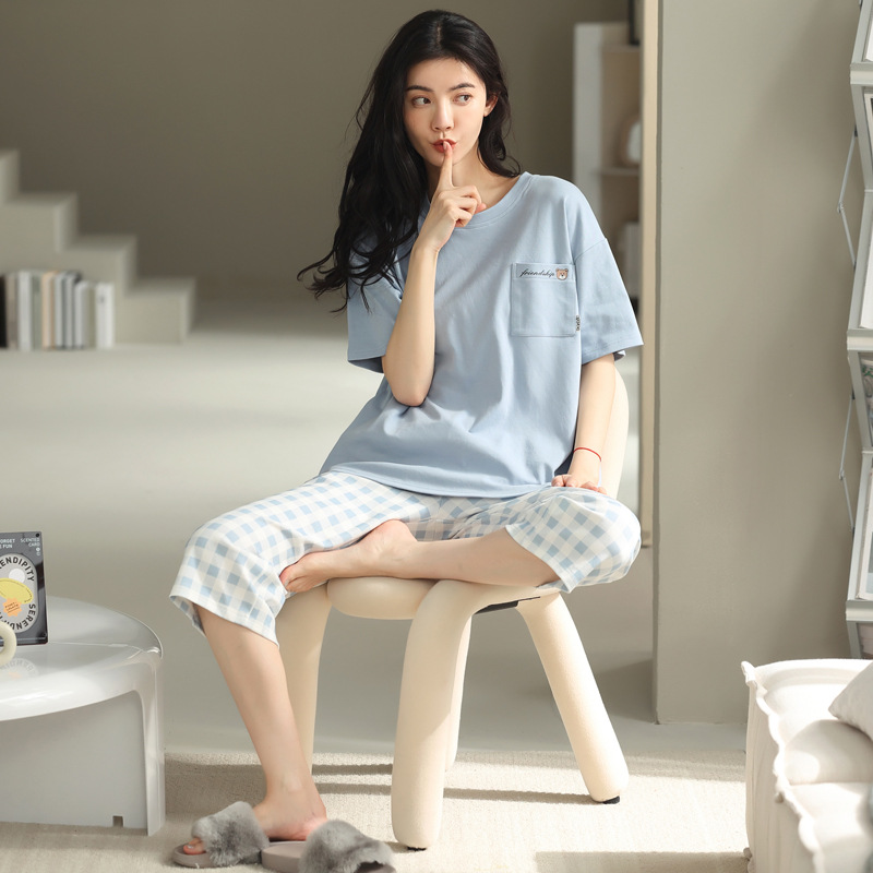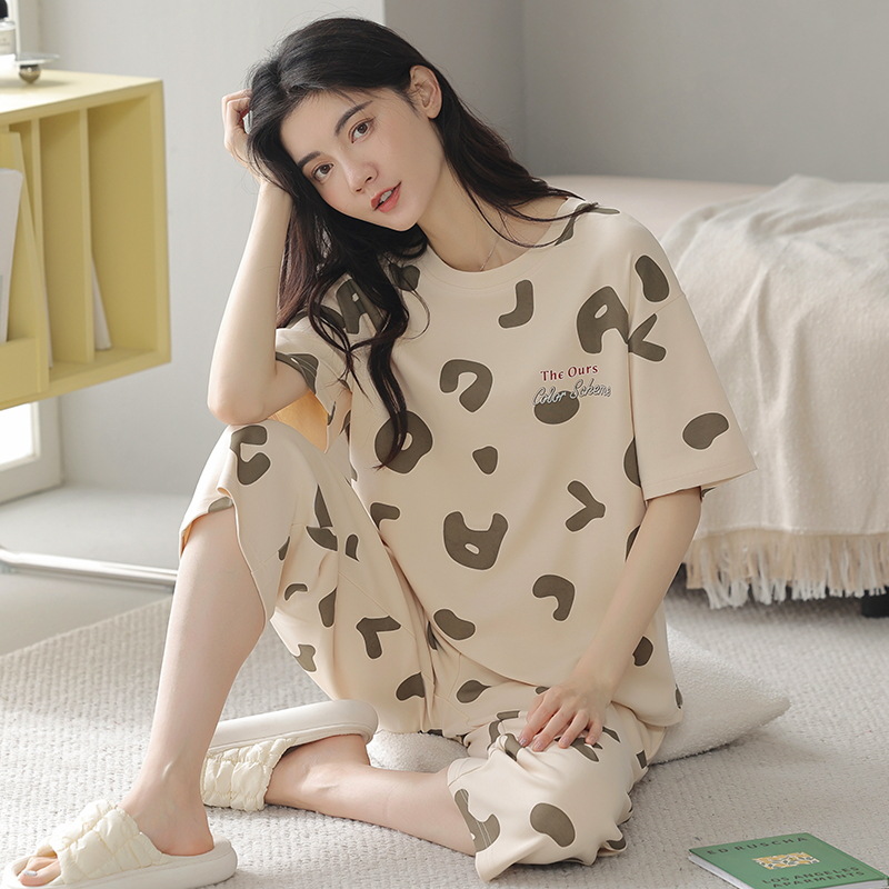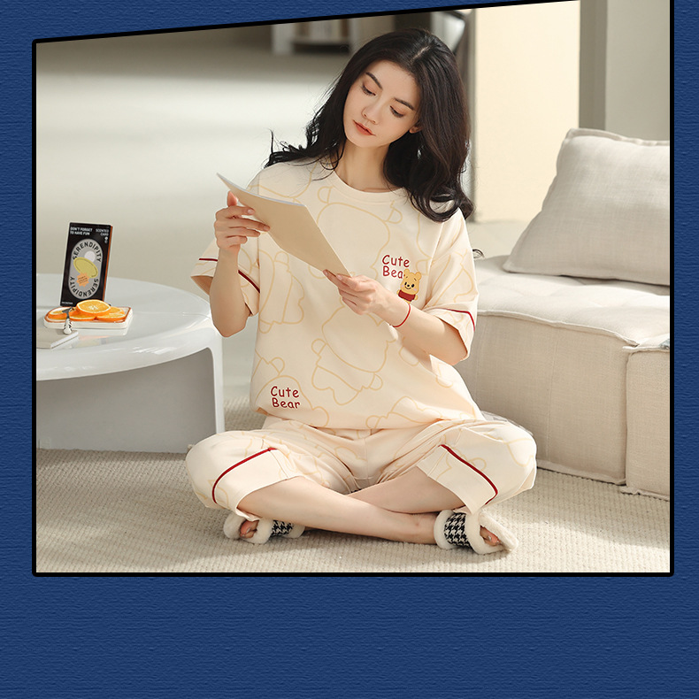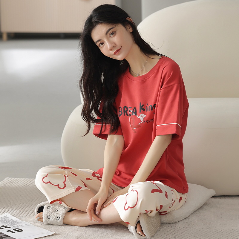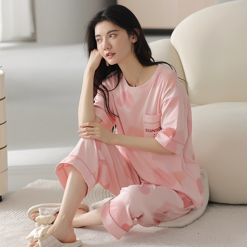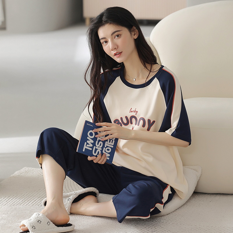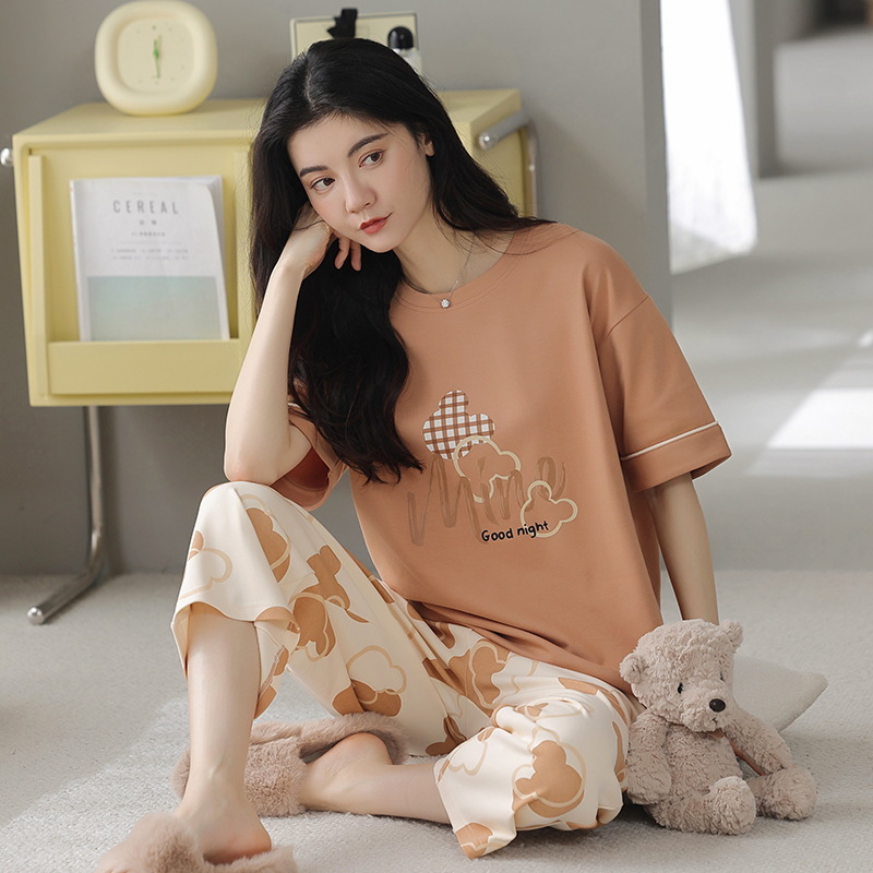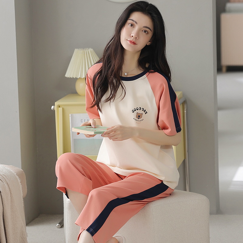 잠옷 여성 여름 코튼 새 여름 반팔 자른 바지 둥근 목 바깥 쪽 면화 홈 의류 세트 입고스토어 가기