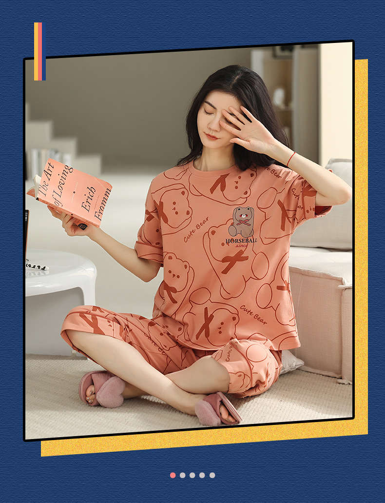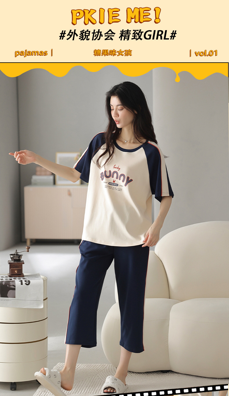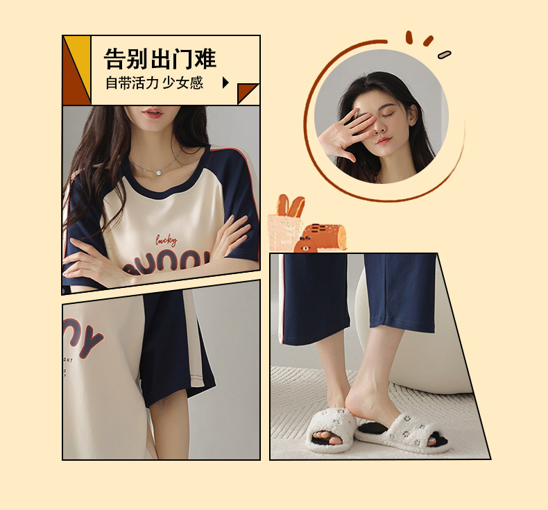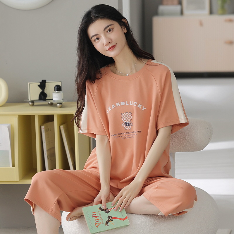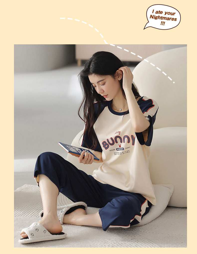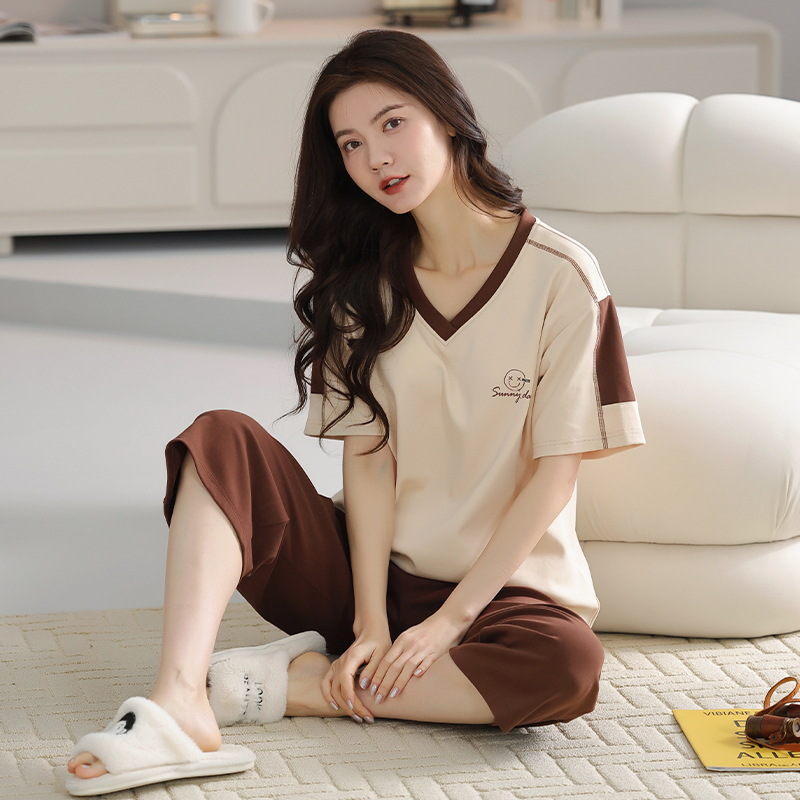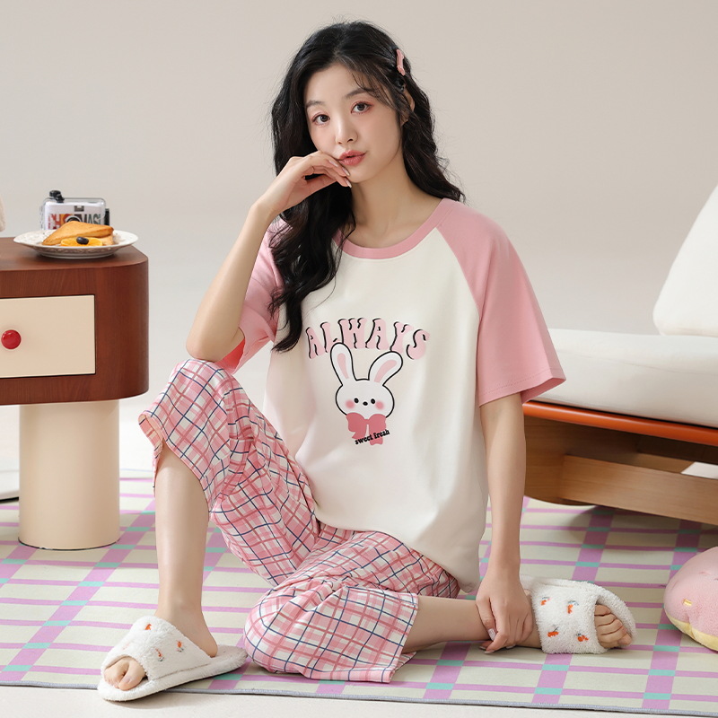 잠옷 여성 여름 코튼 새 여름 반팔 자른 바지 둥근 목 바깥 쪽 면화 홈 의류 세트 입고스토어 가기