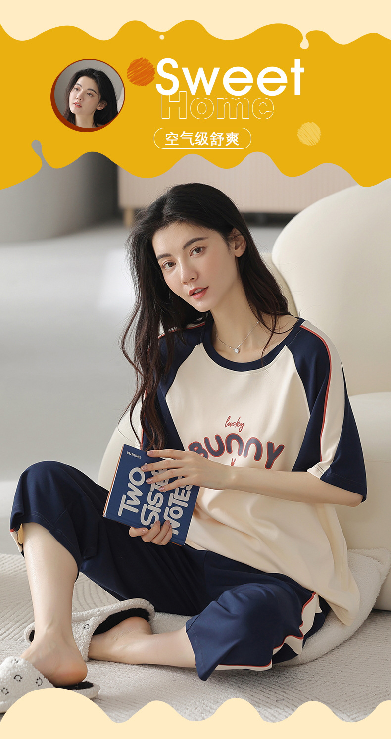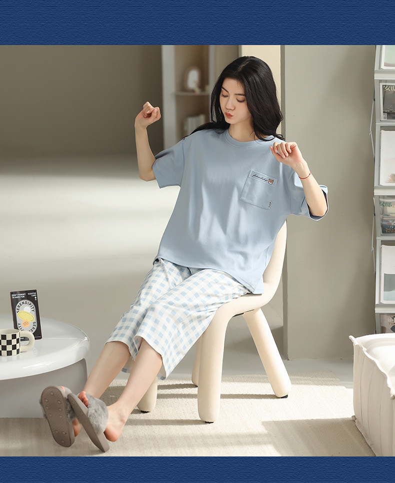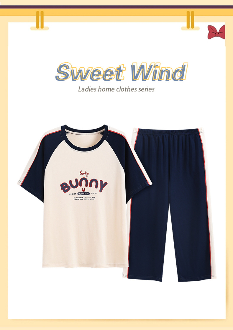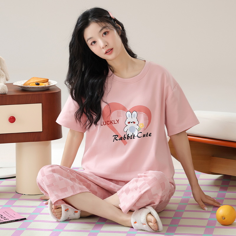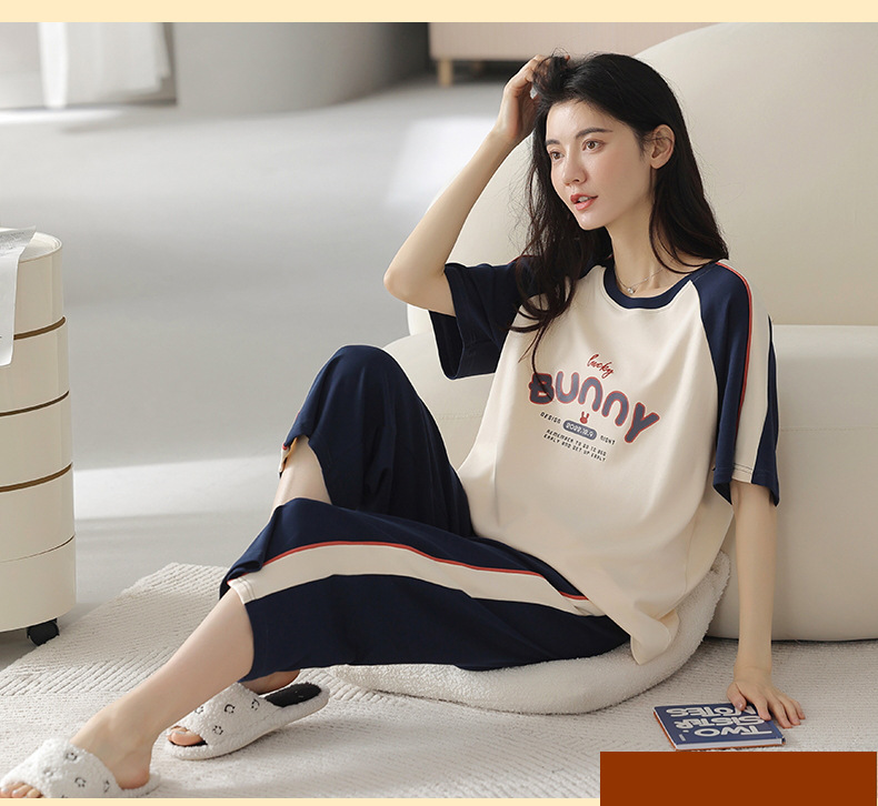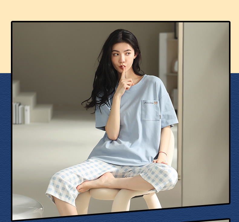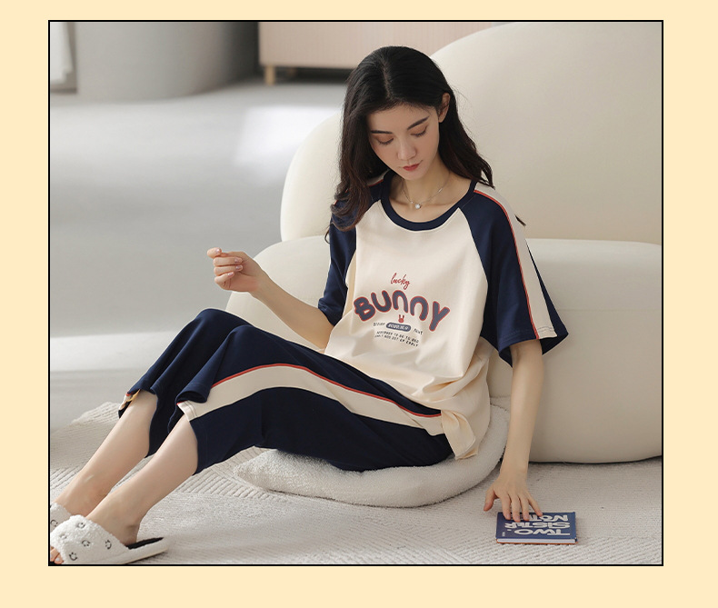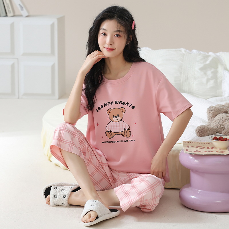 잠옷 여성 여름 코튼 새 여름 반팔 자른 바지 둥근 목 바깥 쪽 면화 홈 의류 세트 입고스토어 가기