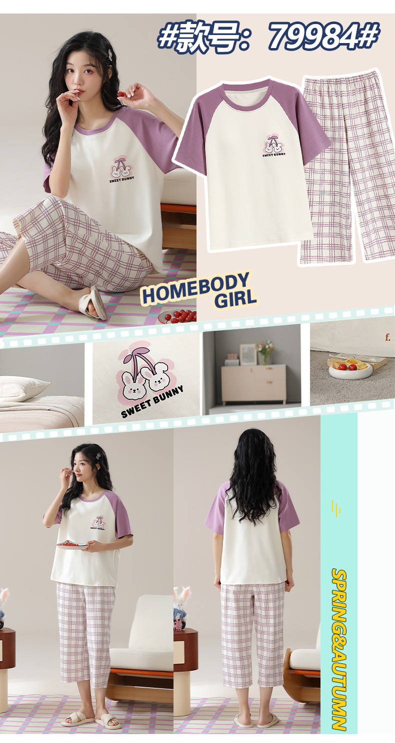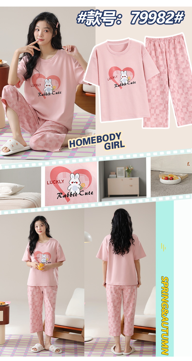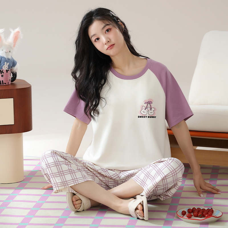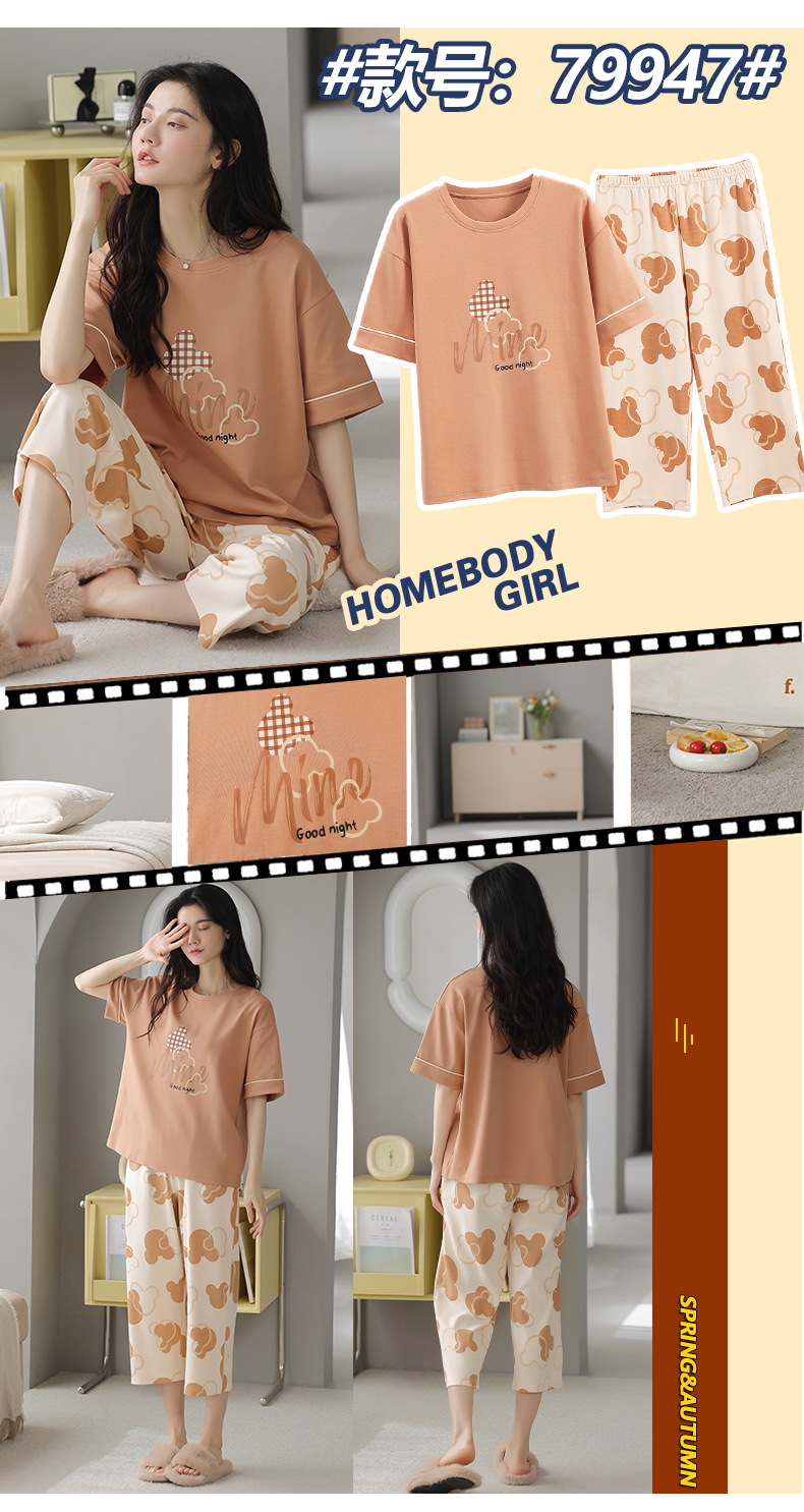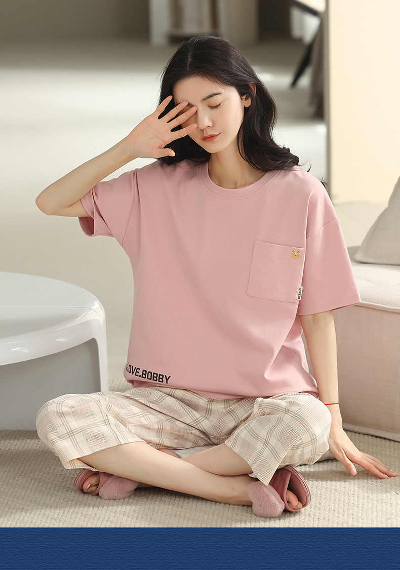 잠옷 여성 여름 코튼 새 여름 반팔 자른 바지 둥근 목 바깥 쪽 면화 홈 의류 세트 입고스토어 가기