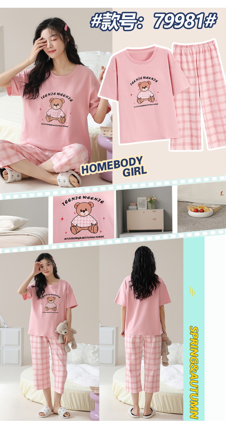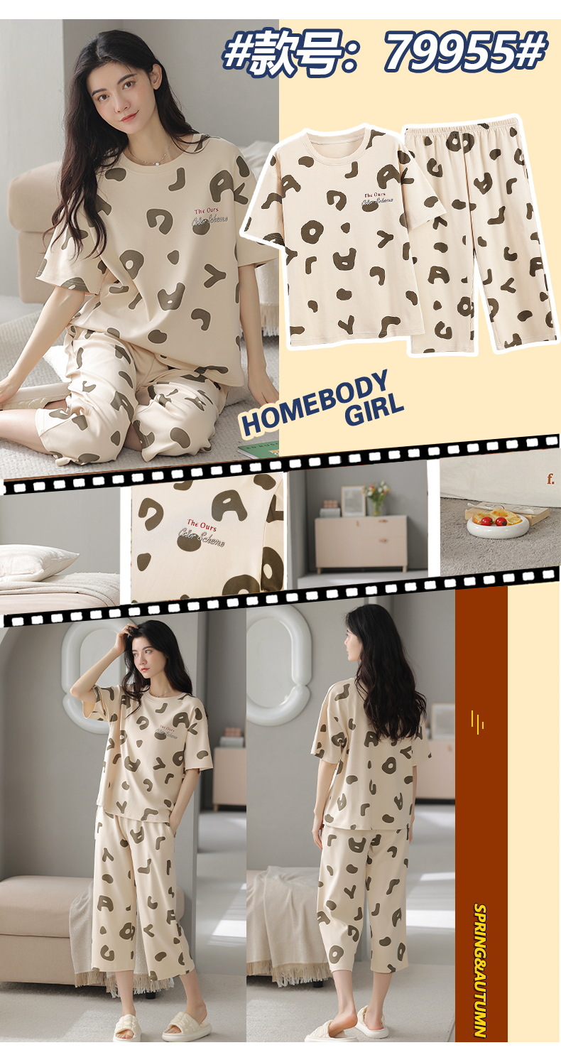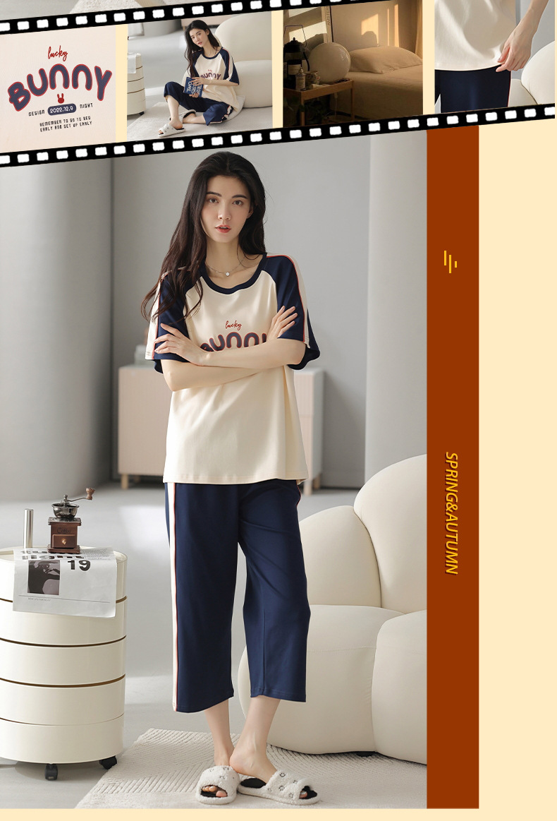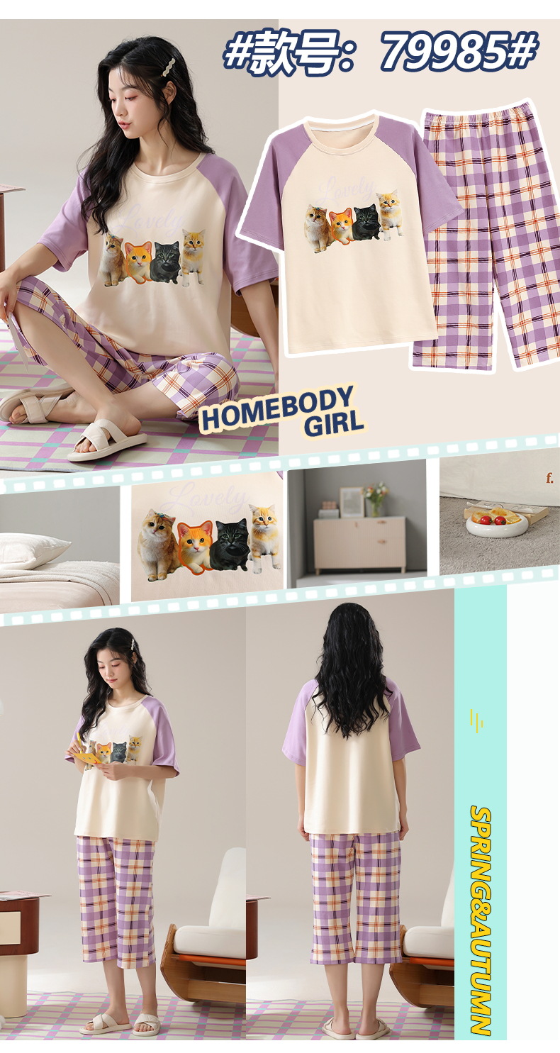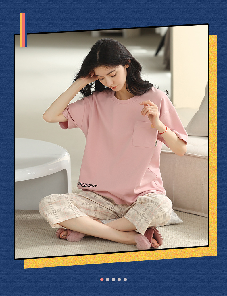 잠옷 여성 여름 코튼 새 여름 반팔 자른 바지 둥근 목 바깥 쪽 면화 홈 의류 세트 입고스토어 가기