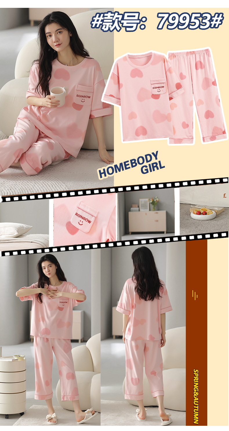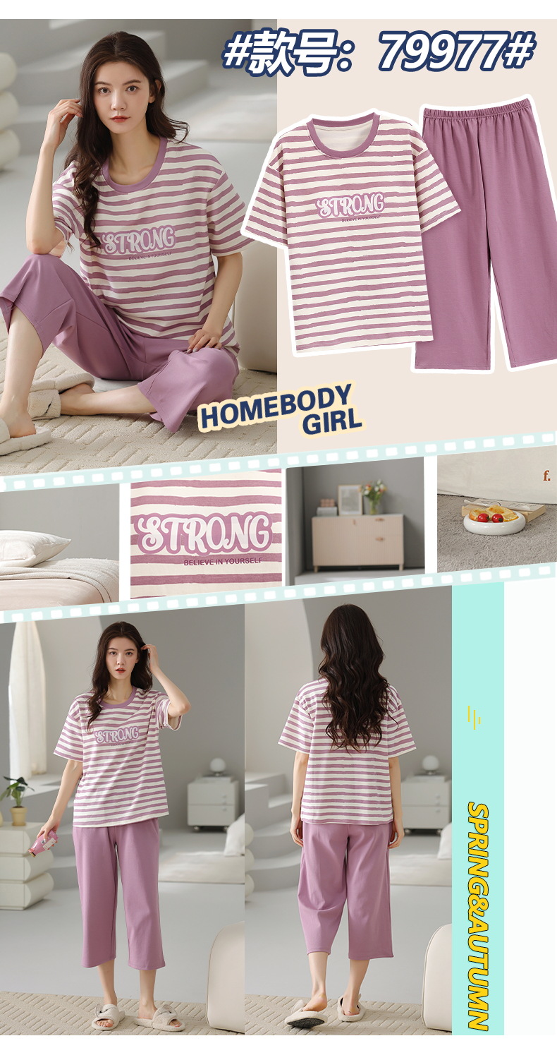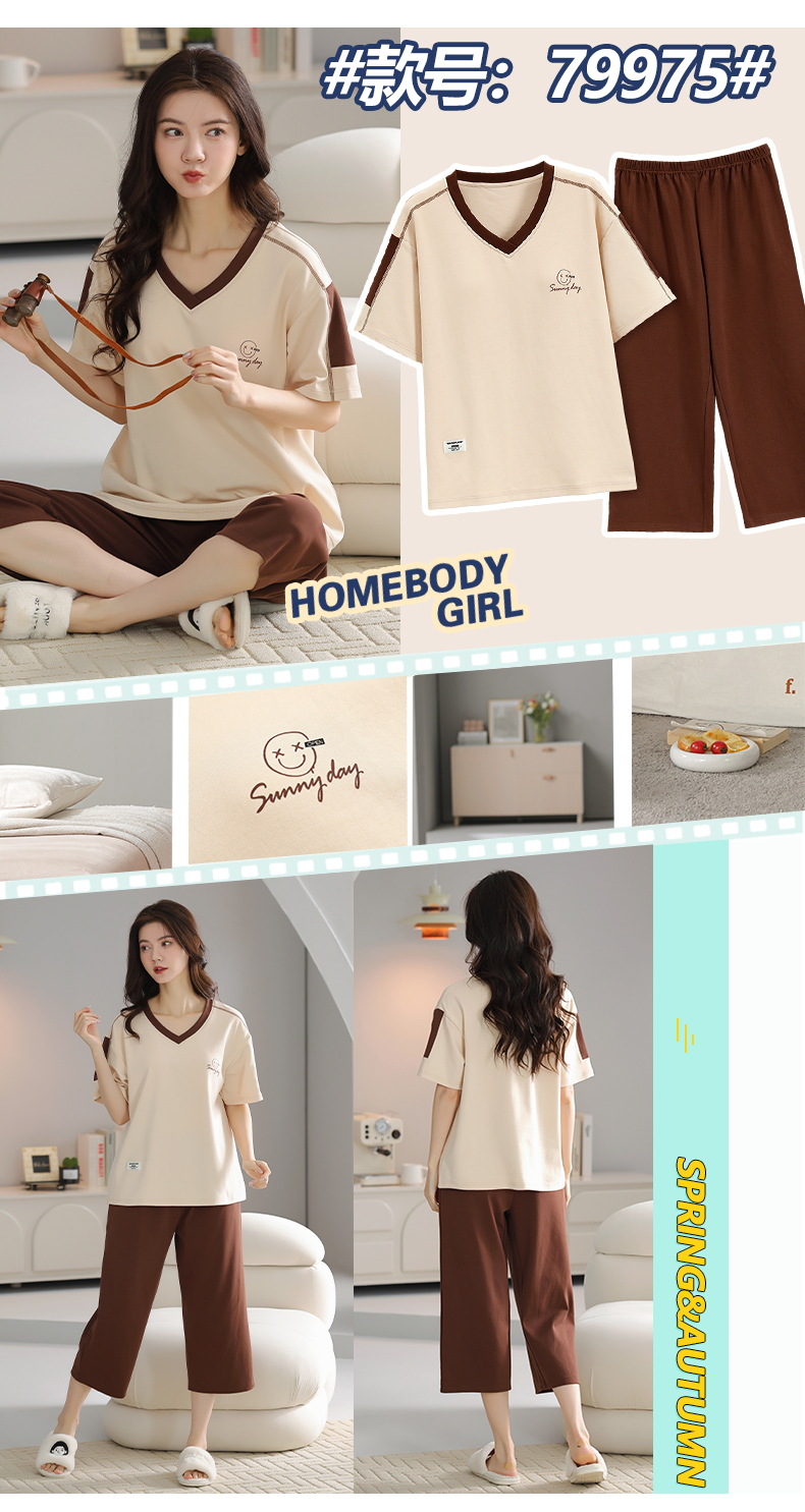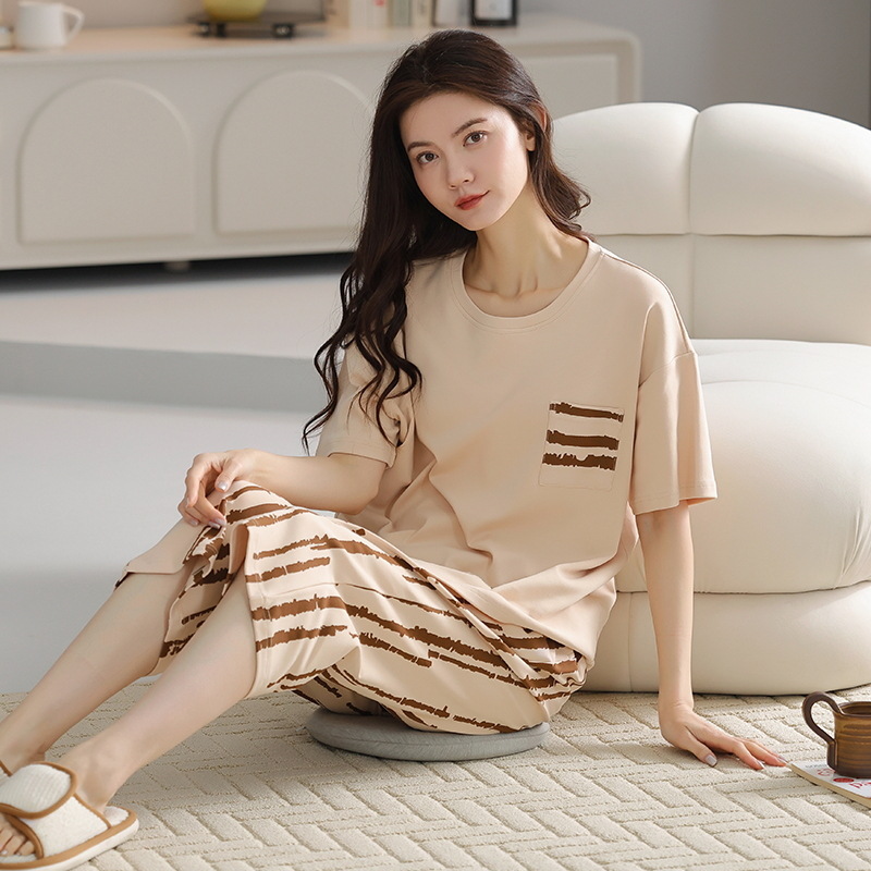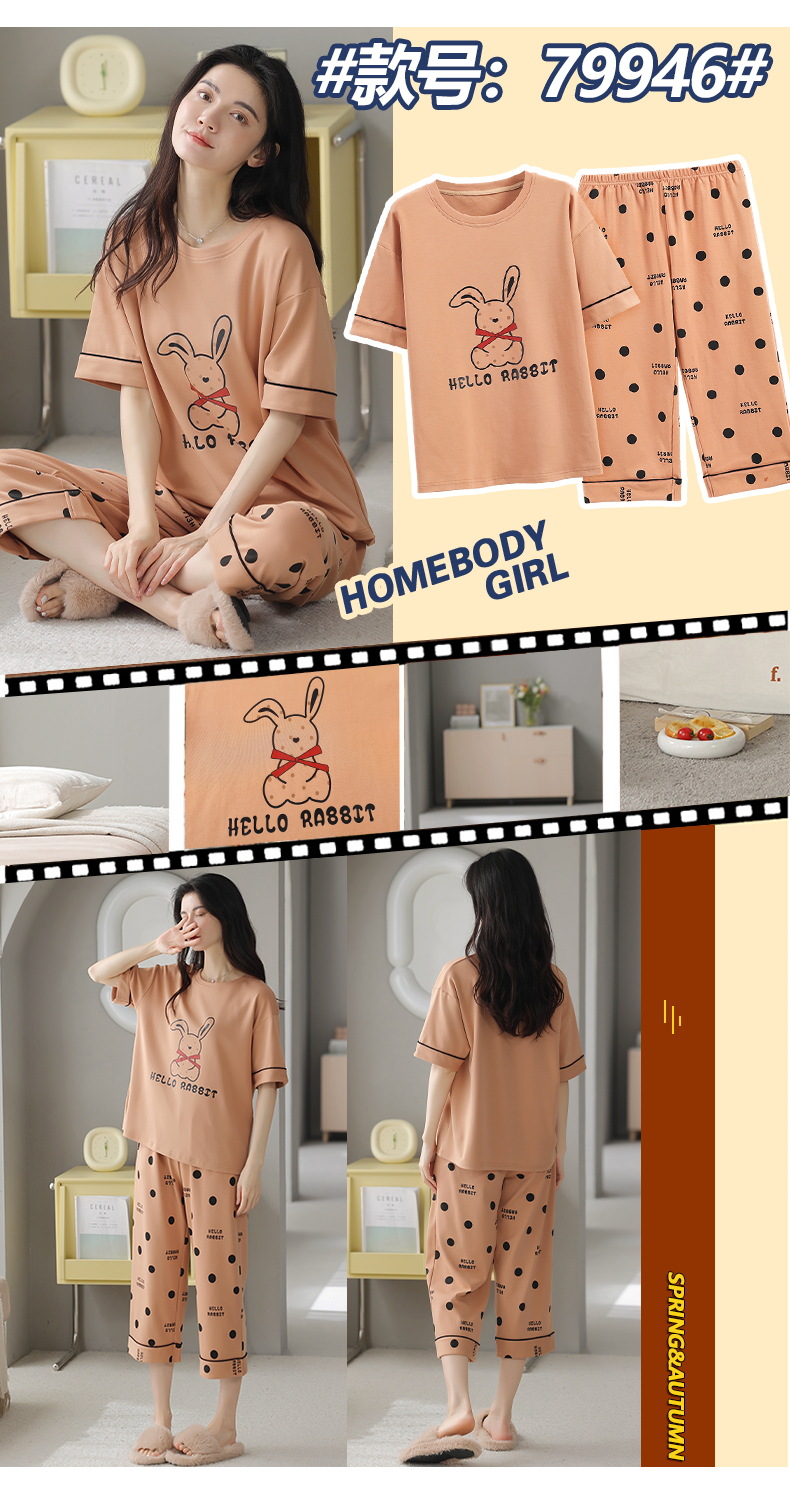 잠옷 여성 여름 코튼 새 여름 반팔 자른 바지 둥근 목 바깥 쪽 면화 홈 의류 세트 입고스토어 가기