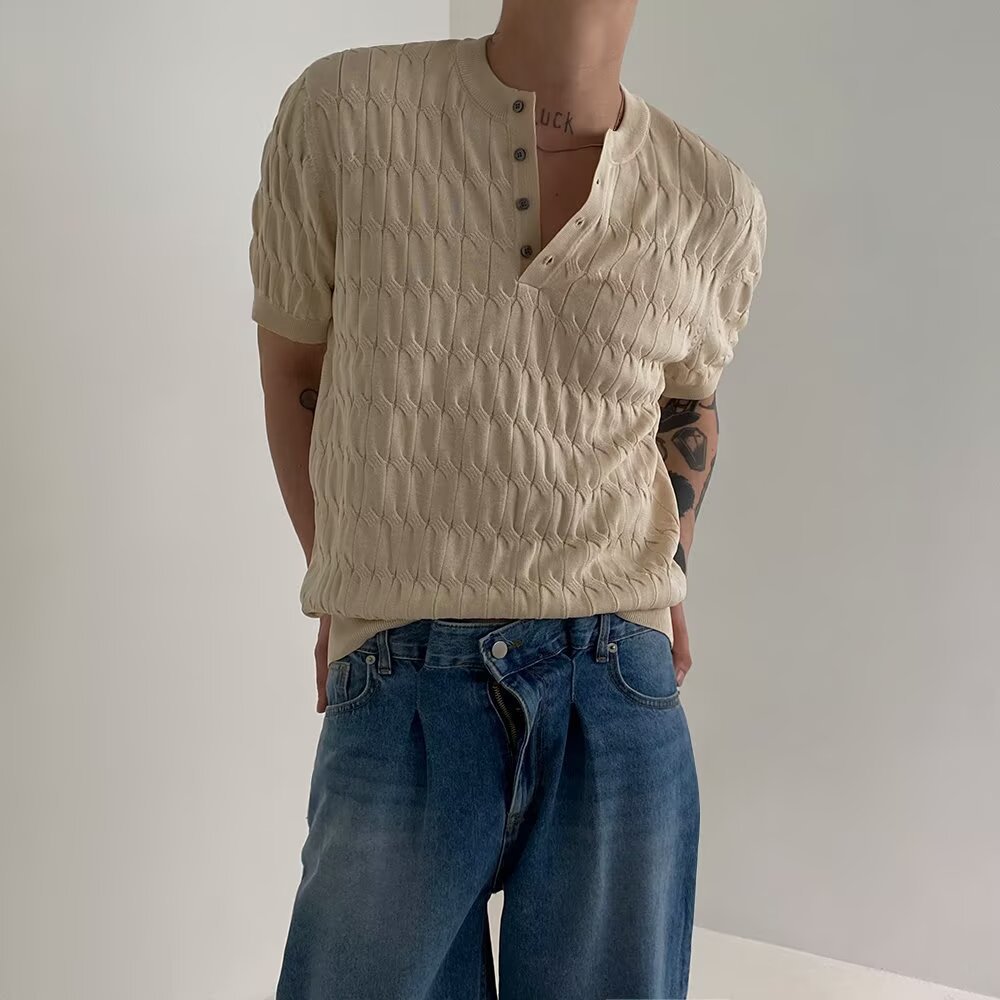 2025 니트 반팔 티셔츠 남성용 봄과 가을 라운드 넥 루즈 탑 일본식 솔리드 컬러 캐주얼 소프트 왁스 남성복