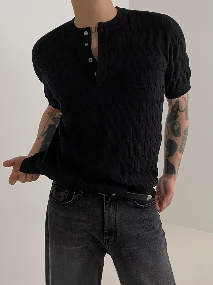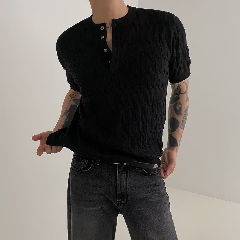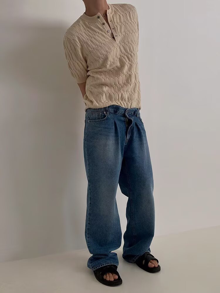 2025 니트 반팔 티셔츠 남성용 봄과 가을 라운드 넥 루즈 탑 일본식 솔리드 컬러 캐주얼 소프트 왁스 남성복스토어 가기