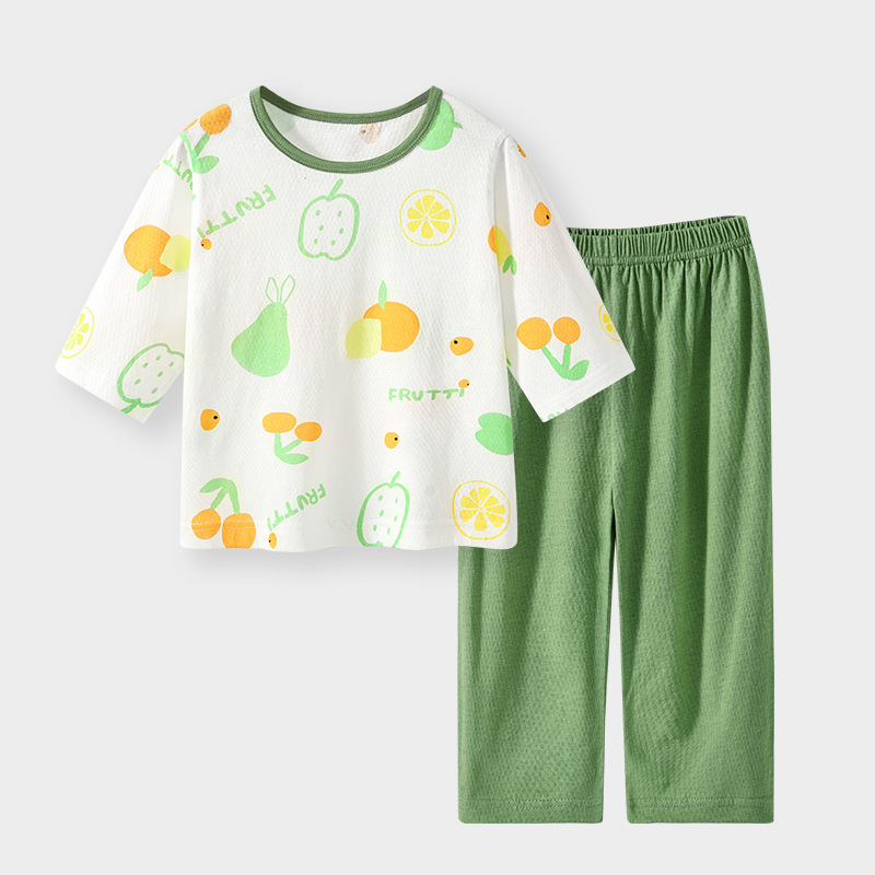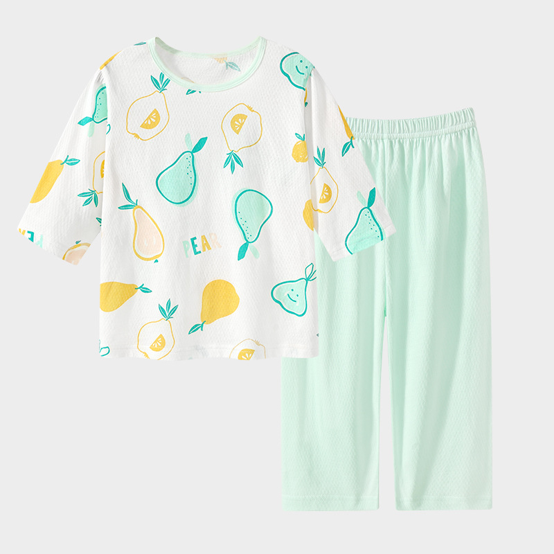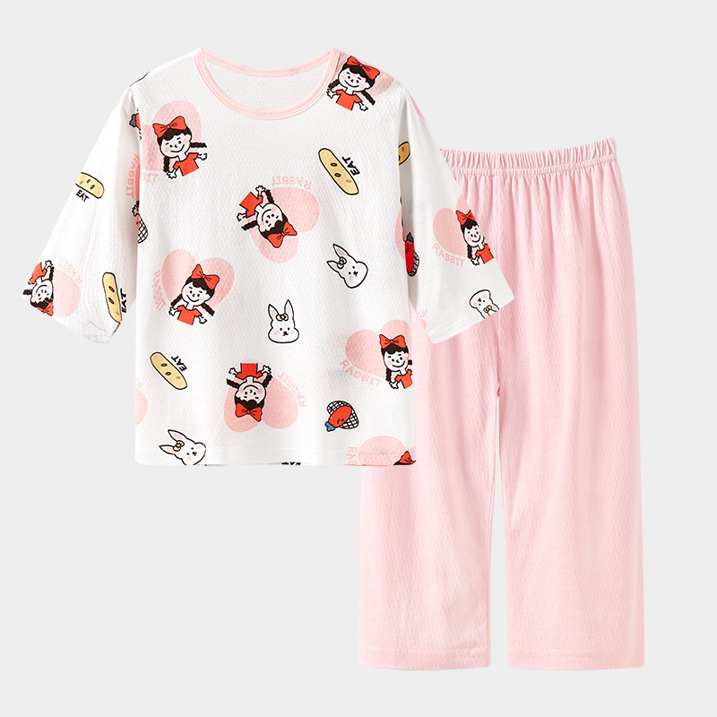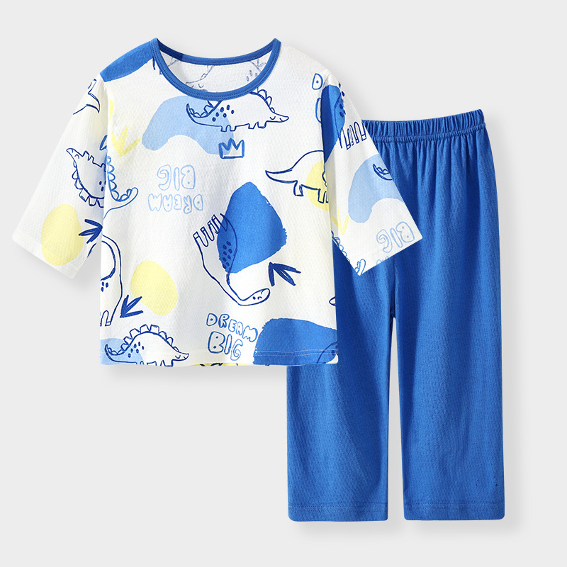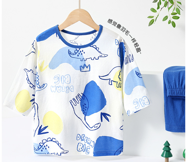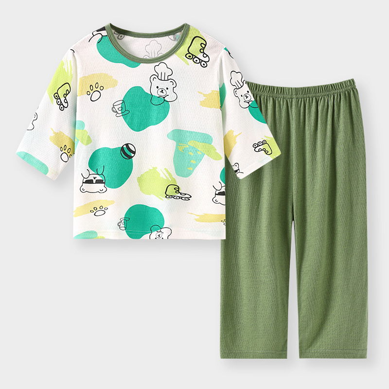 실크 새 봄과 여름 순수한면 파자마 어린이 7 점 소매 경량 통기성 홈 의류 세트 소년과 소녀를위한 에어컨 옷